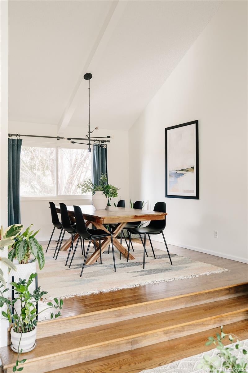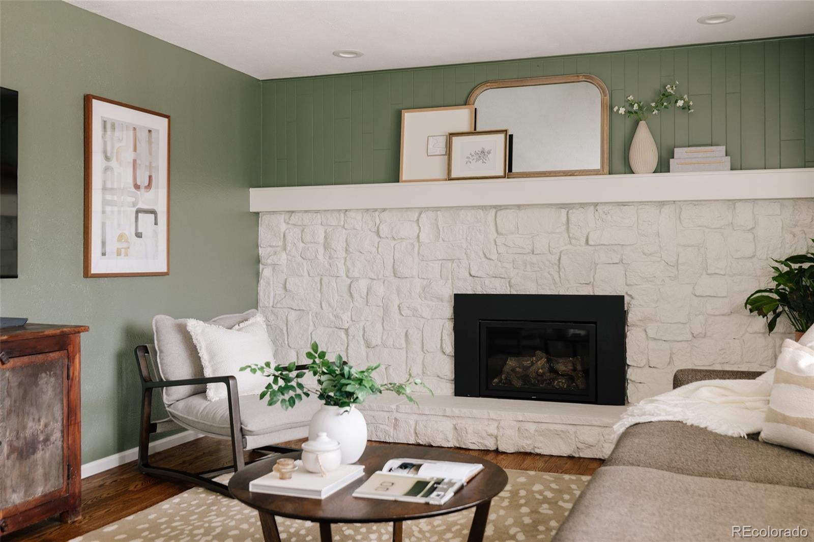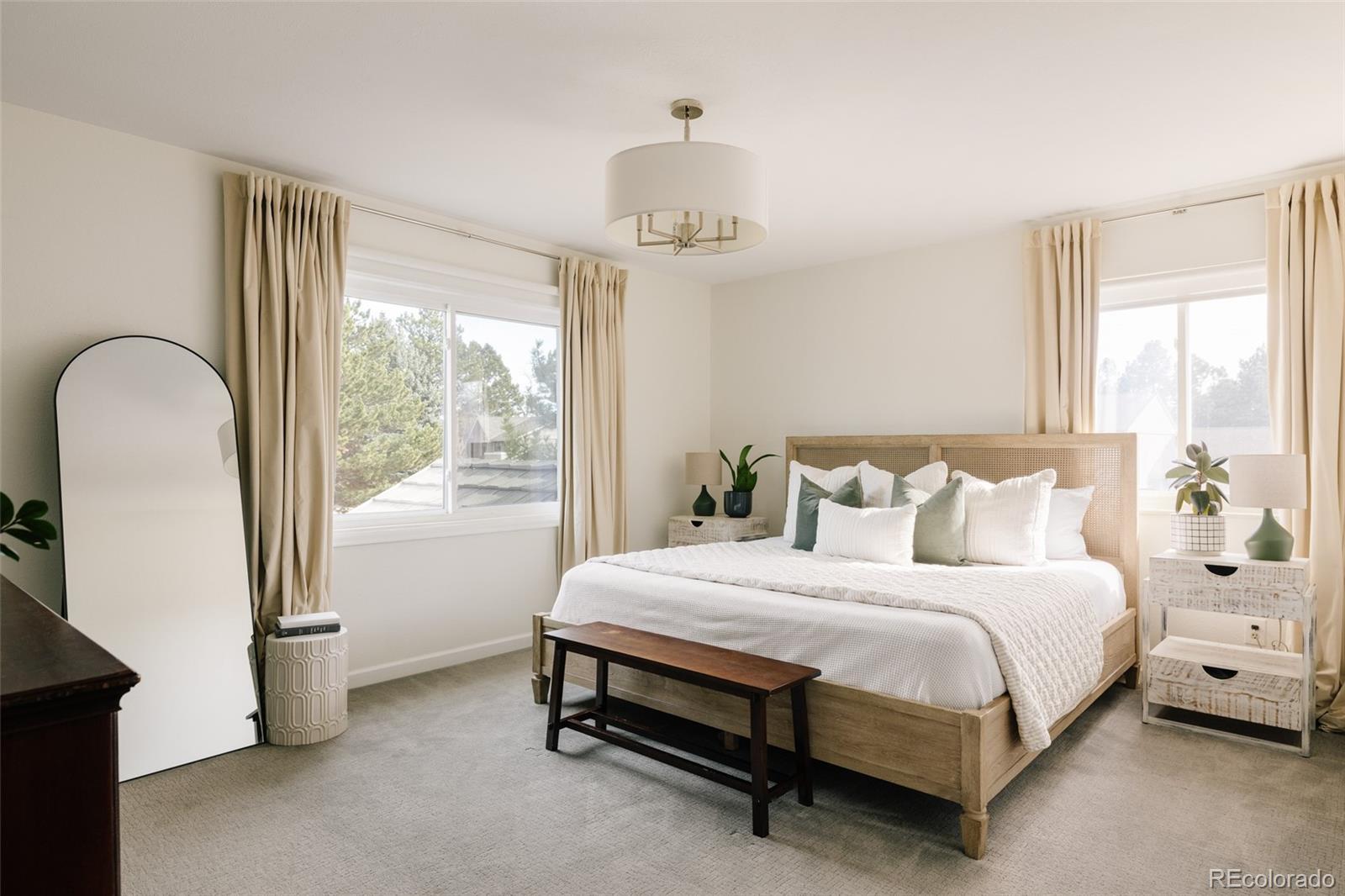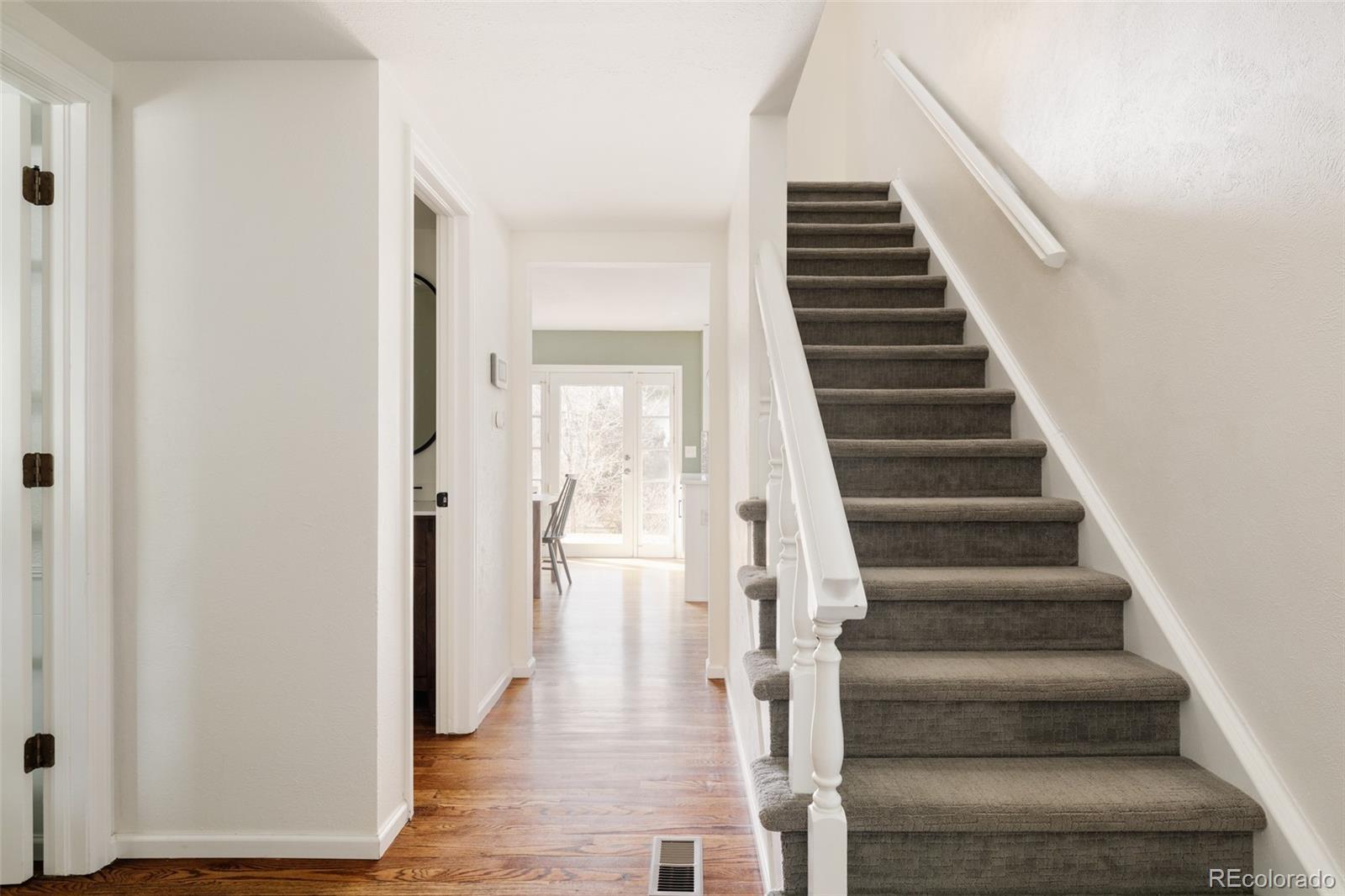 Arapahoe Lake residence. Located on a quiet street with no through traffic. A welcoming covered front porch sets the tone for a residence. Inside, vaulted ceilings accented with architectural beams create an airy & elevated first impression. To the right of the foyer, a beautifully appointed formal sitting room provides an inviting space to gather & relax. This room steps seamlessly into the formal dining area, anchored by a striking sputnik chandelier that creates an elegant backdrop for dinners & celebrations. Just beyond the entry, the home opens into the main living area where thoughtful design meets everyday functionality. The remodeled kitchen is the heart of the home, with white shaker cabinetry, quartz countertops, a designer backsplash, custom lighting & upgraded appliances including a gas range. The kitchen flows naturally into the eat-in dining area, enhanced by a built-in dry bar with wine fridge. Adjacent to the kitchen, the main living room is centered around a gas fireplace framed by a dramatic stone surround & mantle. The eat-in dining area opens directly to the expansive backyard, ideal for indoor-outdoor living. Enjoy a pergola-covered patio & a yard backing to open space & greenbelt with mature trees & access to scenic walking paths. The main level features refinished hardwood floors throughout, a custom mudroom with built-in cabinetry & a convenient powder bath. Upstairs offers 4 beds & 2 baths, including a serene primary suite with walk-in closet & a fully remodeled spa-like bath with dual-sink vanity, quartz counters, floor-to-ceiling subway tile, updated lighting, & a glass-enclosed shower. All upstairs carpet is new. The finished basement adds flexible living space for media, guests, or fitness. Major upgrades include newer HVAC, electrical panel, water heater, fresh exterior paint, electric fence & front-facing windows. Enjoy walkable access to the neighborhood pool, tennis & pickleball courts, parks, greenbelt trails, top-rated schools!