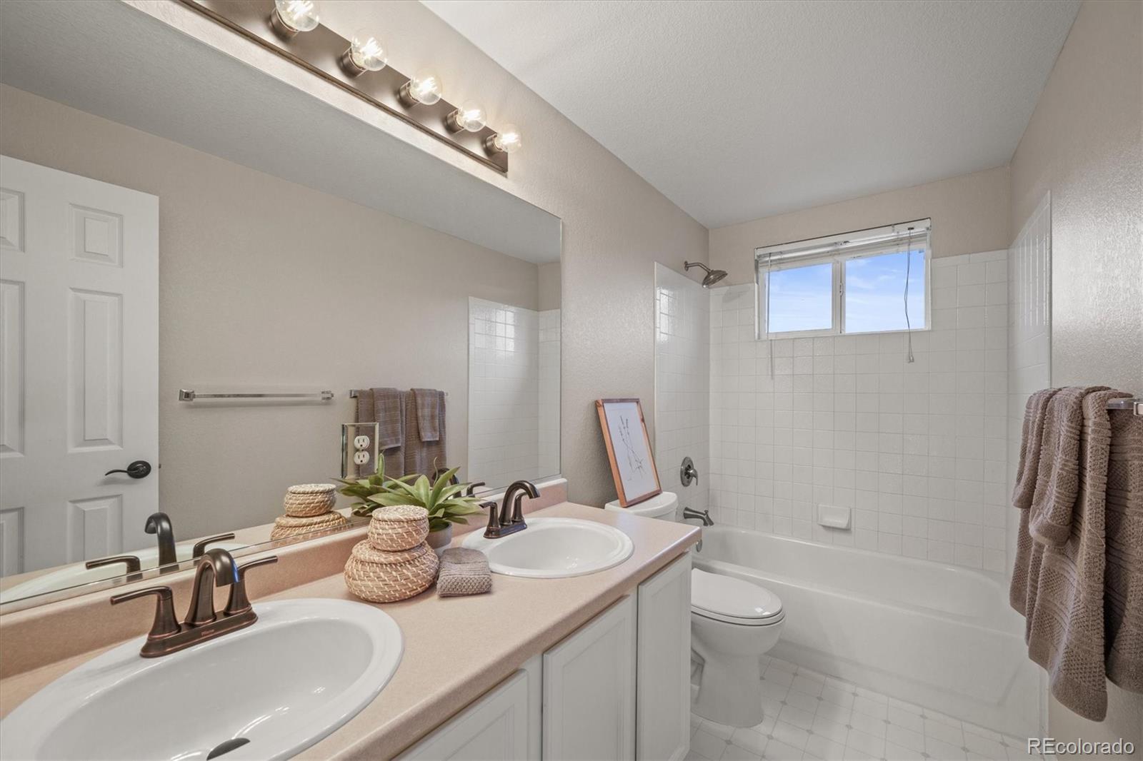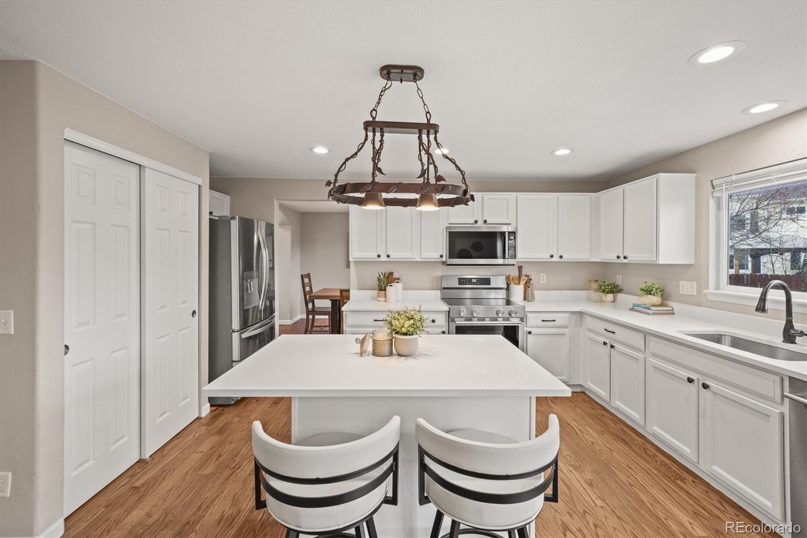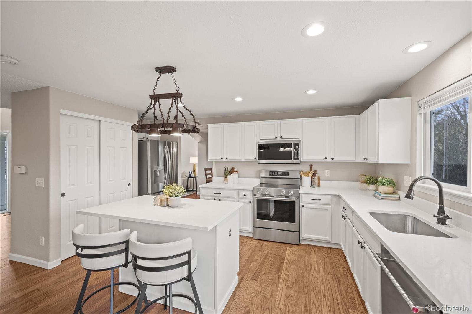 This beautifully updated 5 Bedroom, 4 Bathroom home is located in Canterberry Crossings, a sought-after master-planned community near Black Bear Golf Club, a premier Parker golf course, plus exceptional neighborhood amenities including a pool, tennis and trails. This gorgeous home is situated on a serene corner lot that sides to an open area for enhanced privacy. The interior has been thoughtfully updated throughout, showcasing a newly remodeled kitchen with breakfast nook and new stainless steel appliances, quartz countertops, and a center island ideal for both everyday living and entertaining. The spacious primary suite is a true retreat, complete with a luxurious five-piece bath. Cozy family room with gas fireplace. Finished basement featuring a Rec/Media Room, plus a bedroom and a ¾ bath. Recent improvements include new interior and exterior paint, new carpet, refinished oak hardwood floors, updated light fixtures, a new garage door and smart opener, and a new water heater. The home also benefits from newer roof shingles, providing added peace of mind. With its extensive upgrades, functional layout, and prime location within the community, this residence offers a turnkey opportunity for refined and comfortable living. This is truly the dream home you have been looking for!