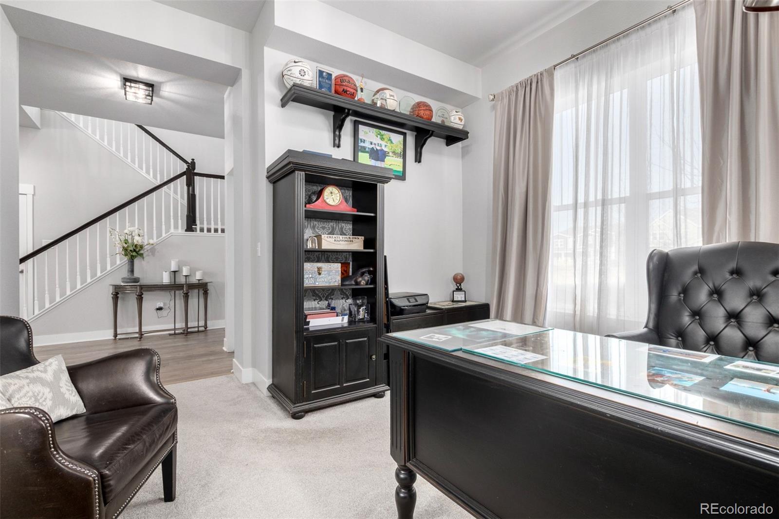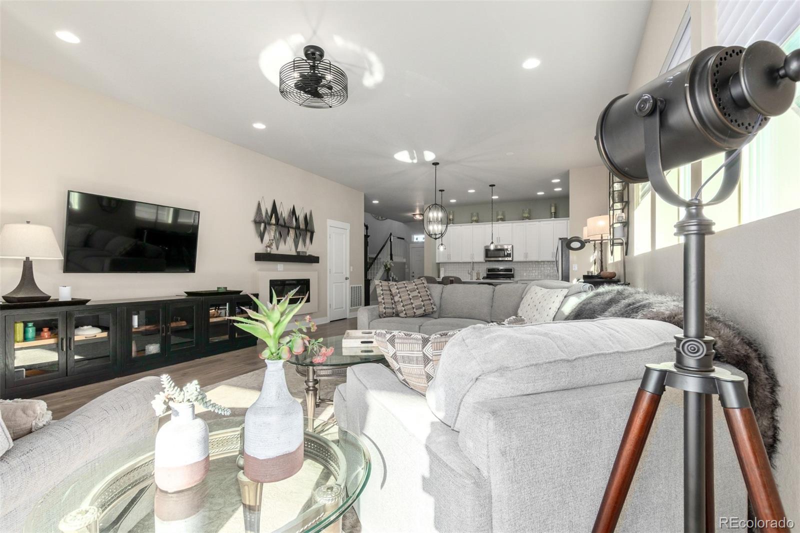 Prepare to fall head over heels! This breathtaking two-story masterpiece in the award-winning Painted Prairie community sits proudly across from vibrant Periwinkle Park, offering front-row views of playgrounds, green spaces, & endless family adventures. From the instant you pull up, the irresistible curb appeal captivates: durable concrete siding that’s virtually maintenance-free & built to withstand Colorado’s hail & harsh weather, elegant stone cladding, a welcoming covered front porch perfect for morning coffee while watching the park come alive, & that rare park-front magic. Step inside & feel the wow—soaring ceilings & sunlight flood the open-concept haven, where light-toned engineered wood floors gleam under recessed lighting and chic modern fixtures. The heart-pounding living room, with its sleek recessed electric fireplace, begs for cozy nights & lively gatherings, flowing effortlessly to the backyard oasis. The showstopping white gourmet kitchen will steal your breath: expansive shaker cabinetry, gleaming quartz counters, intricate parquet mosaic tile backsplash, premium stainless steel appliances, & a massive island w/ breakfast bar—ideal for culinary creations & casual conversations. Main level versatility shines with a bright den (perfect home office or guest retreat) & a convenient powder room. Ascend to plush-carpeted luxury upstairs: a sprawling loft for movie marathons or play, generous secondary bedrooms w/ walk-in closets & a primary suite that's pure serenity—dual granite vanity, oversized step-in shower, & enormous walk-in closet. Unwind on the covered back patio, sipping your favorite drink as the sun sets over your private escape. In Painted Prairie's vibrant, master-planned paradise—with trails, gardens, events, & community spirit—this move-in-ready gem isn't just a house; it's the lifestyle you've been craving. See it in person to believe the magic—schedule your private tour today before it's gone! *ACCEPTING OFFERS UNTIL 1/19 @ Noon *
