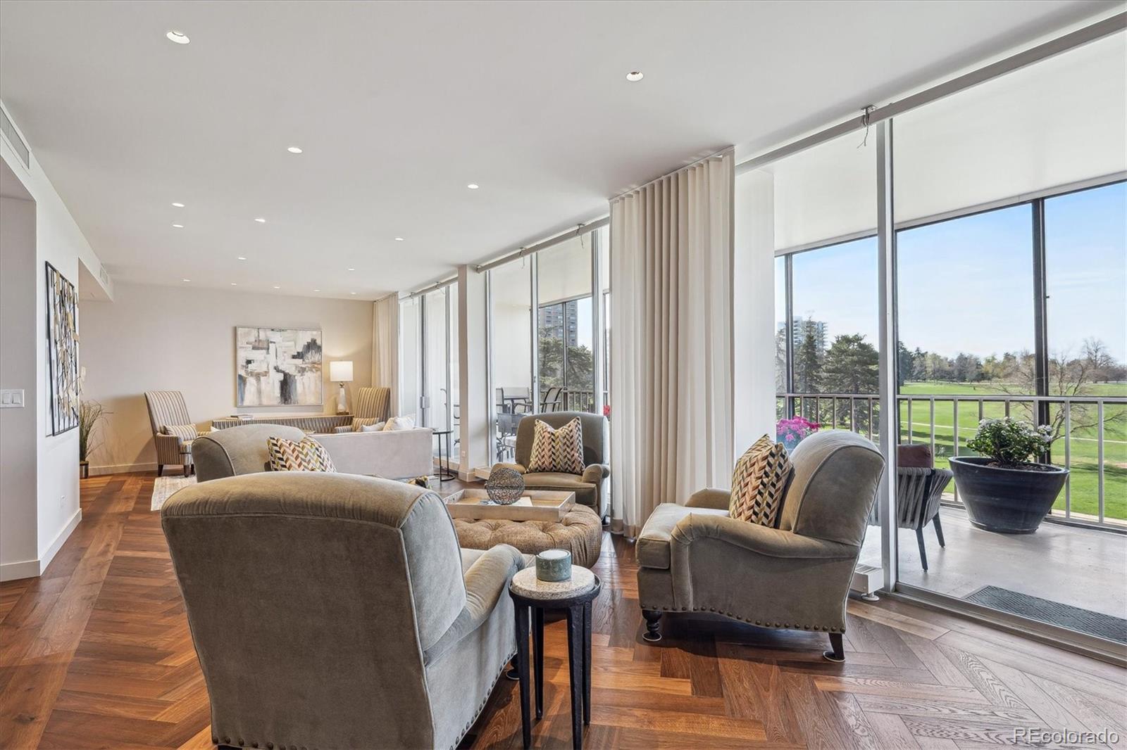 Chic urban design is evident in this fully remodeled residence overlooking Cheesman Park, in Denver's iconic One Cheesman Place, designed by renowned architect Charles Sink. This luxury building, completed in 1969 is celebrated for it's innovative design and enduring elegance. Charles Sink's design philosophy is evident in the building’s clean lines and expansive floor-to-ceiling glass windows and large balconies offering unsurpassed views of Cheesman Park. The expansive living/dining area offers unlimited possibilities for entertaining and daily living with plenty of room for multiple seating areas. The newer kitchen is open to the living and dining area and includes a built-in refrigerator, double ovens, a rare gas cooktop and beverage refrigerator. The luxurious primary suite includes a comfortable bedroom plus a "spa" style 5-piece bath with separate tub and shower and dual vanity plus make-up counter and custom closet built-ins. A second bedroom works equally well as a den with a built-in murphy bed. Carefully curated, high end finishes include beautiful herringbone wood floors, quartz counters, designer selected fixtures and top-of-the-line appliances and custom built-ins. The full width terrace allows for seamless indoor/outdoor entertaining and offers a three-season living area to enjoy the views of historic Cheesman Park with it's 1.6 mile walking path loop. This residence includes one underground garage parking space and one storage space and additional parking for residents and guests is available at the entry level. One Cheesman Place offers an array of amenities including a seasonal swimming pool, fitness center, sauna, top floor club room, guest suites for resident's guest's use, staffed lobby and building security. Residents are committed to keeping this landmark building in top condition. Whole Foods and King Soopers are nearby along with many neighborhood restaurants and shops and Cherry Creek North and downtown Denver are minutes away!