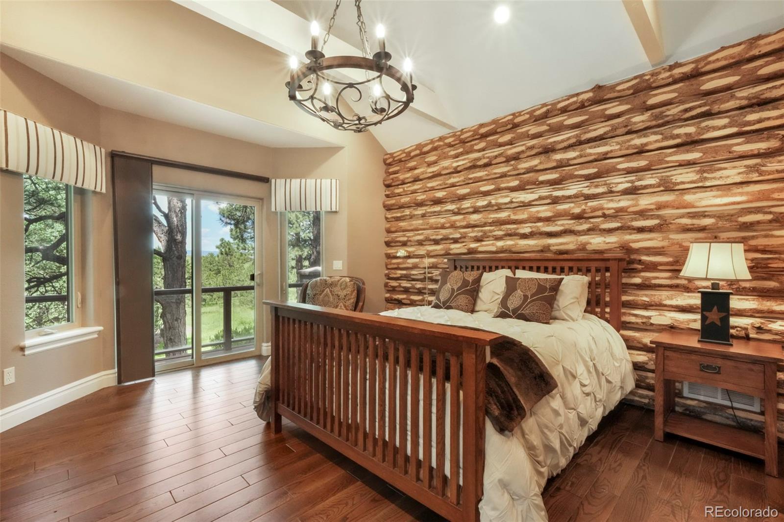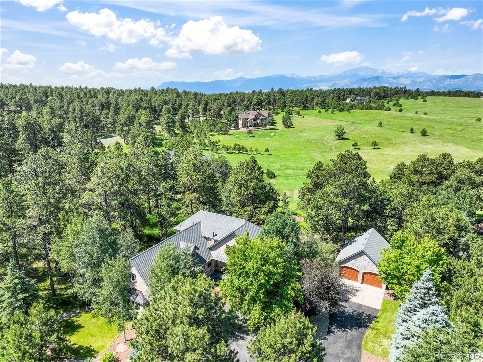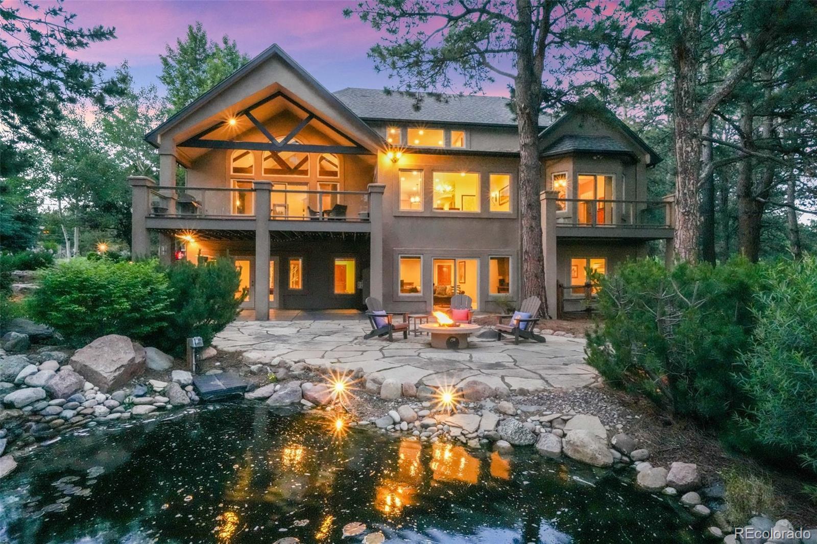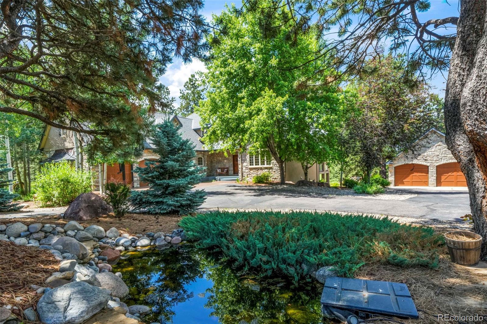 Experience exceptional main-level, ADA-friendly living in this 4-bedroom, 4-bath, 5-car mountain retreat, tucked at the end of a quiet cul-de-sac on 2.5 acres. This stunning stone and stucco estate offers breathtaking Front Range and Pikes Peak views, impeccable landscaping, and dual ponds with cascading waterfalls. Inspired by Beaver Creek ski homes, it has been meticulously remodeled with expert craftsmanship and high-end finishes. Inside, vaulted ceilings, exposed beams, pine log walls, and custom 5-inch Black Heritage oak flooring create a warm, inviting atmosphere, anchored by a striking stone fireplace with built-ins. The gourmet kitchen is a chef’s dream with solid wood cabinetry, newly refinished lowers, granite island, custom tile backsplash, prep sink, pantry, double ovens, gas cooktop with vent hood, Bosch dishwasher, and a brand-new Whirlpool refrigerator. Attached is a casual dining areas open to a composite deck with custom glass railings, gas line for a fire pit and grill, and serene views over the grounds. The spacious main-level primary suite features a private balcony with sweeping mountain views, a spa-style zero-entry shower with waterfall and rain head, a double vanity with full tile wall, and a walk-in closet with custom barn doors. A 642 square foot upper-level in-law suite offers a kitchenette, bedroom, full bath, and living room filled with natural light—ideal for guests or extended family. The walkout basement includes two bedrooms with walk-in closets, a full bath, a large family room with fireplace, rec/game room, wet bar, gym area or non-conforming bedroom, and direct backyard access. Outdoor living is a true oasis with a 23x14 covered patio, tree-top deck, mature maples, blue spruce, 40+ granite boulders, and abundant wildlife. Additional highlights include a heated driveway, backup generator, private well with 15-zone irrigation, and an attached 3-car garage plus an detached 2-car, all with epoxy floors and smart doors.