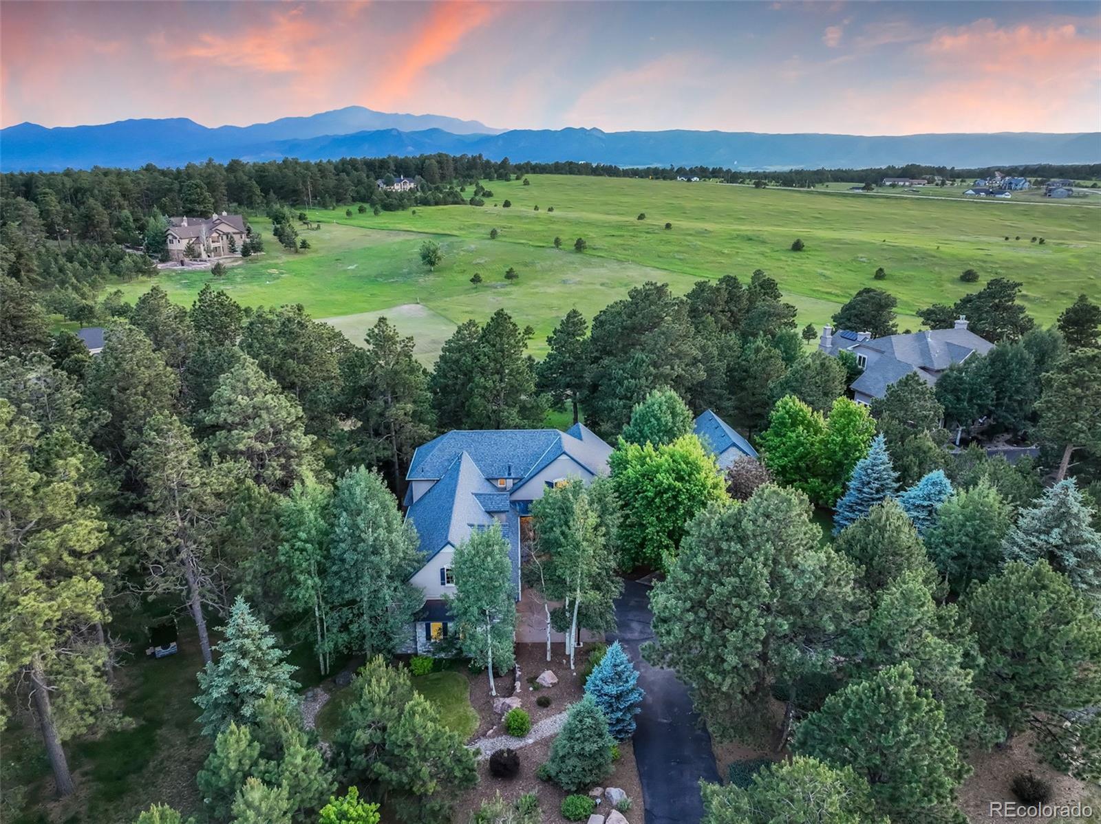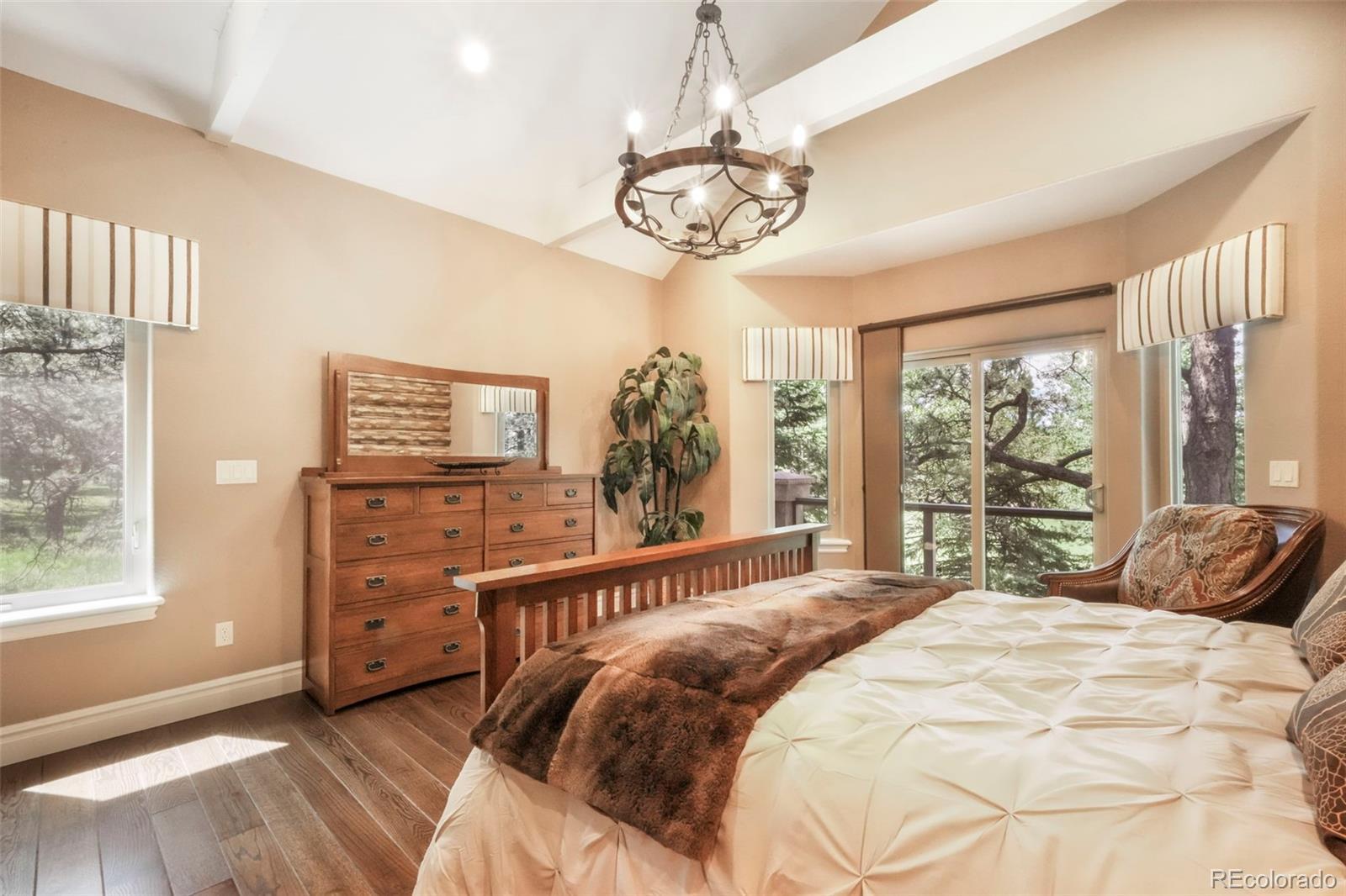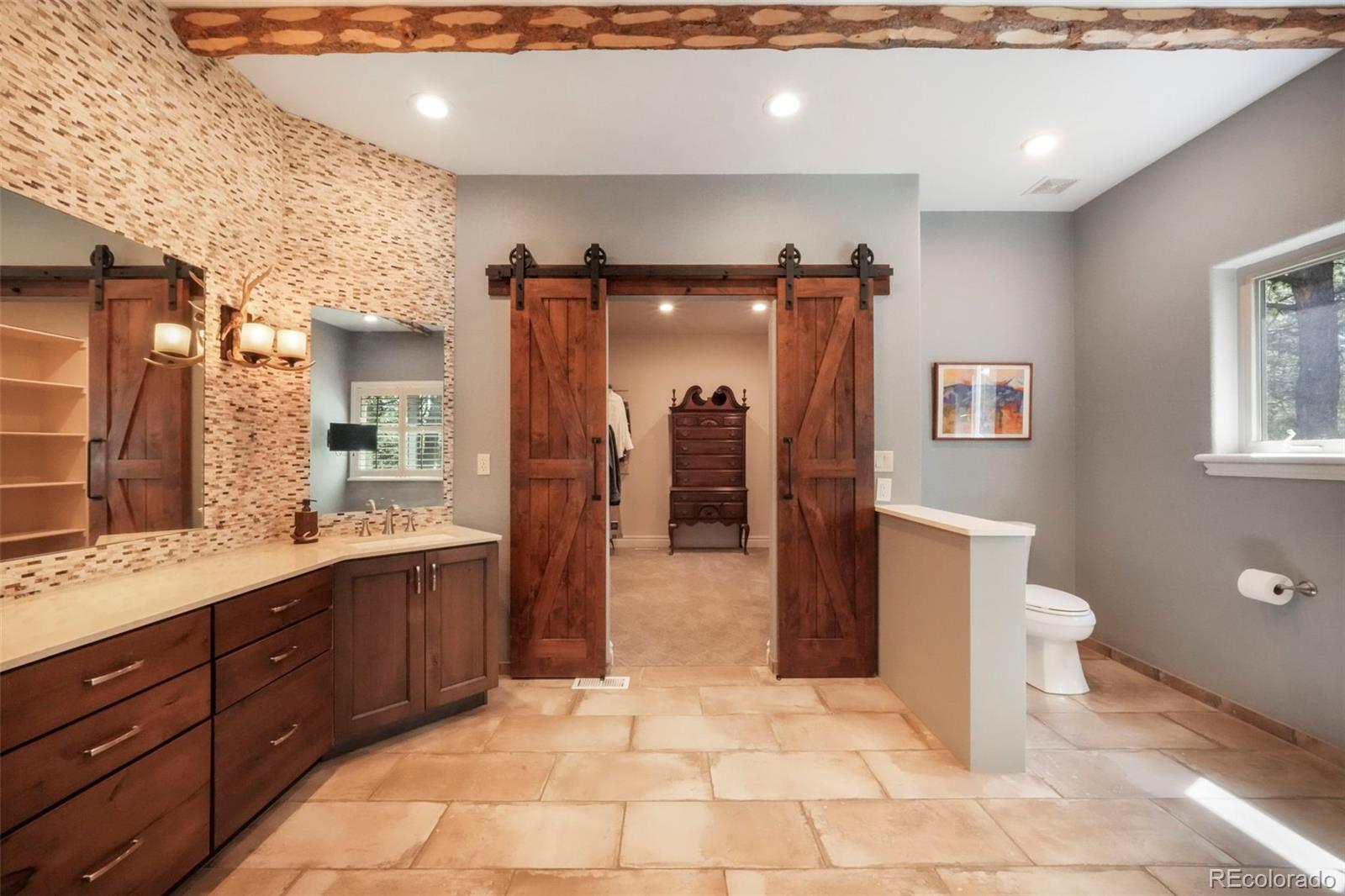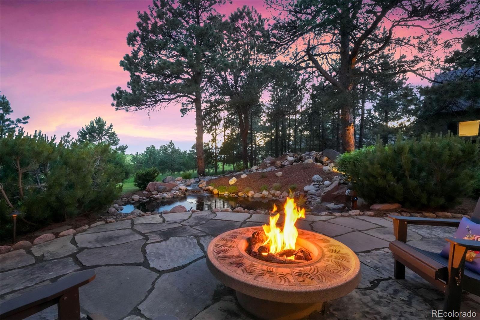 Experience exceptional main-level, ADA-friendly living in this 4-bedroom, 4-bath, 5-car mountain retreat, tucked at the end of a quiet cul-de-sac on 2.5 acres. This stunning stone and stucco estate offers breathtaking Front Range and Pikes Peak views, impeccable landscaping, and dual ponds with cascading waterfalls. Inspired by Beaver Creek ski homes, it has been meticulously remodeled with expert craftsmanship and high-end finishes. Inside, vaulted ceilings, exposed beams, pine log walls, and custom 5-inch Black Heritage oak flooring create a warm, inviting atmosphere, anchored by a striking stone fireplace with built-ins. The gourmet kitchen is a chef’s dream with solid wood cabinetry, newly refinished lowers, granite island, custom tile backsplash, prep sink, pantry, double ovens, gas cooktop with vent hood, Bosch dishwasher, and a brand-new Whirlpool refrigerator. Attached is a casual dining areas open to a composite deck with custom glass railings, gas line for a fire pit and grill, and serene views over the grounds. The spacious main-level primary suite features a private balcony with sweeping mountain views, a spa-style zero-entry shower with waterfall and rain head, a double vanity with full tile wall, and a walk-in closet with custom barn doors. A 642 square foot upper-level in-law suite offers a kitchenette, bedroom, full bath, and living room filled with natural light—ideal for guests or extended family. The walkout basement includes two bedrooms with walk-in closets, a full bath, a large family room with fireplace, rec/game room, wet bar, gym area or non-conforming bedroom, and direct backyard access. Outdoor living is a true oasis with a 23x14 covered patio, tree-top deck, mature maples, blue spruce, 40+ granite boulders, and abundant wildlife. Additional highlights include a heated driveway, backup generator, private well with 15-zone irrigation, and an attached 3-car garage plus an detached 2-car, all with epoxy floors and smart doors.
