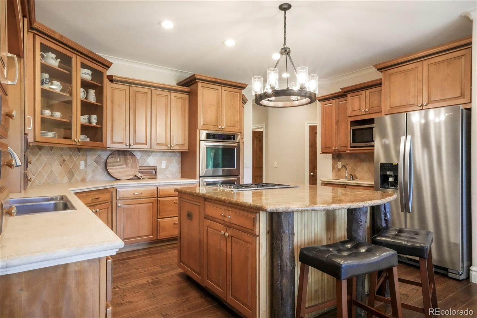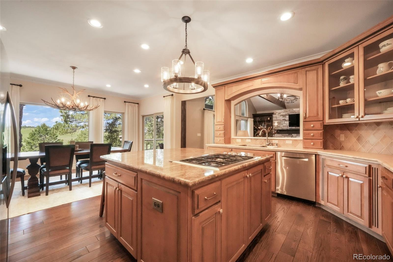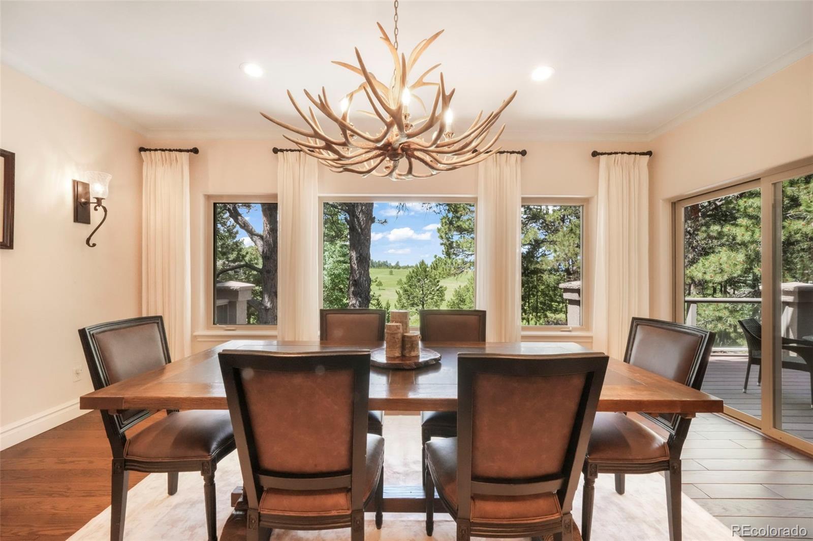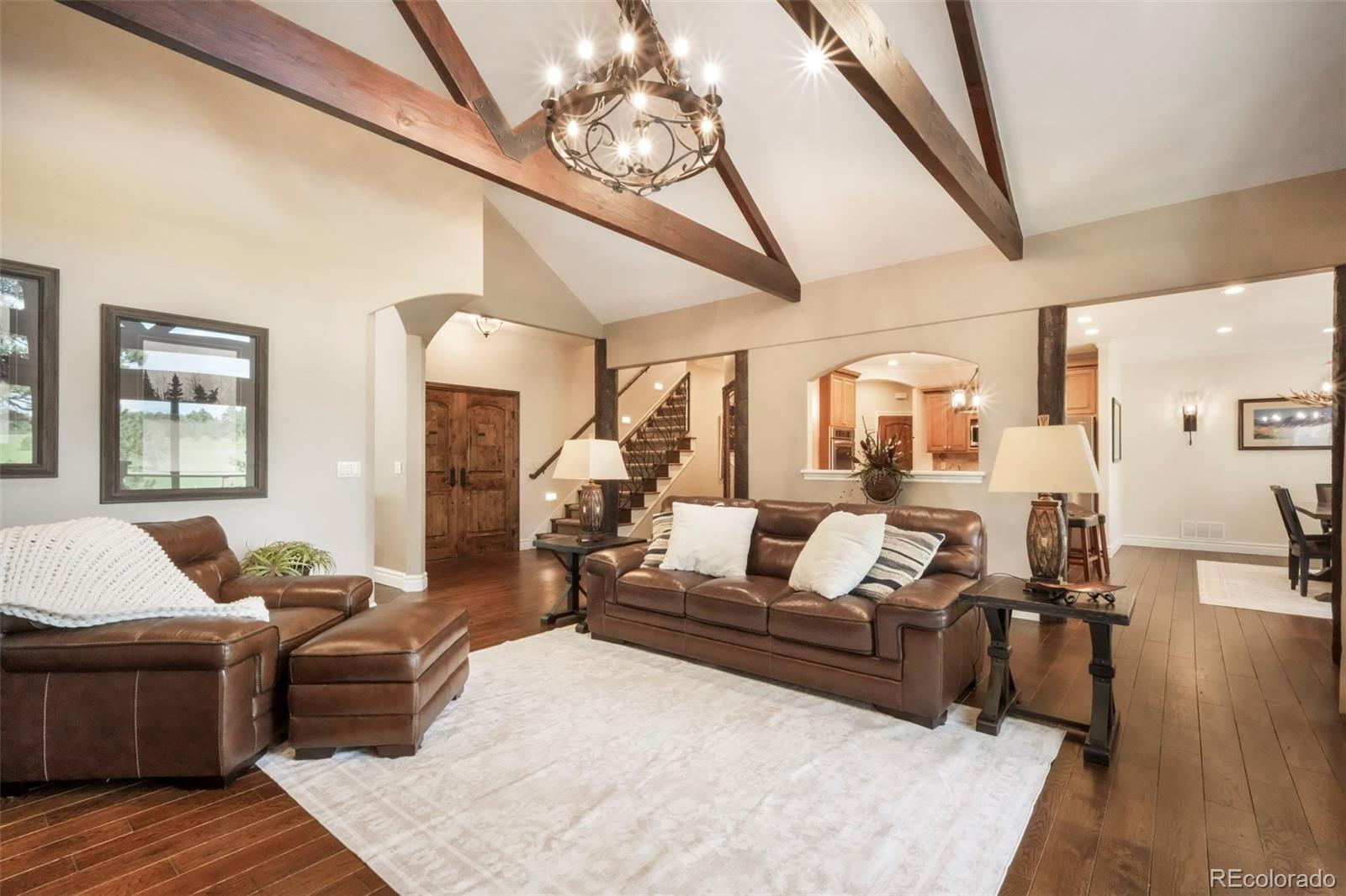Experience exceptional main-level, ADA-friendly living in this 4-bedroom, 4-bath, 5-car mountain retreat, tucked at the end of a quiet cul-de-sac on 2.5 acres. This stunning stone and stucco estate offers breathtaking Front Range and Pikes Peak views, impeccable landscaping, and dual ponds with cascading waterfalls. Inspired by Beaver Creek ski homes, it has been meticulously remodeled with expert craftsmanship and high-end finishes. Inside, vaulted ceilings, exposed beams, pine log walls, and custom 5-inch Black Heritage oak flooring create a warm, inviting atmosphere, anchored by a striking stone fireplace with built-ins. The gourmet kitchen is a chef’s dream with solid wood cabinetry, newly refinished lowers, granite island, custom tile backsplash, prep sink, pantry, double ovens, gas cooktop with vent hood, Bosch dishwasher, and a brand-new Whirlpool refrigerator. Attached is a casual dining areas open to a composite deck with custom glass railings, gas line for a fire pit and grill, and serene views over the grounds. The spacious main-level primary suite features a private balcony with sweeping mountain views, a spa-style zero-entry shower with waterfall and rain head, a double vanity with full tile wall, and a walk-in closet with custom barn doors. A 642 square foot upper-level in-law suite offers a kitchenette, bedroom, full bath, and living room filled with natural light—ideal for guests or extended family. The walkout basement includes two bedrooms with walk-in closets, a full bath, a large family room with fireplace, rec/game room, wet bar, gym area or non-conforming bedroom, and direct backyard access. Outdoor living is a true oasis with a 23x14 covered patio, tree-top deck, mature maples, blue spruce, 40+ granite boulders, and abundant wildlife. Additional highlights include a heated driveway, backup generator, private well with 15-zone irrigation, and an attached 3-car garage plus an detached 2-car, all with epoxy floors and smart doors.