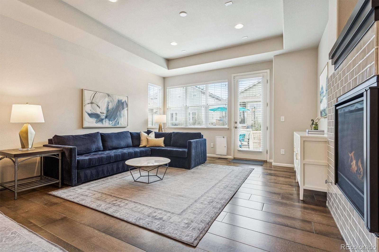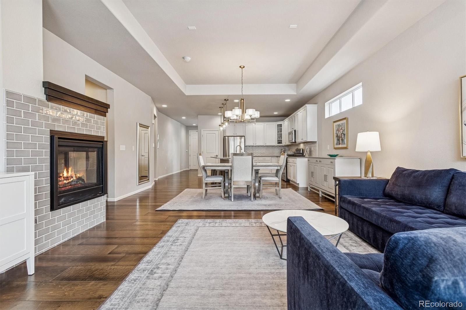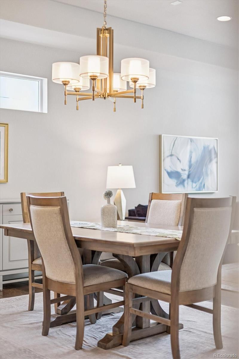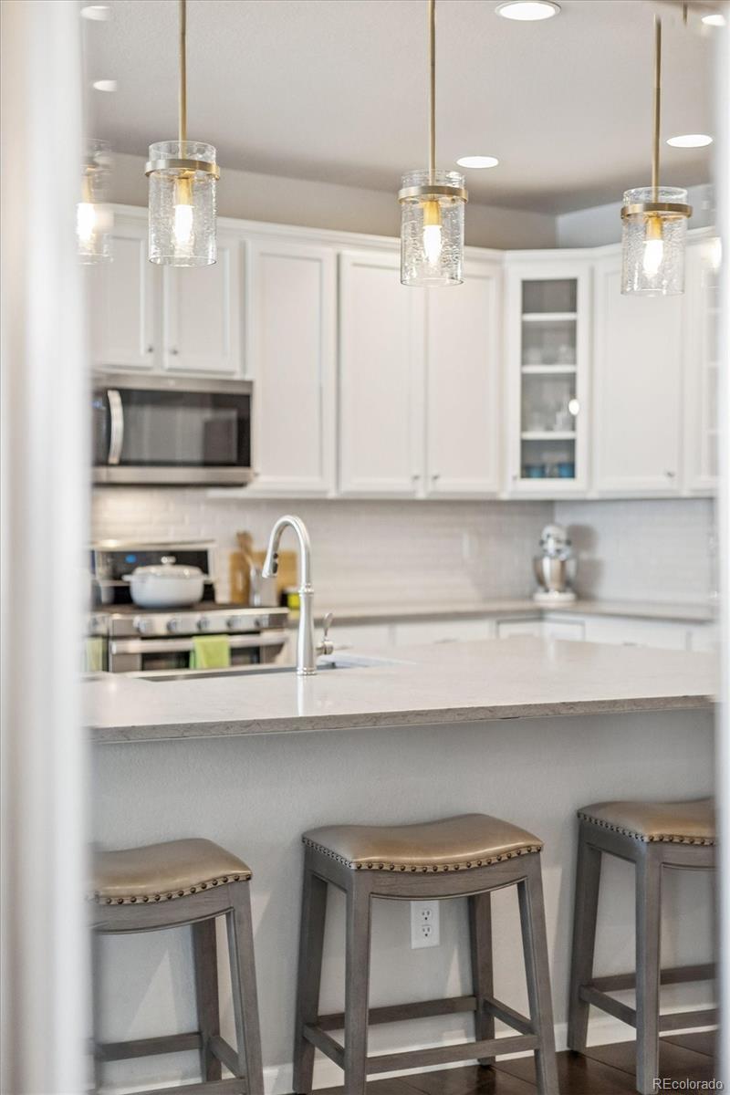This exceptional, turnkey ranch-style residence is loaded with thoughtful upgrades and has been meticulously cared for. Located in the highly sought-after Green Gables Reserve, this home blends high-level design with effortless living. Upon entry, you are greeted by striking, wide plank wood floors and an open concept layout that offers a bright, refined atmosphere. A window-lined office amplifies natural daylight and makes for an inspiring workspace. The eat-in kitchen is the heart of the home featuring a sleek quartz island, 42" cabinetry, Pottery Barn lighting, and a suite of stainless-steel appliances including a gas range oven and a newer Samsung Bespoke refrigerator. Elevated finishes continue throughout the home with soft-close drawers and quartz counters in every space. The living area is anchored by a two-sided gas fireplace that is wrapped in chic tile and complemented by a 10-foot tray ceiling that creates an airy and grand space. The main level offers three bedrooms, including a generous primary suite with a tray ceiling and a primary bath complete with dramatic tile, an oversized shower with bench seating, and a walk-in closet. An additional full bathroom on the main level adds flexibility for guests or daily living. The fully finished basement includes an expansive entertainment area, an additional bedroom with walk-in closet, and a full bathroom. There is also notable finished storage space and a dedicated gym/exercise room with waterproof LVP flooring. Enjoy energy efficient living and long-term savings with a seller owned solar system, advanced cold climate heat pump, and new furnace - all installed in late 2025. Green Gables Reserve offers a unique blend of outdoor recreation with a convenient central location. Residents take advantage of walking trails, a picturesque lake with community beach access, and a pool/hot tub with views of the foothills. All of this just a 15-minute drive from downtown Denver or an equally quick getaway to the mountains.