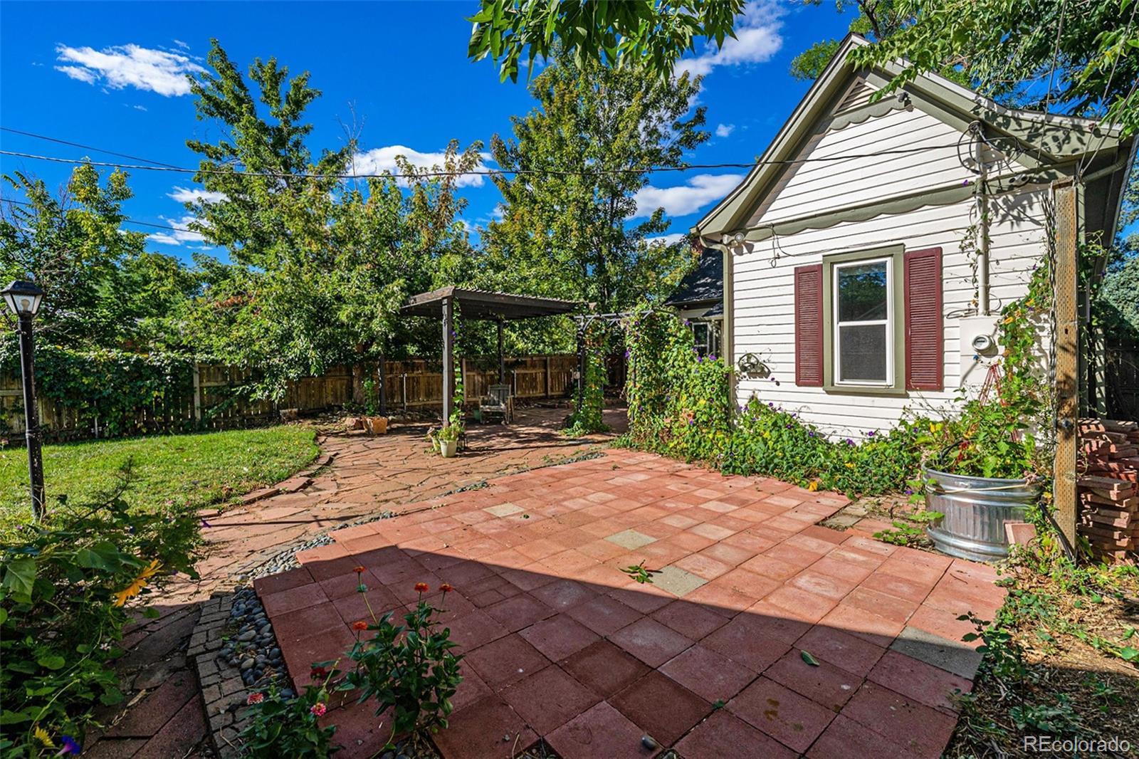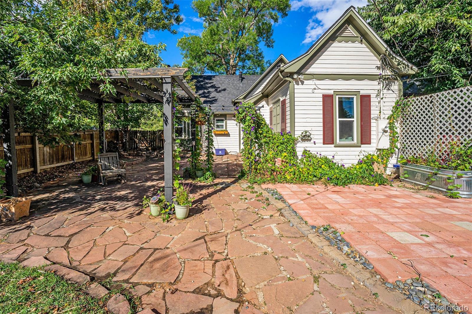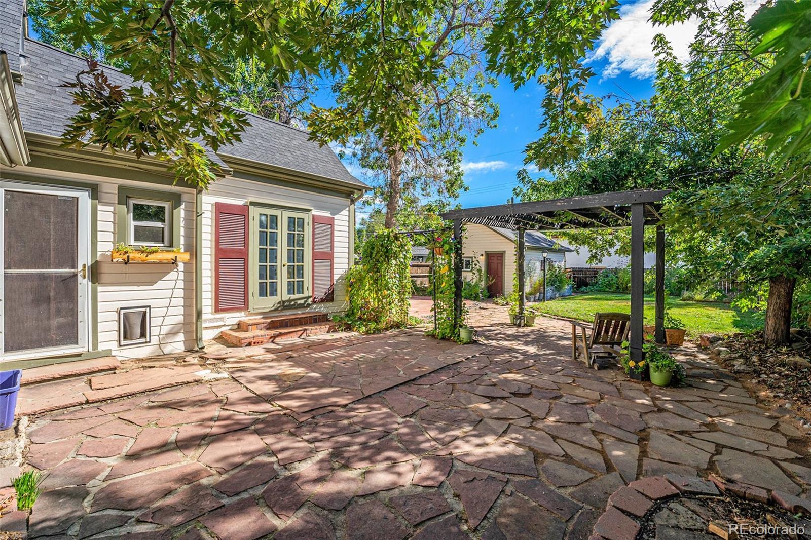 Charm abounds in this 1915 Victorian with hardwood floors, a brick fireplace, and vintage trim. The open floor plan with modern updates makes the home immediately livable, and you'll be enchanted by the incredible back yard. Step through the french doors from your bedroom out to your morning-glory draped pergola to enjoy morning coffee. Mature trees adorn the large lot that features multiple patios and gardens, and a one car garage is ready to charge your EV or to store your gear. A quick jaunt over to dining and shopping on Tennyson and Regis shops and restaurants on Lowell, both Berkeley Lake Park and Rocky Mountain Lake Park, Willis Case golf course, Regis University, and access to I-70 (in just minutes) makes this location a true find. The oversized lot offers good potential for construction of a larger garage and/or an accessory dwelling unit (ADU).
