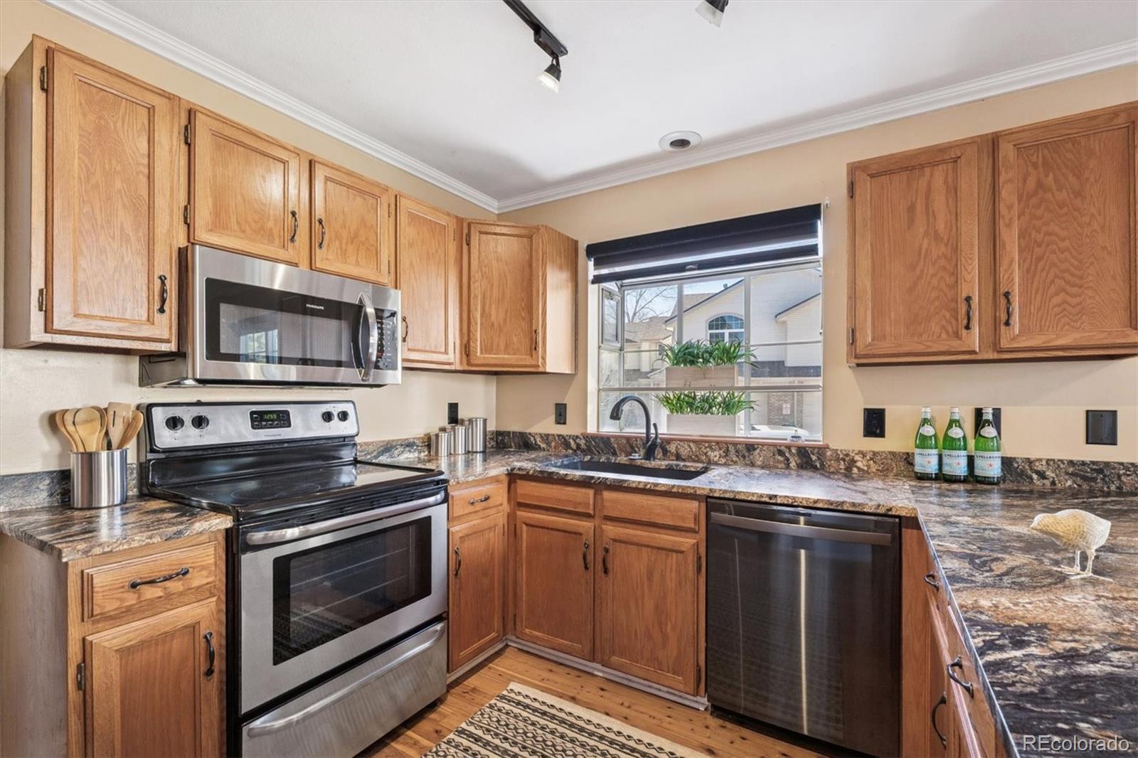 Welcome to this light-filled end-unit townhome in the desirable Willows at Highline community. Vaulted ceilings and skylights enhance the bright, open feel, while hardwood floors and a cozy brick fireplace add warmth and character. The inviting eat-in kitchen features granite countertops, abundant cabinetry, stainless steel appliances, a breakfast bar, and a spacious dining area—perfect for everyday living or entertaining. Sliding glass doors lead to a private, fenced patio ideal for relaxing or enjoying outdoor meals. Upstairs, you’ll find two generously sized vaulted bedrooms and a beautifully updated full bath. The finished basement provides a versatile family or rec room that can also serve as a bedroom, complete with a private bath and laundry. Additional highlights include a one-car attached garage, newer windows & more! Ideally located within the Cherry Creek School District, with easy access to trails, public transportation, and just minutes from Cherry Creek State Park. A fantastic opportunity at this price—don’t miss it!