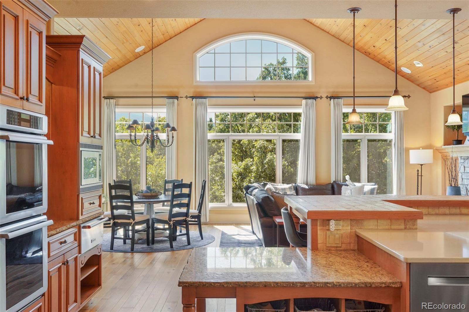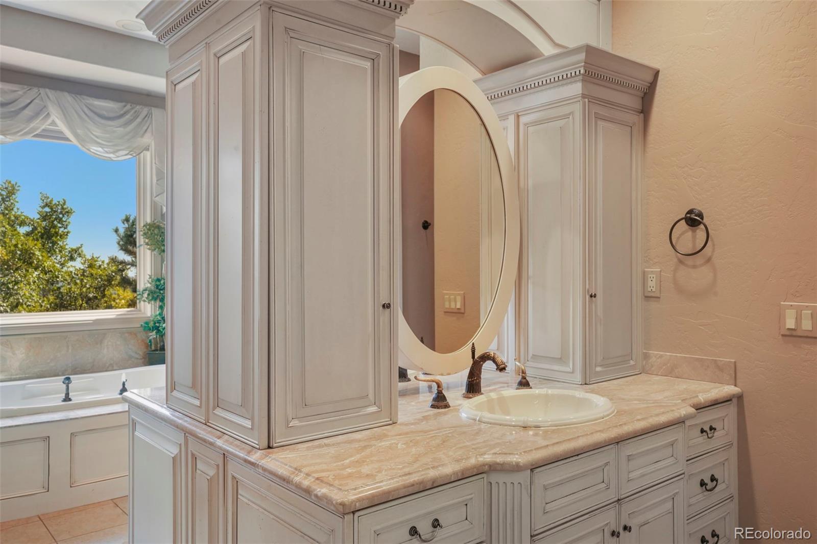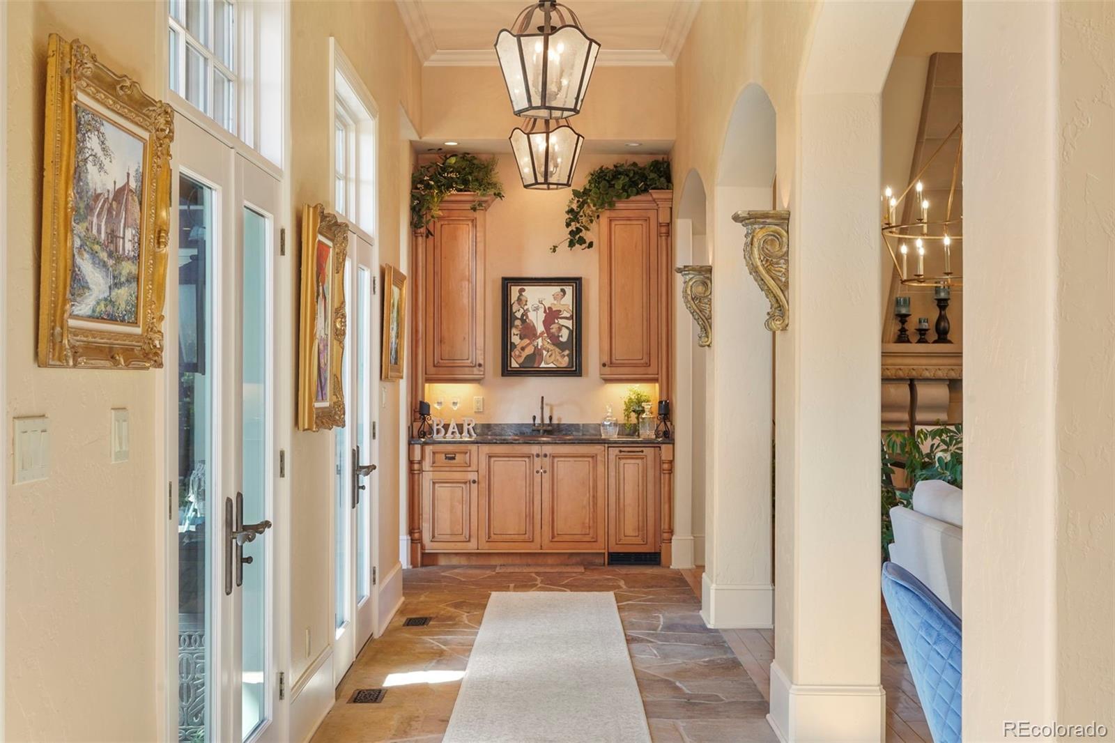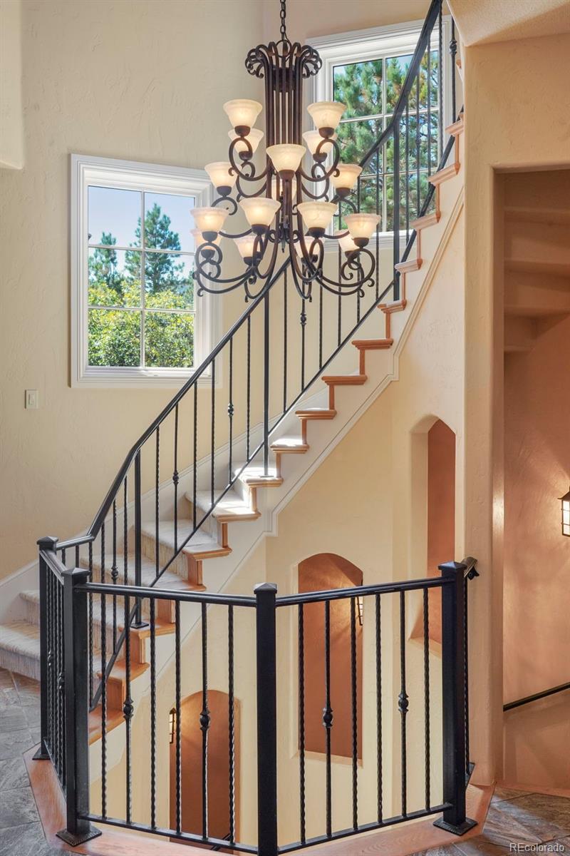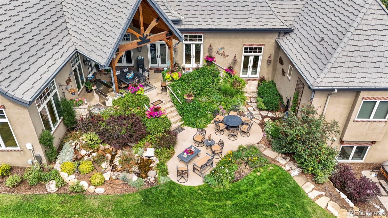 European inspiration… Exceptional architecture, fine craftsmanship and exquisite materials blend to create this one-of-a-kind getaway in the sought after Stratton Preserve. Set on 2 private and tranquil acres, the lot overlooks Cheyenne Mountain to the back and city lights to the front. True quality on display as you enter the house. Flagstone entry extends through the main corridor. The great room style living and dining room features vaulted ceilings with dormer windows, a woodburning fireplace at each end. The spacious gourmet kitchen connects to the hearth room to the back that opens to a cozy entertaining patio. The front landscaping is mature and designed for low maintenance while the back contains lush gardens and a water feature. Rounding out the main level is the primary suite with tandem baths and large walk-in closet and a study with gas fireplace and built ins. Above the spacious four car garage is a guest suite with living area. The lower level contains three en-suite bedrooms, large recreation room, wet bar, extensive wine cellar and theatre room. The home is located close to the Stratton Open Space, schools, downtown, hospitals, and I-25.