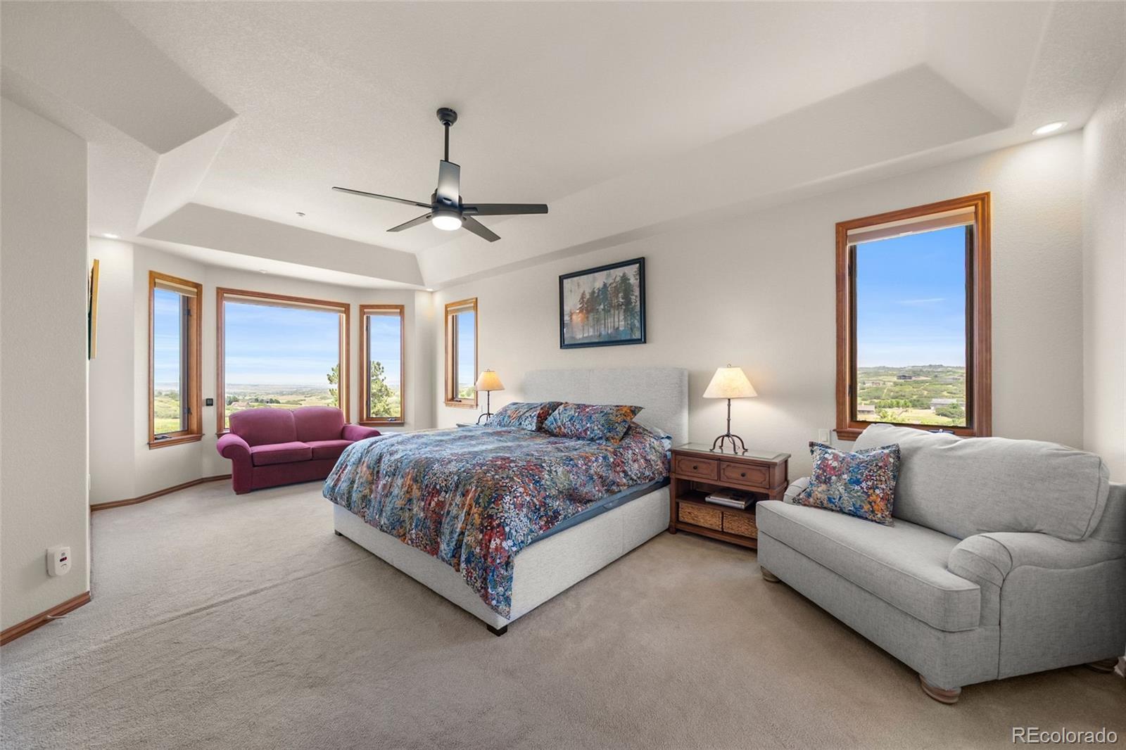 Welcome to this stunning retreat nestled on 5.4 private acres in the prestigious equestrian friendly Keene Ranch community. Set back 600 feet from the road, this custom home offers breathtaking panoramic views of the Front Range and twinkling stars at night. Designed for both luxury living and rural tranquility, the property is equine-friendly, allowing up to four horses, with direct access to a network of dedicated community riding trails. The residence features two heated 3-car garages—one attached, one detached—perfect for car enthusiasts or additional storage. Enjoy extensive professional landscaping, a large pond with cascading waterfalls, stamped concrete walkways, and low-voltage underwater lighting that create a magical outdoor ambiance. A fully fenced perimeter with solar-controlled gated entry, matching stone mailbox pillars, and a concrete driveway enhance the property’s privacy and curb appeal. Inside, you’ll find over 5,100 square feet of elegant living space with an open floor plan, vaulted ceilings, and sophisticated finishes throughout. The home boasts two expansive primary suites, each with ensuite baths, along with two additional bedrooms, a second family room, and two dedicated offices. The walkout basement is bright and spacious, and the home is handicap accessible with no-stair garage entry and wide doorways. Additional features include a whole-house Generac generator, Bullfrog in-ground spa, water treatment system with reverse osmosis at the kitchen sink, central vacuum, Hunter Douglas window coverings (6 with power operation), three EV charging stations, radon mitigation system, Boral Concrete Tile Hail and Fire Resistant Roof and more. Included in the sale are a Kabota enclosed cab tractor with snowblower (Model 2650) and a 2018 Kabota zero-turn riding mower (Model Z421KW-54). Keene Ranch offers approx. 247 homes on acreage, friendly neighbors, and an abundance of wildlife, and more. Minutes from Dawson Butte Open Space.
