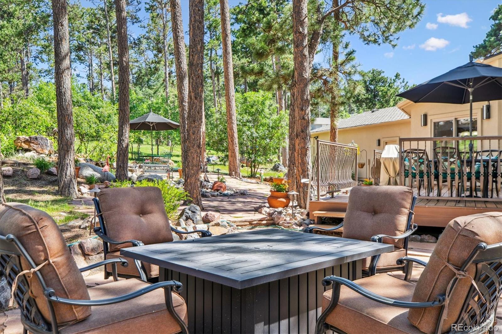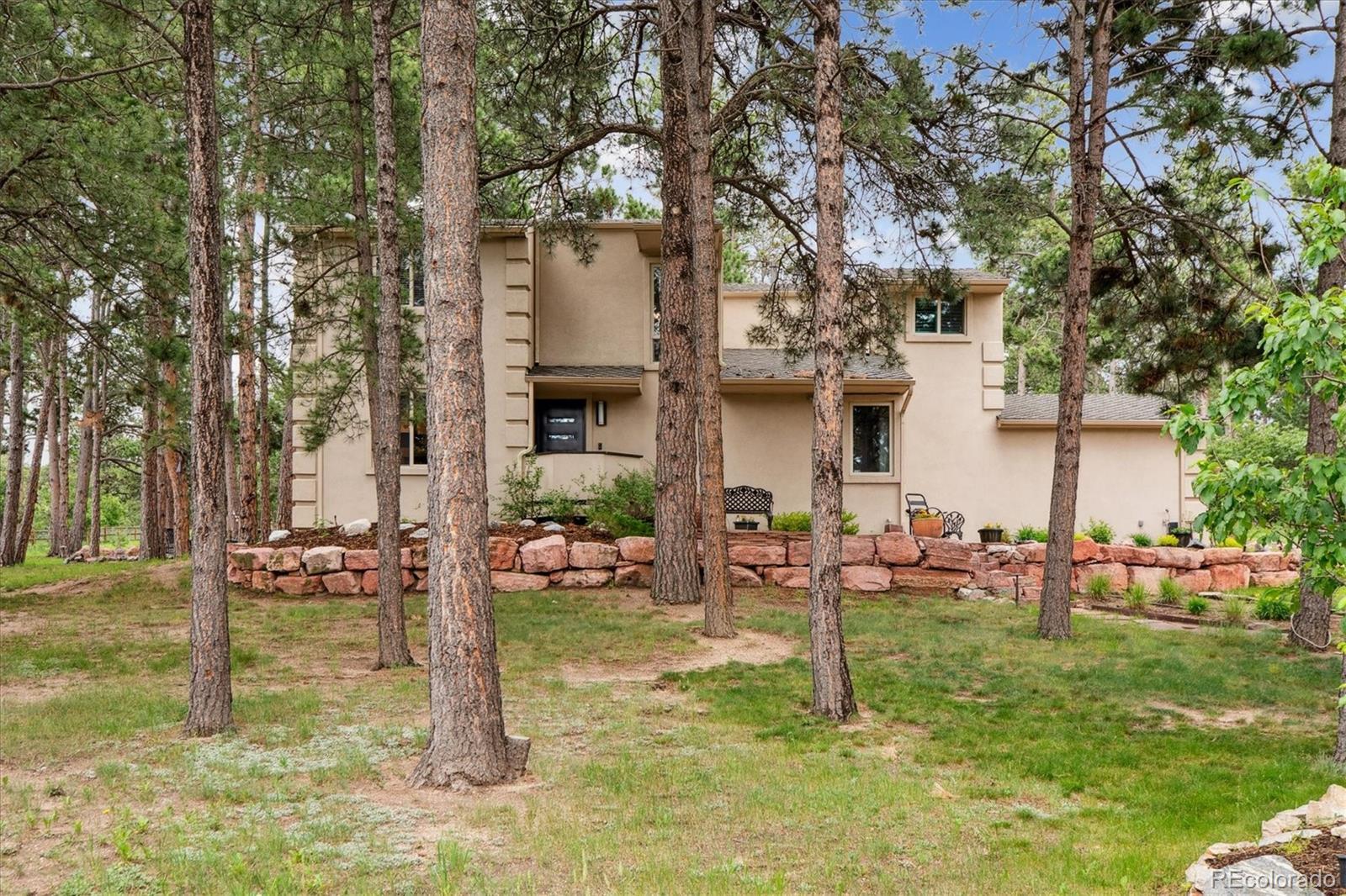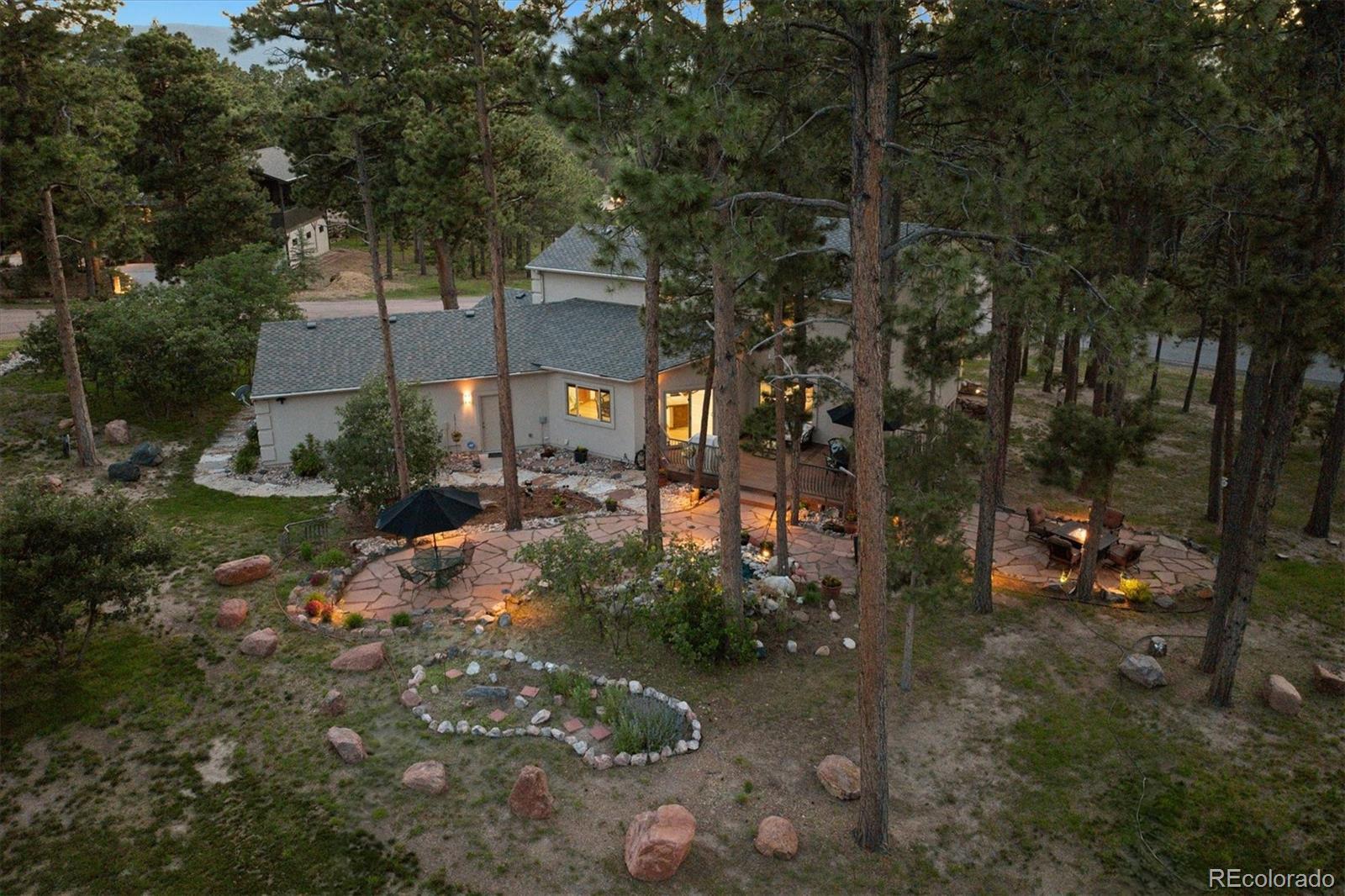 Spectacular Monument Retreat! Nestled on a private, wooded cul-de-sac lot in highly sought-after Woodmoor, this exceptional property offers a rare blend of serene forest surroundings and sun-splashed green meadows, creating a truly park-like setting. Step inside to discover a warm, inviting floor plan highlighted by refinished solid oak flooring, plush new carpet, & high-quality upgrades throughout. The spacious yet private main-floor office provides the perfect setting for working from home or unwinding with morning coffee and a favorite book. The home flows seamlessly into a generous Family Room and a beautifully appointed gourmet kitchen featuring granite countertops, a double oven, gas cooktop, premium Wolf stainless appliances, an expansive center island with seating, a sunlit breakfast nook, a large walk-in pantry, and an elegant formal dining room. A granite wet bar with wine cooler adds a refined touch to the main level. Embrace peaceful Colorado living as you step outside! A stunning rock waterfall and pond create a tranquil backdrop for wildlife watching, while the Trex deck with wrought-iron railings and wraparound flagstone patio offers perfect space for entertaining. Upstairs, the primary suite showcases a newly renovated five-piece bath adorned with marble finishes, a custom oversized shower, stylish dual vanities, a deep soaking tub, and expanded custom walk-in closets. The spacious secondary bedroom features its own walk-in closet and access to a beautifully updated three-quarter bath.The garden-level basement expands your living space with a large game room, flexible bedroom, an impressive granite sports bar, additional three-quarter bath! Additional highlights include a spacious 4 car Garage, newer roof and Milgard Windows! Ideally located just half a mile from The Country Club at Woodmoor, w/18-hole golf course, tennis/pickleball, fitness center, pools, and dining. Close to Tri-Lakes, shopping, parks, trails, downtown Monument, & I-25 and Hwy 83.