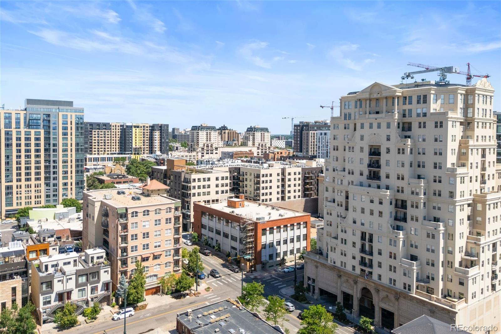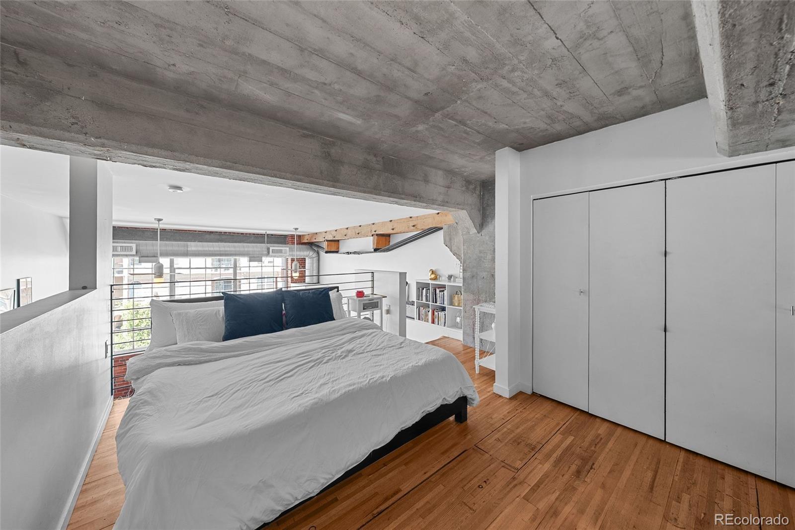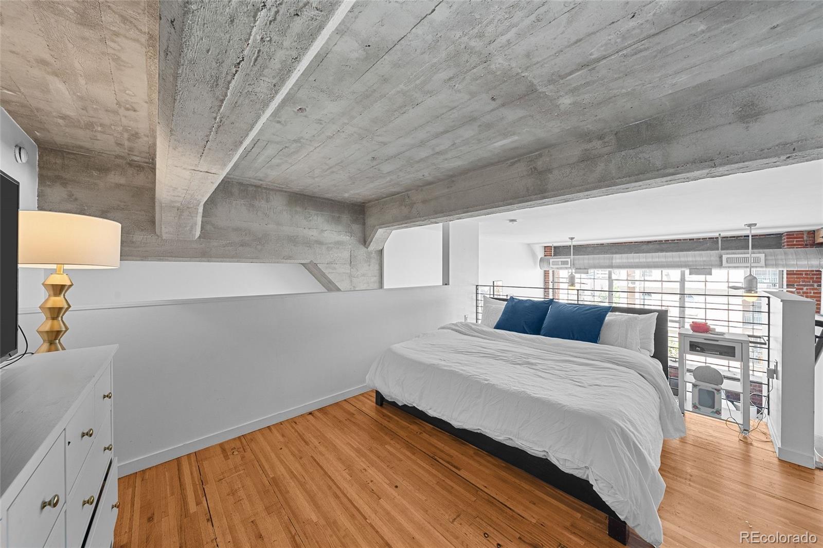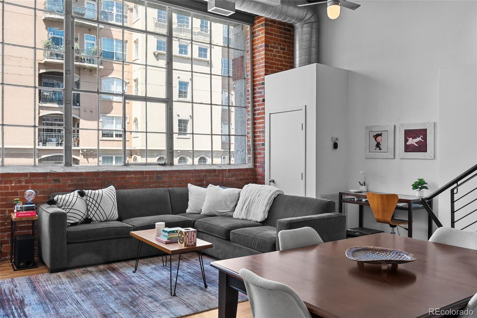 Exceptional two-story, one-bedroom, one-bathroom loft nestled in the heart of Denver’s Golden Triangle. Blending modern luxury with historic charm, this thoughtfully remodeled residence is located in the iconic Cadillac Lofts—once home to the Cadillac Motor Company service garage. The home showcases original hardwood floors, soaring 15-footceilings, and exposed brick walls, preserving the character of its industrial roots while offering contemporary comfort. Oversized windows flood the space with natural light and frame stunning views of the Denver skyline from every room. A benefit is also the electric privacy and blackout curtains installed for each window. This stylish condo boasts a unique blend of character and comfort, starting with soaring wood-paneled ceilings in both the kitchen and bathroom that add warmth and texture to the space. The open-concept main level features an updated kitchen with bar stool seating at the island, ample room for a dining area, and a spacious living room perfect for entertaining. Upstairs, the lofted bedroom offers privacy while still enjoying the unit’s high ceilings and open layout. Additional highlights include updated appliances within last 5 years, new HVAC in past 5 years, Smart thermostat with heat sensors, in-unit laundry, deeded parking with an adjacent storage unit, and sleek laminate and wood flooring throughout. Take advantage of the building’s amenities, including bike storage, secure entry, and an EV charging station. BRAND NEW remodeled Rooftop Deck with entertainment area, BBQs, & unparalleled mountain/city views. Located in the heart of the Golden Triangle, you’re just steps away from museums, art galleries, Civic Center Park, Cherry Creek Trail, and some of the city’s best restaurants, cafes, and cultural attractions. With easy access to public transit and major highways, this condo offers both convenience and urban living at its finest. HOA Credit can also be used for a lender credit if preferred.
