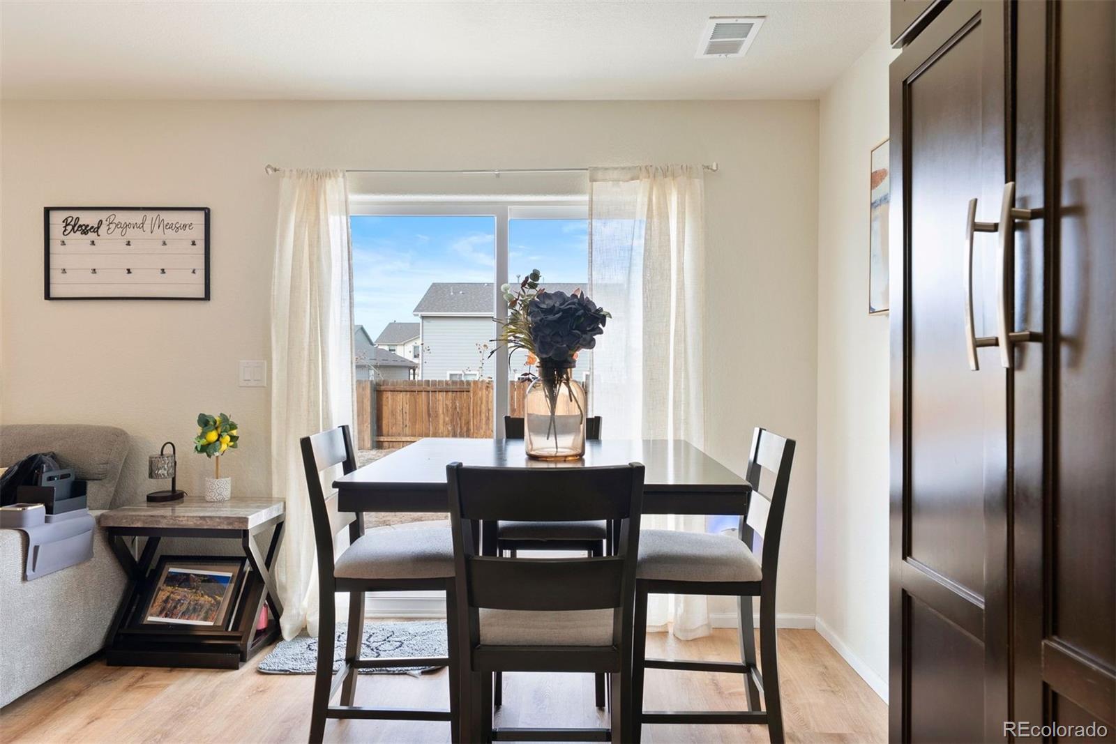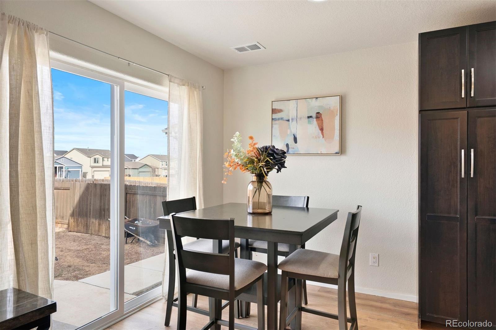 Welcome home to Bennett Crossing! This charming two-story home offers 3 bedrooms and 1.5 bathrooms with a comfortable and functional layout. Upon arrival, you’ll be greeted by laminate flooring that flows throughout the main level, creating a warm and inviting atmosphere. The open-concept floor plan seamlessly connects the living room, dining area, and kitchen—perfect for everyday living and entertaining. The kitchen features all-new appliances, rich java cabinetry, and ample storage space to keep everything organized. Just off the dining area, step outside to a spacious backyard with a newly expanded patio, ideal for outdoor gatherings, relaxing evenings, or weekend barbecues. The yard also includes two storage sheds, providing plenty of additional space for tools, hobbies, or seasonal items. A convenient half bathroom on the main level is perfect for guests. Upstairs, you’ll find three bedrooms and a full bathroom. The primary bedroom is generously sized and includes a walk-in closet, offering plenty of room for comfort and storage. Located in a great location with quick and easy access to the highway, this home is just minutes from shops, restaurants, and everyday conveniences. The town of Bennett continues to grow, with new commercial developments and businesses on the way, making this an exciting opportunity to be part of a thriving community. Don’t miss your chance to own this wonderful home in Bennett Crossing!