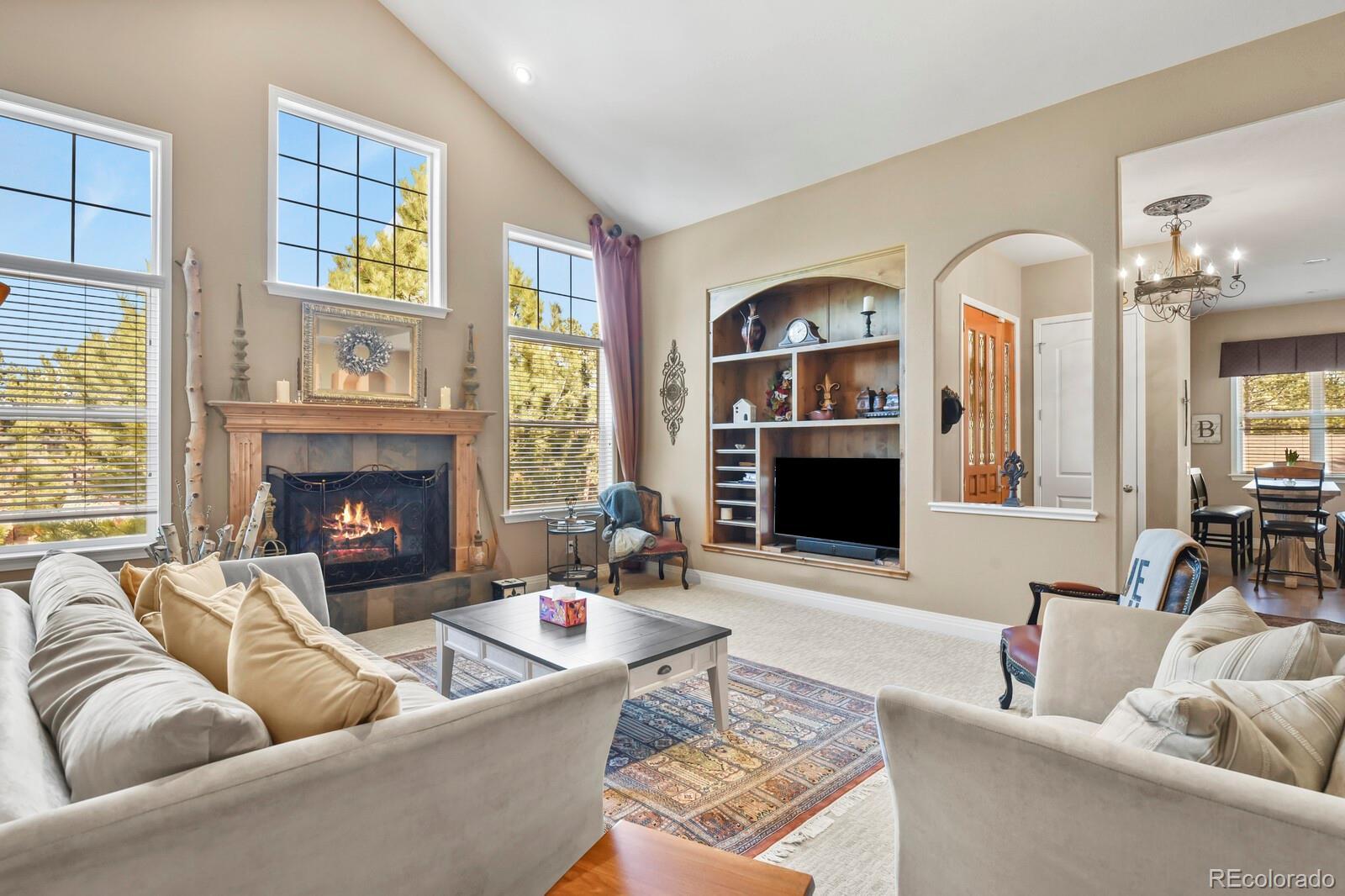 Gorgeous updated ranch home framed by towering Ponderosa pines! Vaulted grandeur in this stunning home showcases a spacious living room, chef's gourmet kitchen, main floor master suite and office / library. The living room features 16 ft cathedral ceiling. The gas fireplace and knotty alder built-in shelving create a cozy ambiance. Open kitchen and formal dining room provide ample room for entertaining. The chef's gourmet kitchen boasts slab granite countertops, spacious pantry, stainless steel appliances, and a breakfast nook. The bright and spacious master suite boasts a 13 ft vaulted ceiling with a barn door entry into a luxurious 5 piece master bathroom, with separate counters/ sinks. So many options with a finished walkout basement and a separate family room, 3 additional bedrooms, 2 private bathrooms, and ample storage space. Enjoy a night out under the stars on the private stamped concrete backyard patio including the relaxing sounds from the fountain, surrounded by forest--where you are sure to enjoy nature at its best, including breathtaking wildlife sightings! This home satisfies the longing to be “in the mountains,” but close enough to shopping and restaurants to be able to enjoy the best of both worlds! New Roof in 2023 and over $84,000 in upgrades!