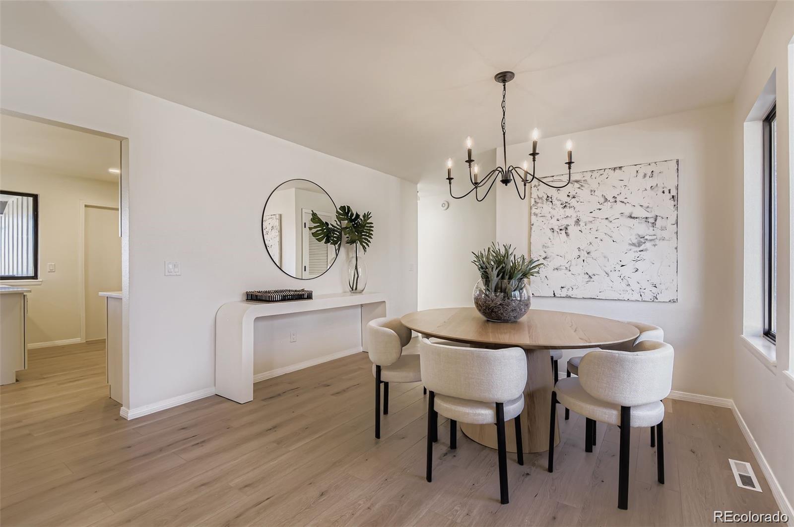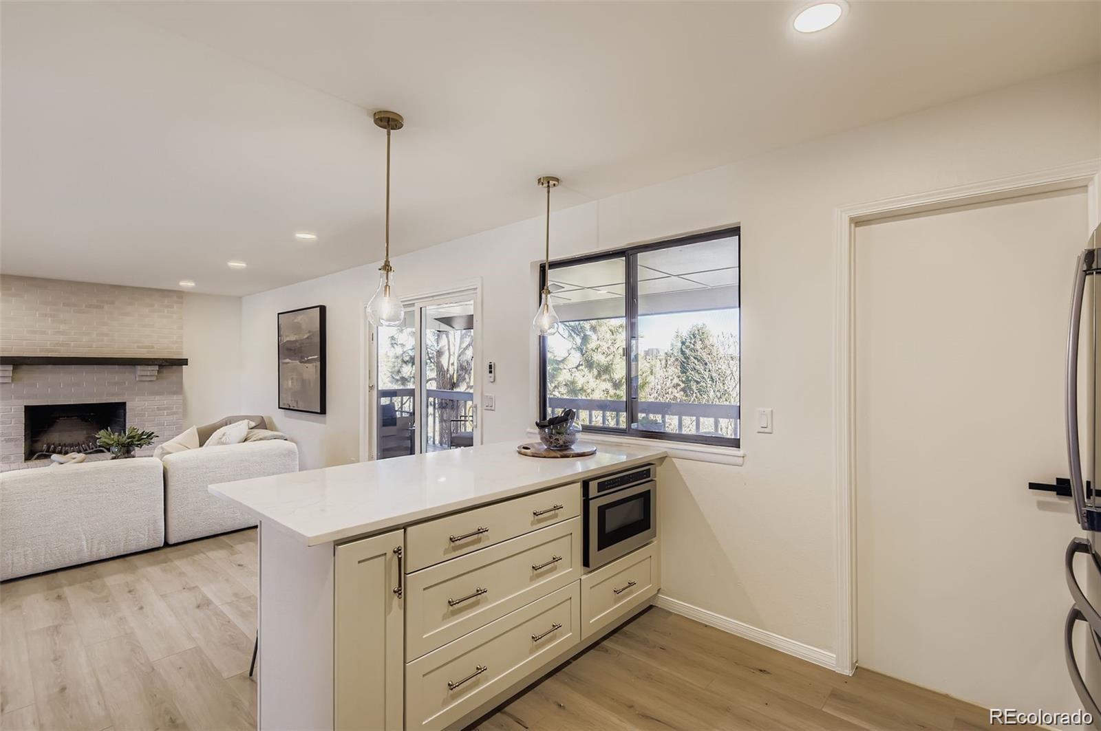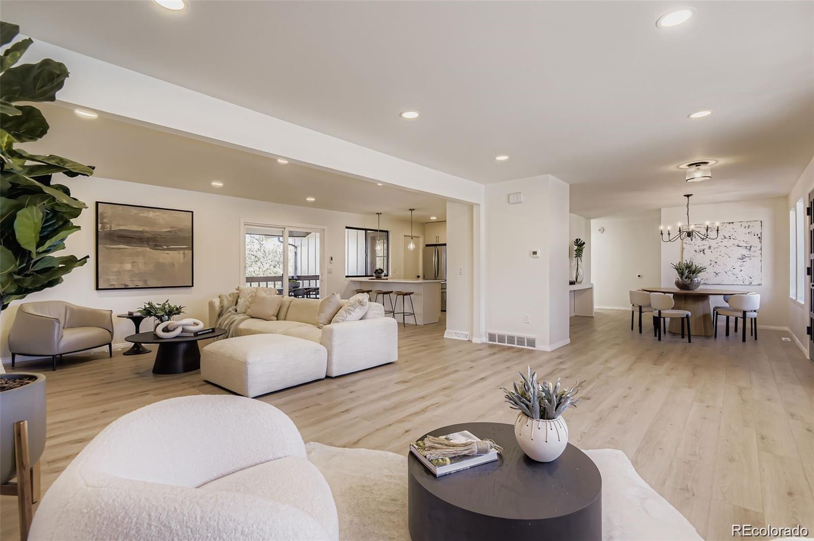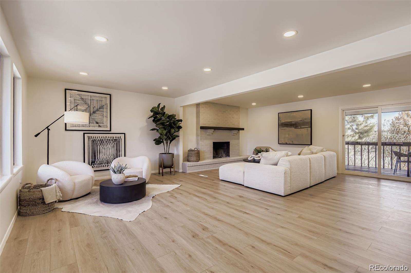 A fully updated walk out ranch perched on a hilltop in Greenwood South with views of DTC! New: paint interior, exterior, faux wood floors, carpet and light fixtures. This residence has three bedrooms, two bathrooms, laundry room, open family room, dining room and fireplace on the main floor. New kitchen cabinets, quartz countertops, and stainless steel appliances, highlight this open kitchen concept with peninsula island. Primary suite has new tile, 6 foot double vanity, plumbing fixtures, and a walk in closet. Large covered patio looks onto this double lot of over 19,000 square feet almost 1/2 acre. Two fireplaces one on the lower level has updated bathroom and new carpet. Lower level has 425 sqft storage room. Greenwood Village elementary school in the Cherry Creek school district.
