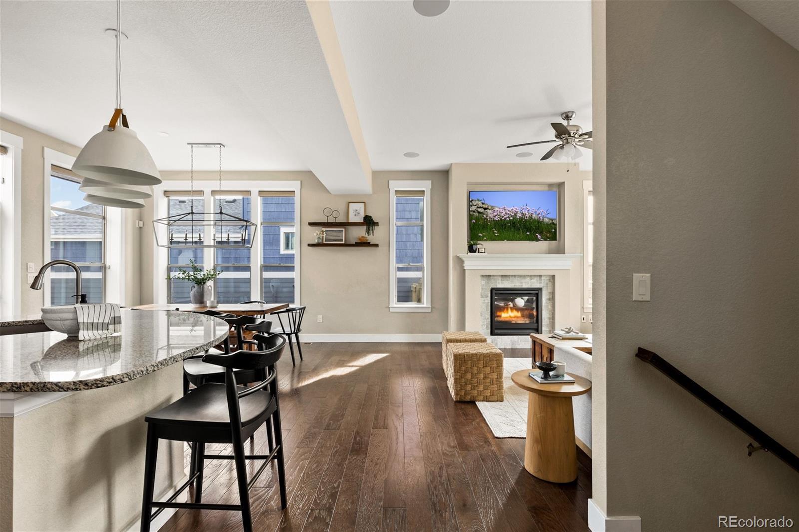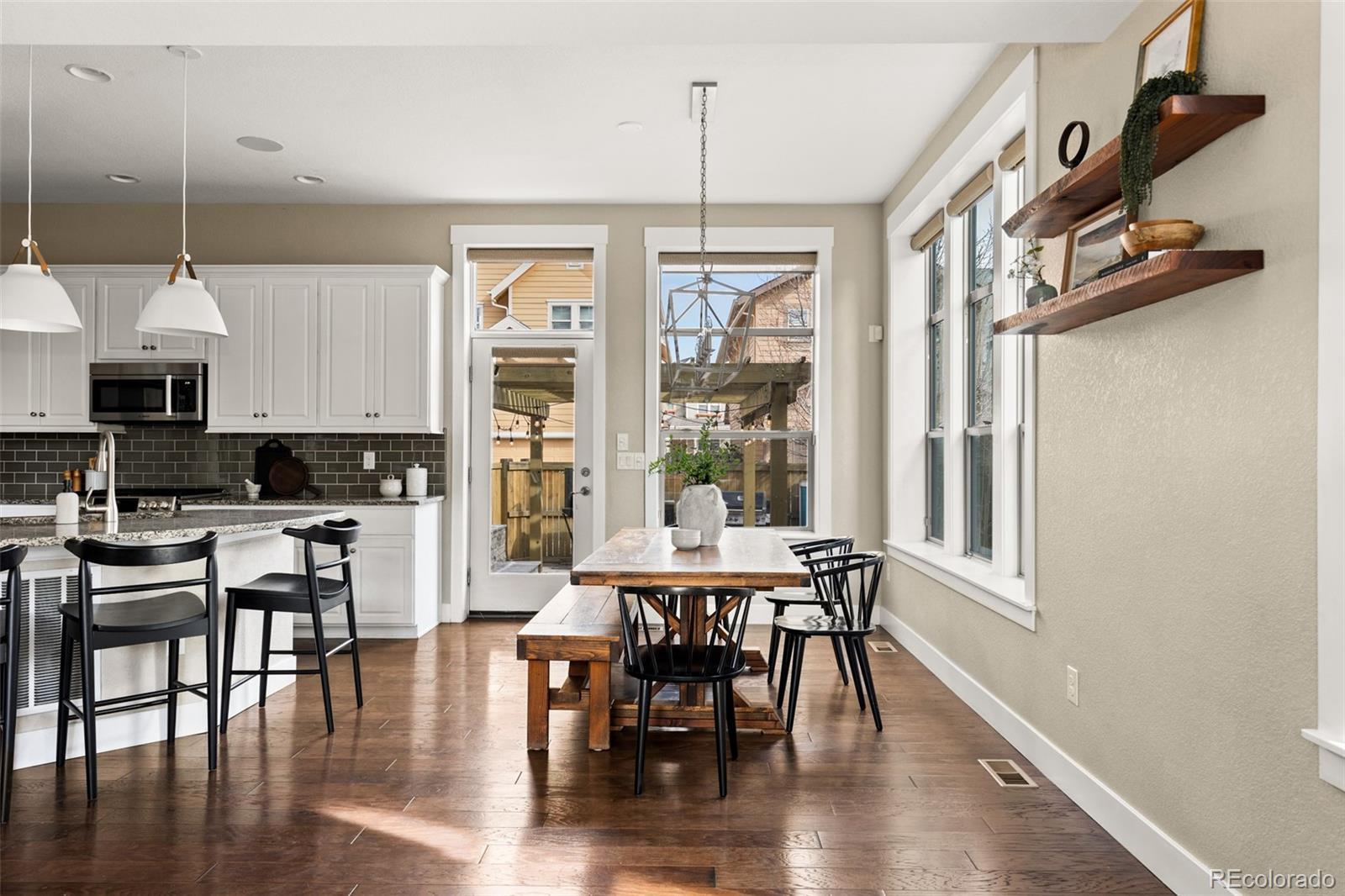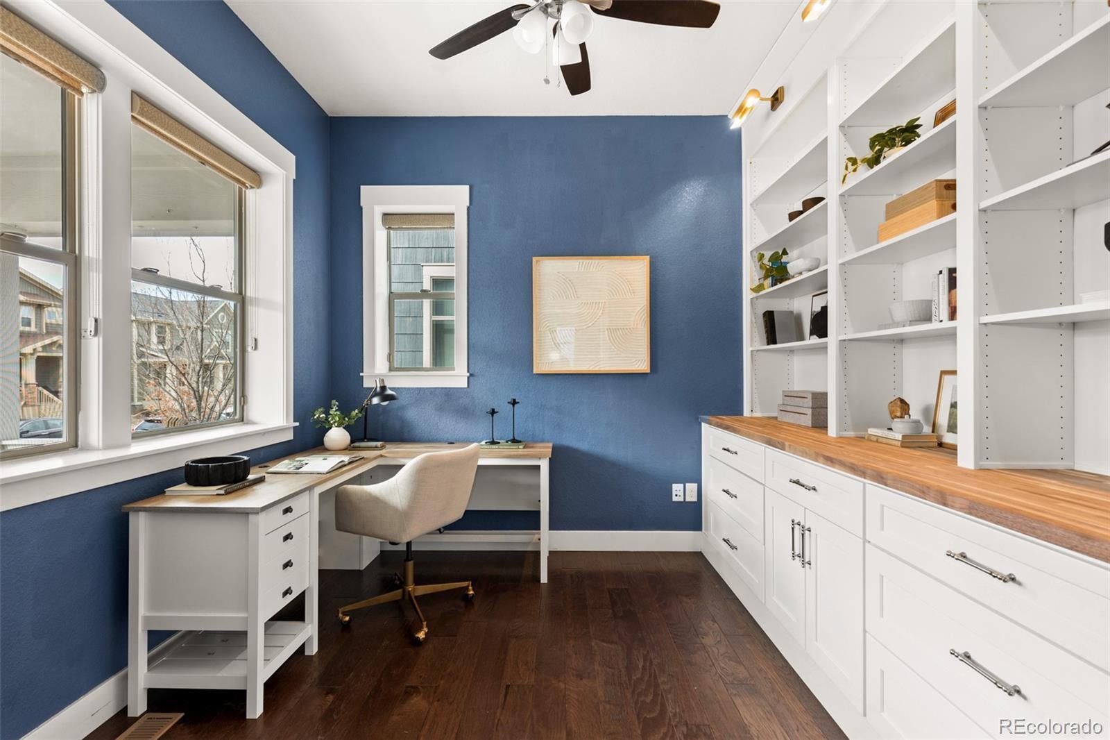 This modern farmhouse with a covered front porch invites you to slow down & stay awhile. Rich hardwood floors span the main level, where a private office with custom built-ins sits just off the entry. The light-filled great room seamlessly connects the living, dining, and kitchen spaces. A gas fireplace anchors the living room, enhanced by in-ceiling surround sound. The kitchen shines with white shaker cabinetry, granite counters, decorative backsplash, designer pendants, stainless steel appliances including an updated double oven range & refrigerator, a large island & a walk-in pantry with custom organization. A built-in mudroom & desk connect to the garage, offering ample storage and an EV charging port. Upstairs, the laundry room includes built-in cabinets, a utility sink. The primary suite features coffered ceilings, a 5-piece bath with dual sinks & a walk-in closet with custom organizers. Two additional bedrooms also offer built-in closet systems & share a hall bath. The finished basement offers a spacious living area with surround sound, an additional bedroom with Murphy bed and custom walk-in closet, a full bath and generous storage. Outside, enjoy a professionally landscaped backyard with an extended patio, pergola, built-in seating around a custom poured gas fire pit, pergola & low-maintenance turf. Don’t miss the flower beds in front, back & alley, offering fresh tomatoes & strawberries. Added upgrades include JellyFish permanent outdoor lighting, security system, device charging-drawer, whole house humidifier, new paint, new roof, new carpet, two tankless hot water heaters & a 20-year prepaid solar system with 10 years remaining. Close to highly regarded Northfield and DSST High Schools in Central Park, this Thrive energy-efficient home blends comfort & thoughtful design throughout. Hurry to the one you have been waiting for!