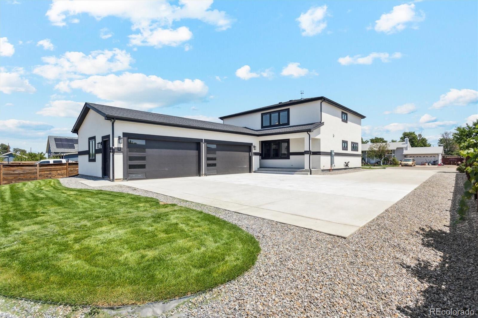 Built in 2024, this stunning modern two-story home offers over 4,017 square feet of thoughtfully designed living space, featuring 8 bedrooms, 5 full bathrooms, and a 4-car garage with additional off-street parking and no HOA. Designed for both luxury and functionality, the home showcases contemporary finishes and an open floor plan filled with natural light. Upon entry, you are welcomed by soaring two-story vaulted ceilings in the living room and a dramatic open layout complemented by wood flooring throughout the main and upper levels and stylish wrought iron railings. The spacious living area flows seamlessly into the gourmet kitchen, complete with quartz countertops, stainless steel appliances, a large center island, and a striking waterfall quartz feature, making it the perfect space for entertaining and everyday living. The home features two primary suites with private en-suites and walk-in closets, including one conveniently located on the main level and a second upstairs, ideal for multi-generational living or guest accommodations. All five bathrooms are full bathrooms, offering comfort and convenience throughout the home. The finished basement expands the living space with additional bedrooms and flexible living areas, perfect for recreation, guests, or a home office setup. Recent seller upgrades include custom wrought iron railings on the front exterior and electrical gate doors providing enhanced privacy and secure access to the backyard and garage area. With its modern design, spacious layout, premium finishes, and rare 8-bedroom configuration, this home offers exceptional value and versatility. Conveniently located near parks, trails, shopping, dining, and Denver International Airport, this property combines luxury, comfort, and accessibility. A rare opportunity to own a nearly new modern home with space, style, and privacy.