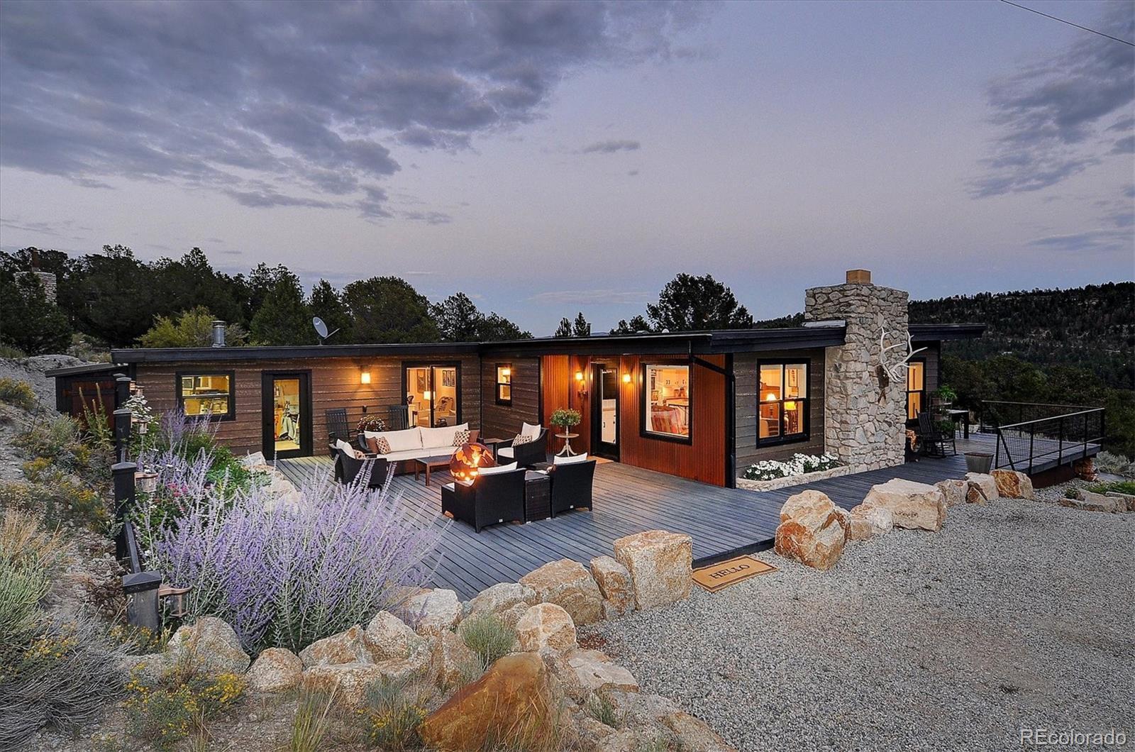 As featured in the NYT! Pls ask for link. Nestled at the base of the notorious Chalk Cliffs, this beautifully remodeled single-level 1,976 SF home captures spectacular views in every direction. Where the unforgettable Colorado lifestyle, luxury country living, and mountain cabin seamlessly blend for a cozy retreat. Thoughtfully updated, the property showcases new siding, windows, doors, electrical, lighting, railings, and decking, along with a stunning outdoor living space and refreshed landscaping. Every upgrade was chosen with both elegance and durability in mind, creating a space that feels fresh, modern, and timeless. The sophisticated interior features a welcoming living room and dining area anchored by a striking stone fireplace and views of the dramatic mountain backdrop. The kitchen boasts walnut butcher block countertops, marble-topped island, copper farmhouse sink, and new appliances—perfect for everyday living or entertaining with ease. The inviting primary suite offers a peaceful retreat with a remodeled full bath and convenient laundry access, while two additional bedrooms, along with a custom bath, versatile office/library, provide ample space for family, guests, or remote work. The attached workshop provides terrific storage and work space. Multiple sliding doors lead to expansive decks and outdoor living areas, where the ambiance is captivating and nature takes center stage. Outside, enjoy low-maintenance landscaping accented by colorful perennials and graceful aspens, designed to enhance the property’s natural beauty without demanding constant upkeep. Whether you’re savoring morning coffee on the deck, hosting sunset gatherings, or simply soaking in the crisp mountain air, this home delivers the ultimate in indoor-outdoor Colorado living. Blending modern luxury with the timeless charm of a mountain hideaway, this gem is more than a home—it’s a sanctuary where every detail invites you to relax, unwind, and take in the magic of this incredible home.