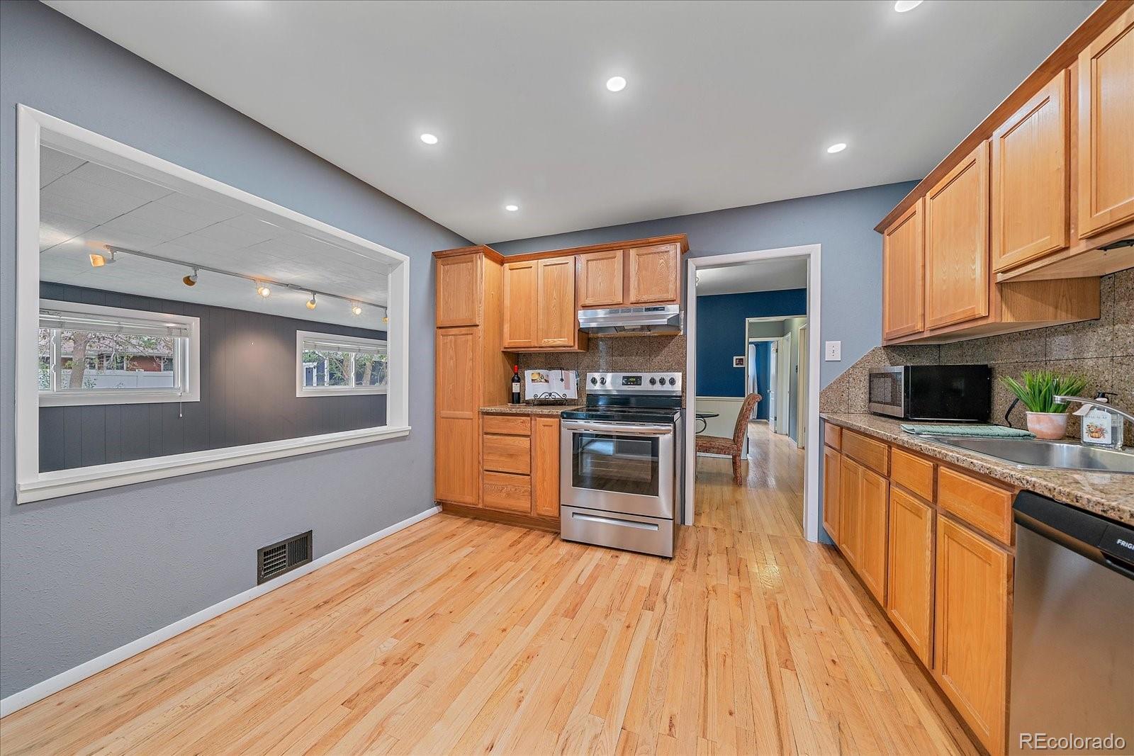 Welcome to a delightful home with a blend of comfort and contemporary updates. This 3-bedroom home is perfectly nestled on a generous lot. Step inside to find inviting hardwood and carpet floors throughout, complemented by thoughtful updates that brighten every corner. The kitchen is a culinary enthusiast’s dream with a pass-through to the family room for all your entertaining this season. Conveniently, the kitchen features a suite of updated appliances, including a dishwasher, refrigerator, oven, range hood, and microwave for effortless living. Off the kitchen, a bright laundry room is a standout feature, equipped with a utility sink, washer, dryer, cupboard storage, and shelving, offering both functionality and convenience. The home boasts three well-appointed bedrooms, each adorned with a ceiling fan and newer carpet, offering a cozy and refreshing haven. Outside, a beautifully maintained lawn with a convenient sprinkler system and storage shed for all your yard tools, enhances the home's curb appeal, while the private outdoor space offers a serene retreat. Relax on the covered patio, complete with a workbench ideal for entertaining or gardening. An attached garage provides additional accessibility, while the forced air system and central air ensure year-round comfort. Nestled in the charming University Hills neighborhood, this home offers unparalleled convenience with its prime location. Just a short walk away, you'll find an array of stores, shops, and the local public library, while the nearby Yale light rail station ensures effortless commuting. Ideal for those working in the Denver Tech Center, downtown, or Cherry Creek, the property boasts easy access to I-25 and Colorado Boulevard. Despite its proximity to these vibrant areas, the home is perfectly situated in a tranquil setting with mature trees and quiet streets, offering a peaceful retreat from the city bustle. Don’t miss the opportunity to make this house your new home!