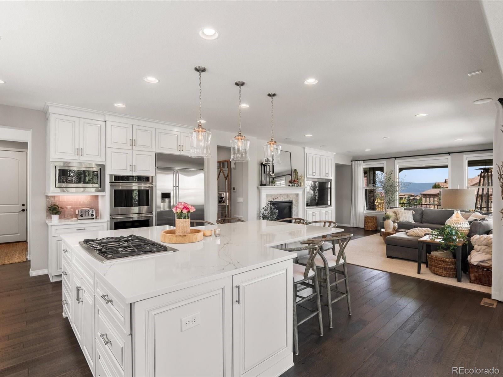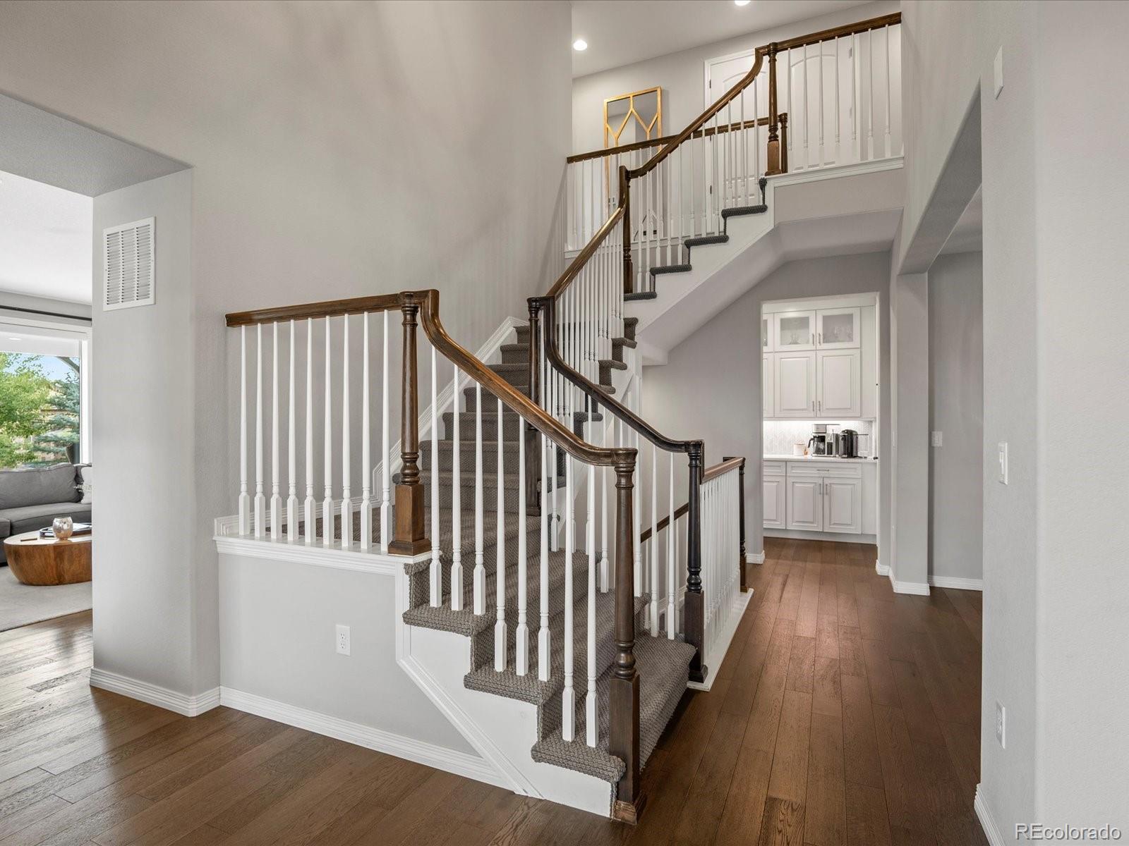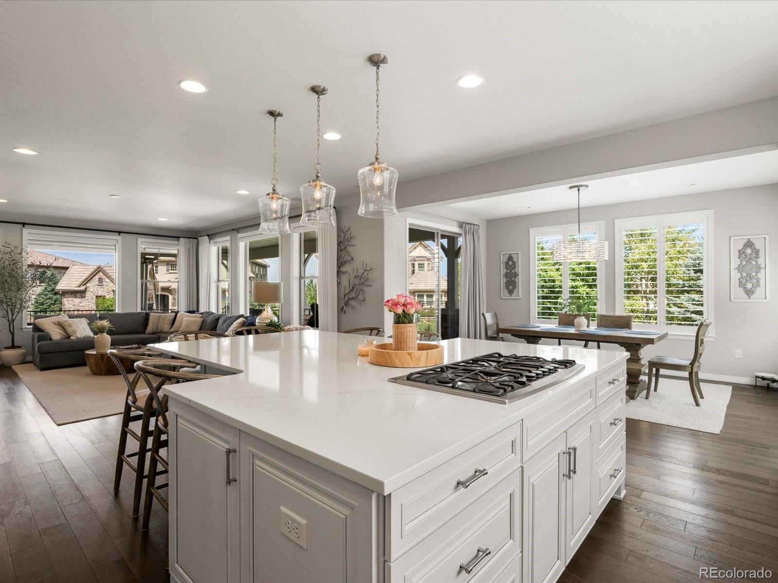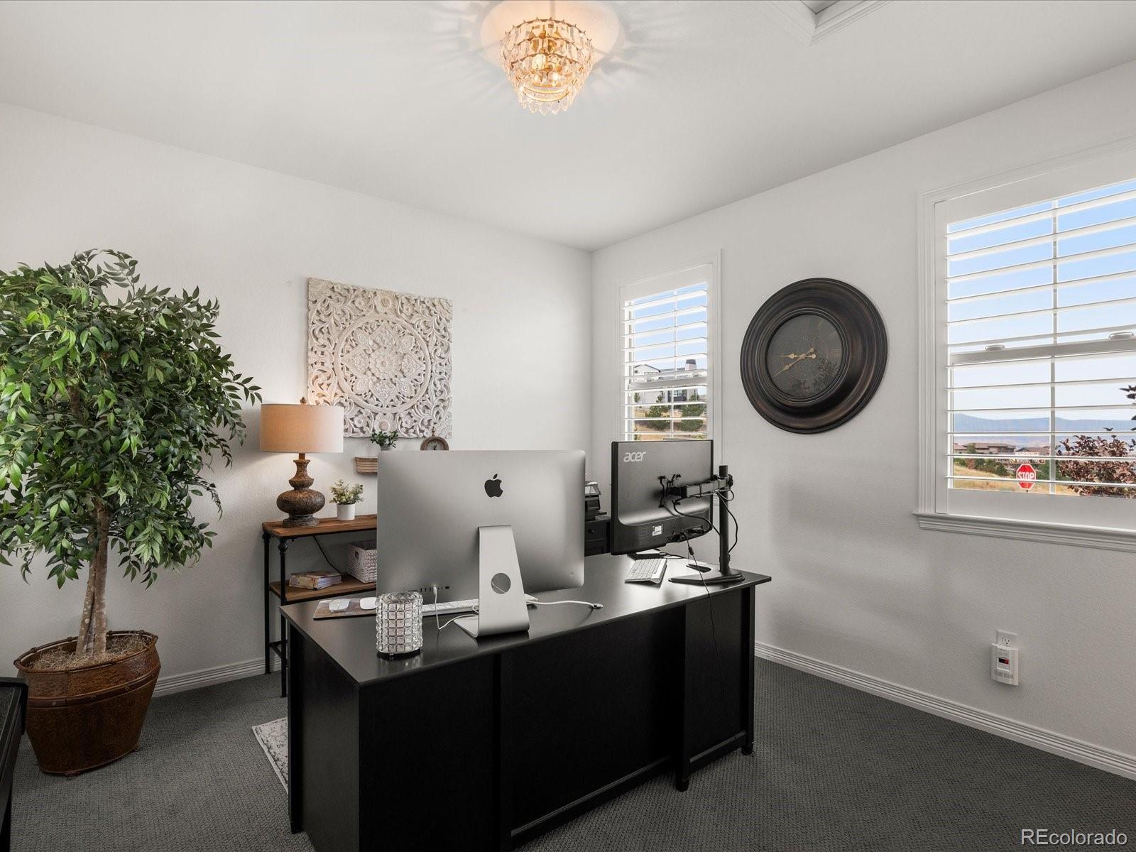 Welcome to this stunning 6-bedroom, 6-bathroom home in the highly sought-after Backcountry neighborhood of Highlands Ranch, where breathtaking sunsets and mountain views can be enjoyed from the expansive wraparound back patio. The professionally landscaped yard is perfect for entertaining, offering space to play, lounge by the gas fire pit, or dine under the Colorado sky. Inside, the main floor showcases a massive chef’s kitchen with butler’s space, two pantries, a huge island with new quartz countertops and farmhouse sink, a spacious living room wrapped in windows with remote-controlled treatments and a cozy fireplace, a formal dining room, a private office, a bedroom with en-suite bath, plus a half bath and laundry room. Upstairs features four additional bedrooms and three full bathrooms, including a luxurious primary suite with fireplace and spa-like 5-piece en-suite. The finished basement boasts a large rec room with surround sound for movie nights, a guest bedroom with full bath, and over 1,190 sq ft of unfinished space ready for your vision. With three garage spaces, designer finishes, and resort-style community amenities, this Backcountry beauty is the perfect blend of luxury and comfort. Note: Please check out property website at https://justpendeddenver.hd.pics/751-Winding-Pine-Ln