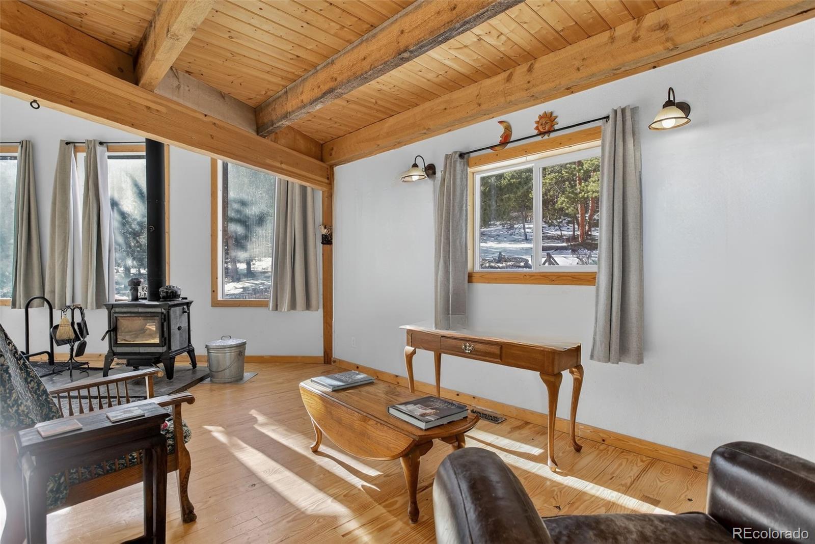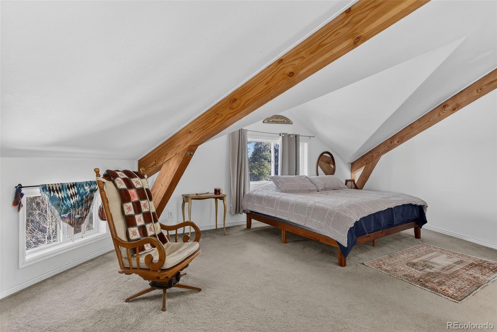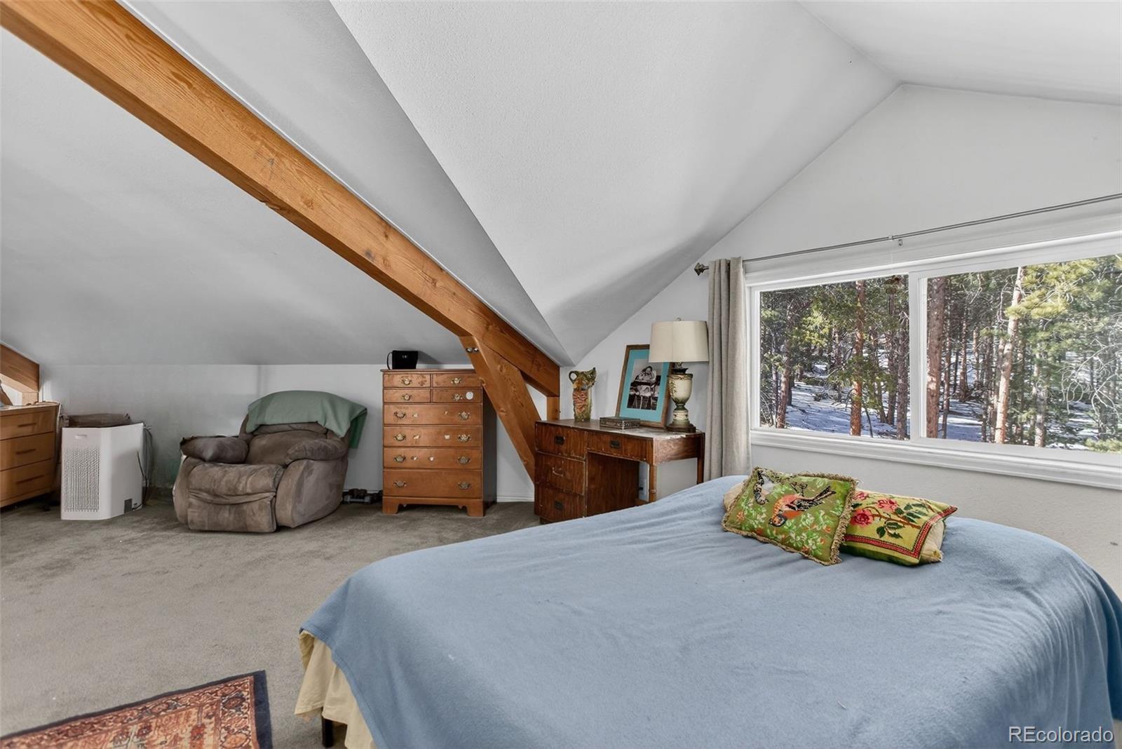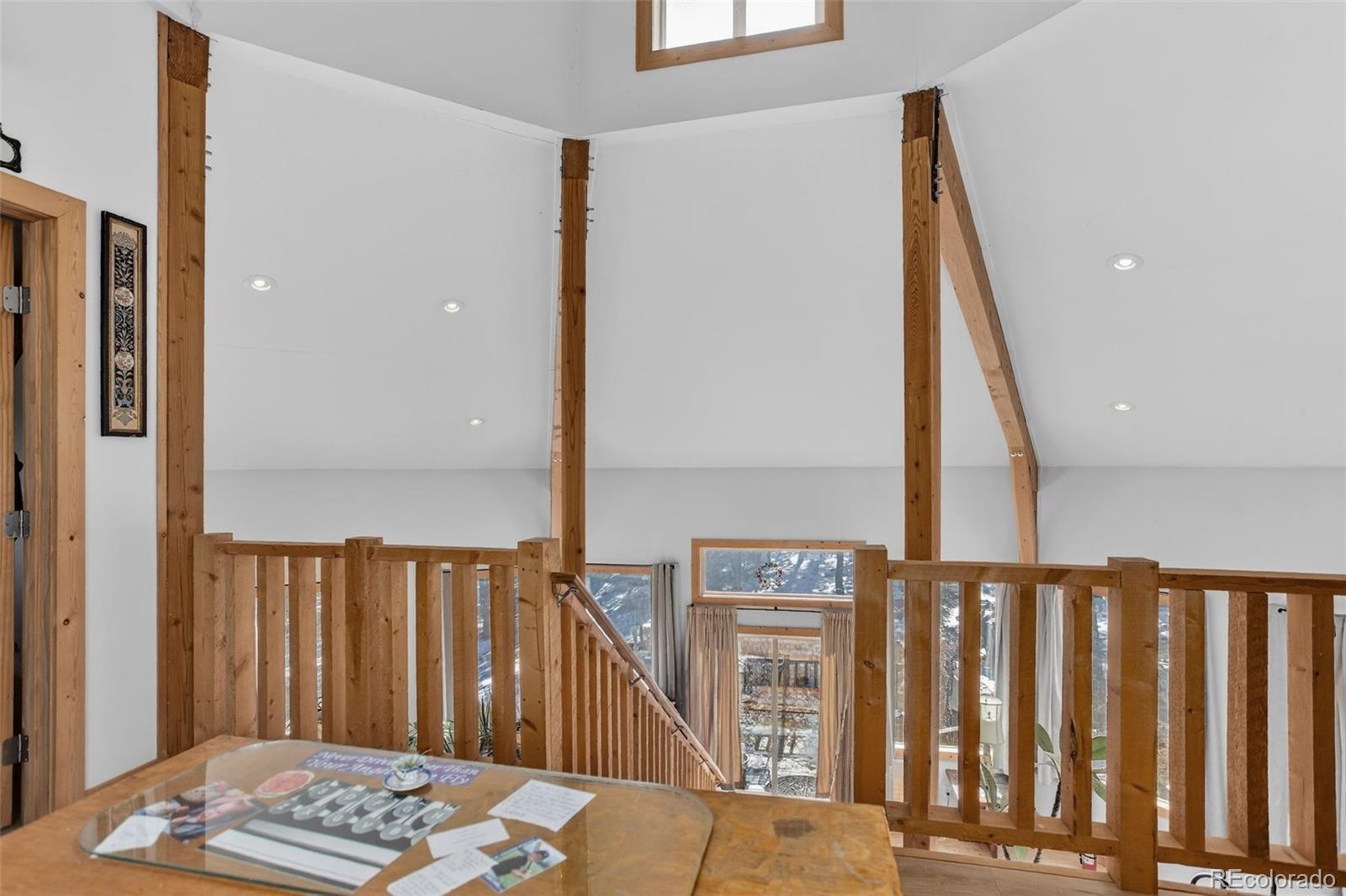 Surrounded by trees and quiet, this one-of-a-kind mountain retreat is thoughtfully set into its natural surroundings, offering privacy and a true sense of escape. Inside, the main level features an open-concept, circular layout designed to flow naturally around the center of the home. Windows wrap around the space, providing forest views in every direction and filling the home with natural light. The family room, anchored by a wood-burning fireplace, creates a warm focal point and connects seamlessly to the outdoor balcony and additional living areas. The central staircase defines the layout, with the dining area positioned beneath it at the heart of the home. The main level also includes a half bath, a utility room with washer and HVAC, and a kitchen that blends contemporary function with rustic warmth. A second cozy living area offers a more private space for relaxing or unwinding. Upstairs, two spacious bedrooms with forest views are connected by a Jack-and-Jill style bathroom with a stand-up shower. An open landing, currently used as an office, overlooks the living space below and is filled with natural light from surrounding windows. Situated on just over two acres with no HOA, the property offers space to relax and enjoy mountain living, with flexibility for future improvements if desired. Whether as a full-time residence or a mountain getaway, this rustic contemporary retreat delivers character, comfort, and a genuine connection to nature.