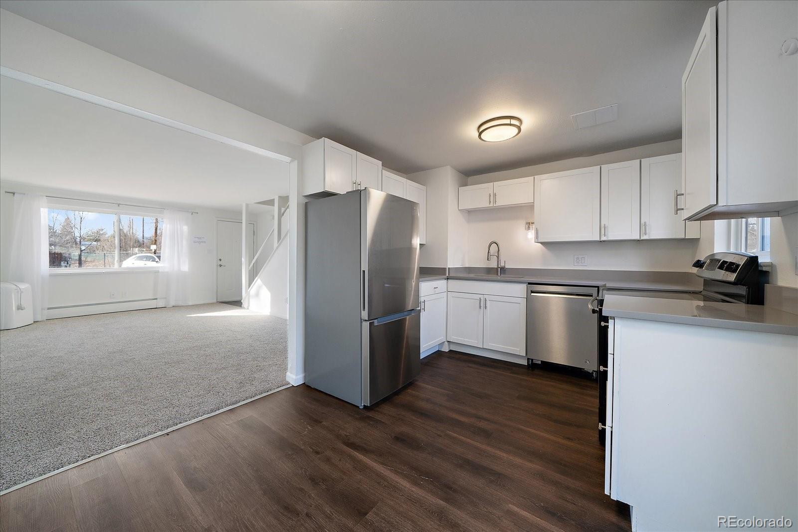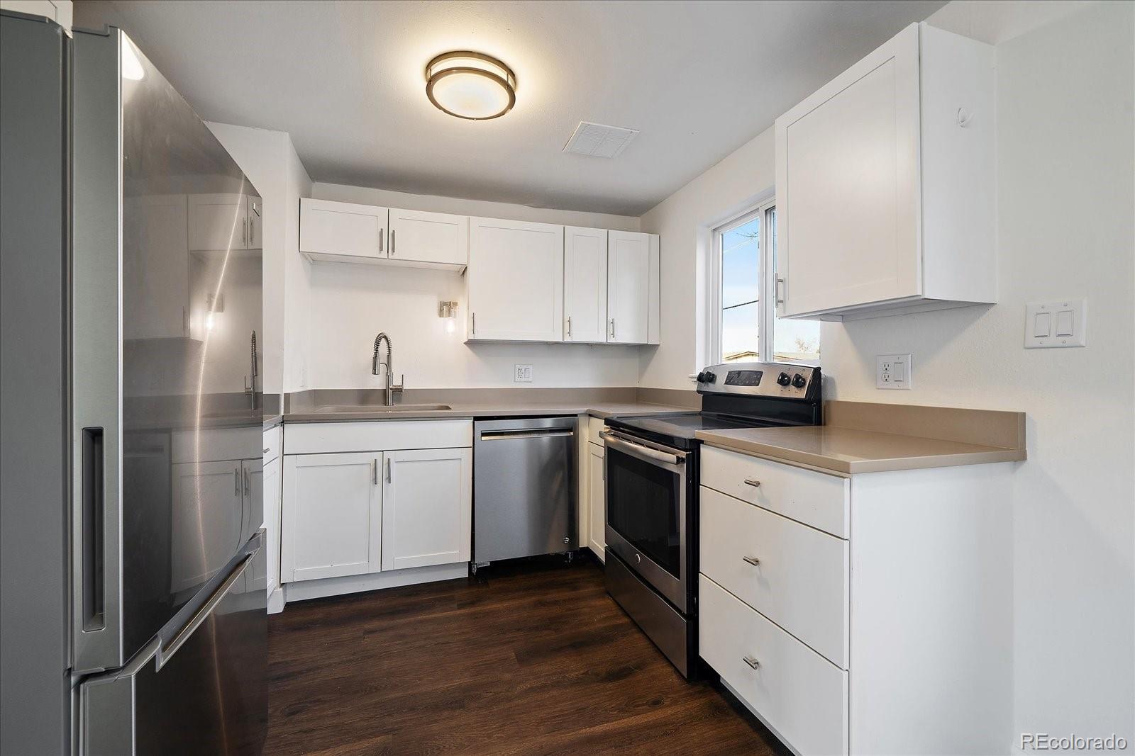 Modern Living Meets Ideal Location Along Babbling Creek. Discover a serene yet connected lifestyle in this fully renovated townhome community, nestled in a peaceful cul-de-sac with the soothing sounds of a small creek right outside your window. These townhomes feature private entrances, fenced backyards, 2 reserved parking spaces, and stylish updates, including durable vinyl flooring, fresh paint, white cabinetry, stainless steel appliances, quartz countertops, and custom backsplashes. The upper level offers a spacious primary bedroom with dual closets, a guest bedroom, and a modern bath, while the fully finished basement adds versatility as a home office, rec room, or nonconforming bedroom, complete with a powder bath, stackable laundry, and storage. Ideally located near Applewood, with easy access to major highways, downtown Denver, and weekend mountain getaways, this community also offers walking distance to Starbucks, restaurants, grocery stores, and plenty of options for an active lifestyle. Modern convenience, natural beauty, and a prime location—your dream home awaits! HOA includes heat! **Please note: Unit is vacant - these photos are used from another unit that is available to view and is fully staged.**
