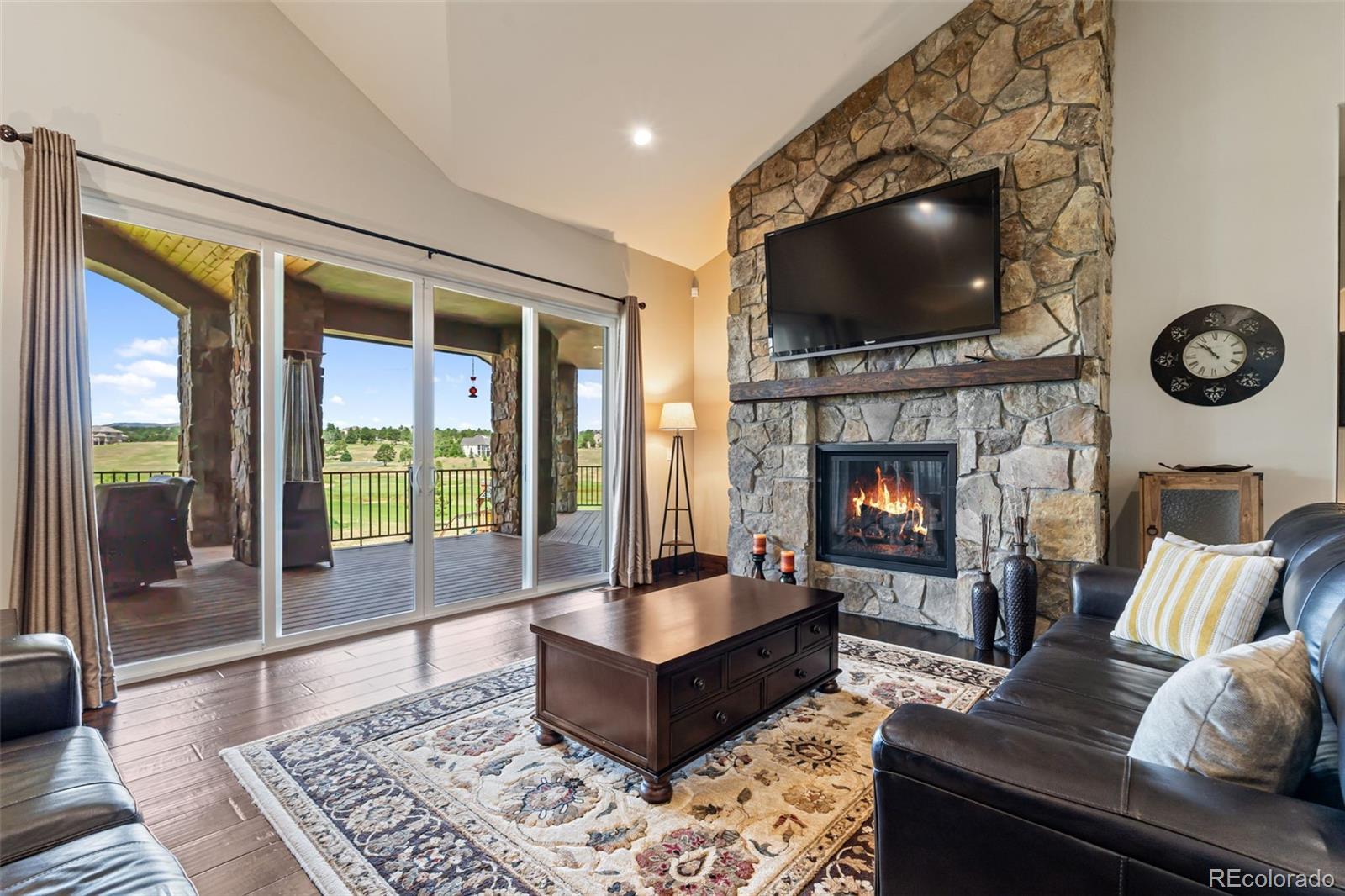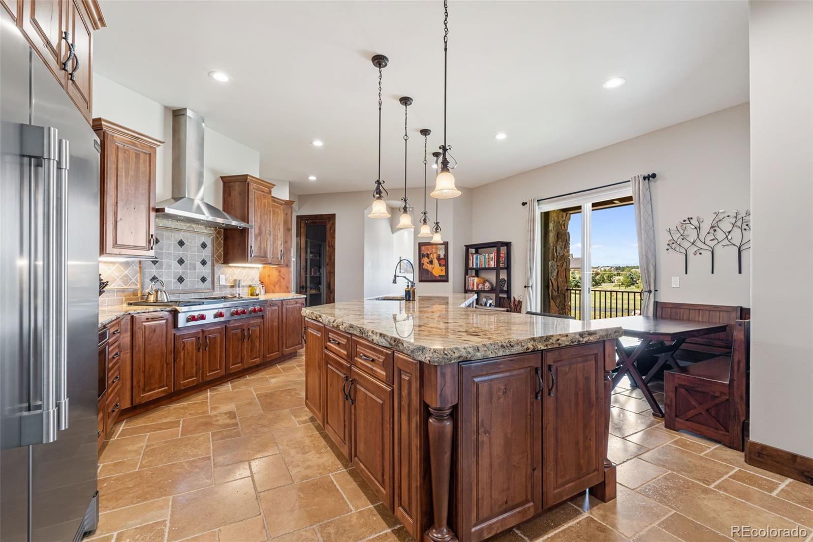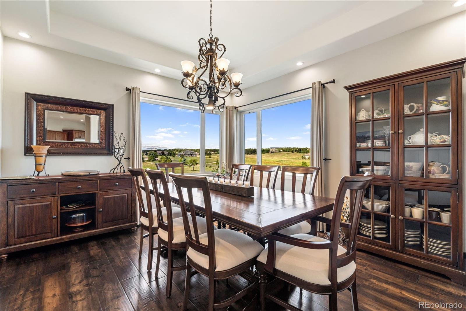 Experience luxurious Colorado living in this stunning ranch-style home with a walk-out basement, ideally situated on 2.75 acres along the 7th hole of the prestigious Kings Deer Golf Course. Enjoy breathtaking, unobstructed views of Pikes Peak from nearly every room in the house, featuring vaulted ceilings, a cozy fireplace, and expansive windows that flood the space with natural light. The main level offers four spacious bedrooms, including a lavish master suite with a private sitting room, dual walk-in closets, a fireplace w/ stone accents, a spa-like bathroom with a walk-in shower, and a jacuzzi tub. Entertain with ease in the formal dining room, or work from home in the executive office with custom built-ins. The gourmet kitchen is a chef’s dream, showcasing a large island, high-end appliances, and a Wolf gas range. The lower level is designed for entertaining and multi-generational living, featuring a full mother-in-law suite with its own entrance, full kitchen, two bedrooms, and bathroom. Additional highlights include a wet bar, theater room with 150” screen and tiered seating, and ample storage. Step outside to a covered patio with tongue-and-groove ceilings, perfect for enjoying Colorado’s beautiful sunsets. Practical upgrades include new exterior paint, dual furnaces, dual A/C units, dual water heaters, instant hot water, oversized septic, additional water rights, and an oversized 3.5-car garage with 220V EV charging. Smart home technology controls lighting, audio/video, alarm, cameras, sprinkler system, and garage doors. Located in a quiet cul-de-sac with panoramic views and every luxury amenity, this home is the perfect blend of comfort, functionality, and elegance.