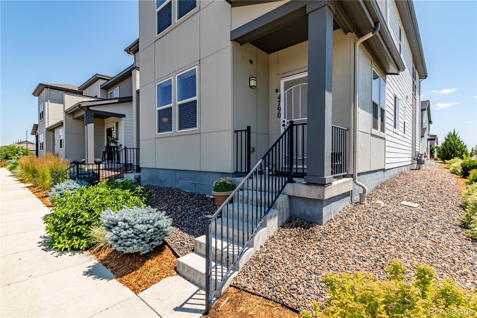 Bright, stylish, and impeccably maintained, this 3-bedroom, 3-bath end-unit townhome truly shines! Natural light fills the open-concept living space, creating a warm and welcoming vibe that flows right into the modern kitchen—complete with a large center island, gray shaker cabinets, stainless steel appliances, and granite countertops, perfect for both entertaining and everyday living. Storage and a powder room between the garage and kitchen make this home super functional. Upstairs, the spacious primary suite features an en suite bath and walk-in closet, while two additional bedrooms provide great flexibility for guests, a home office, or hobby space. An upstairs laundry adds everyday convenience, and the attached two-car garage makes parking and storage easy. Located in a desirable location near The HUB Community Center, Costco, 7 Brew Coffee, parks, and with quick access to DIA, this move-in-ready end unit also includes a Ring camera and window alarms for added peace of mind. Brand new roof 2025. Fresh, functional, and with a “feels new” appeal —this one is ready to welcome you home!