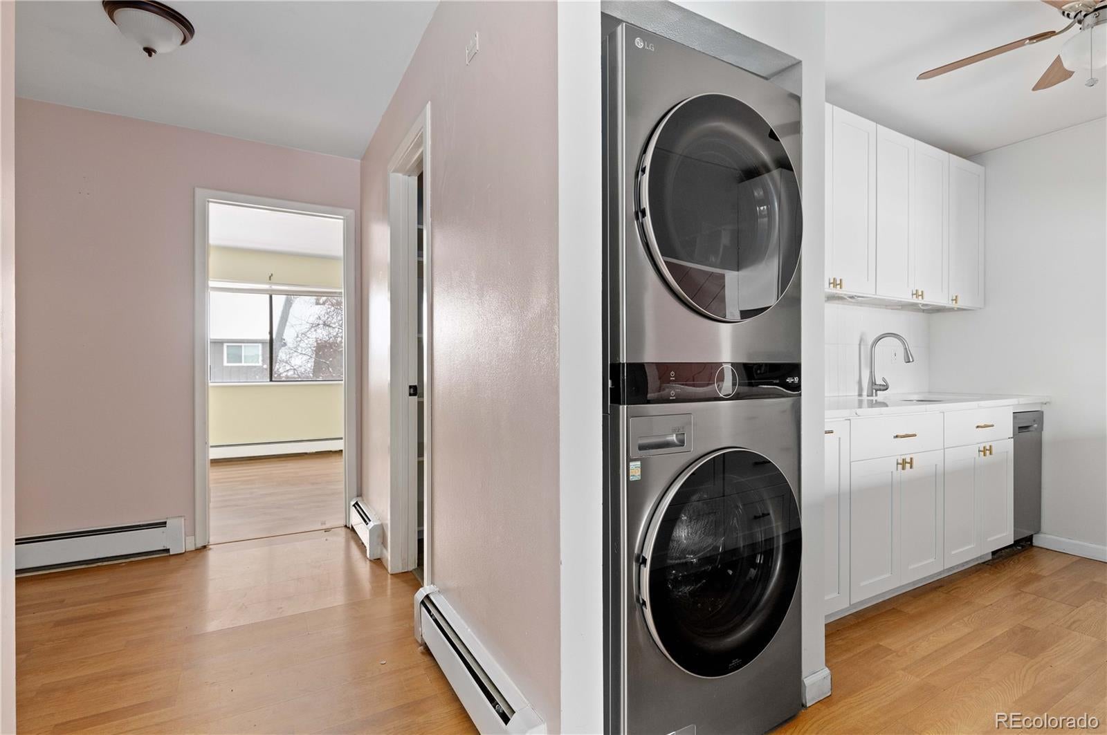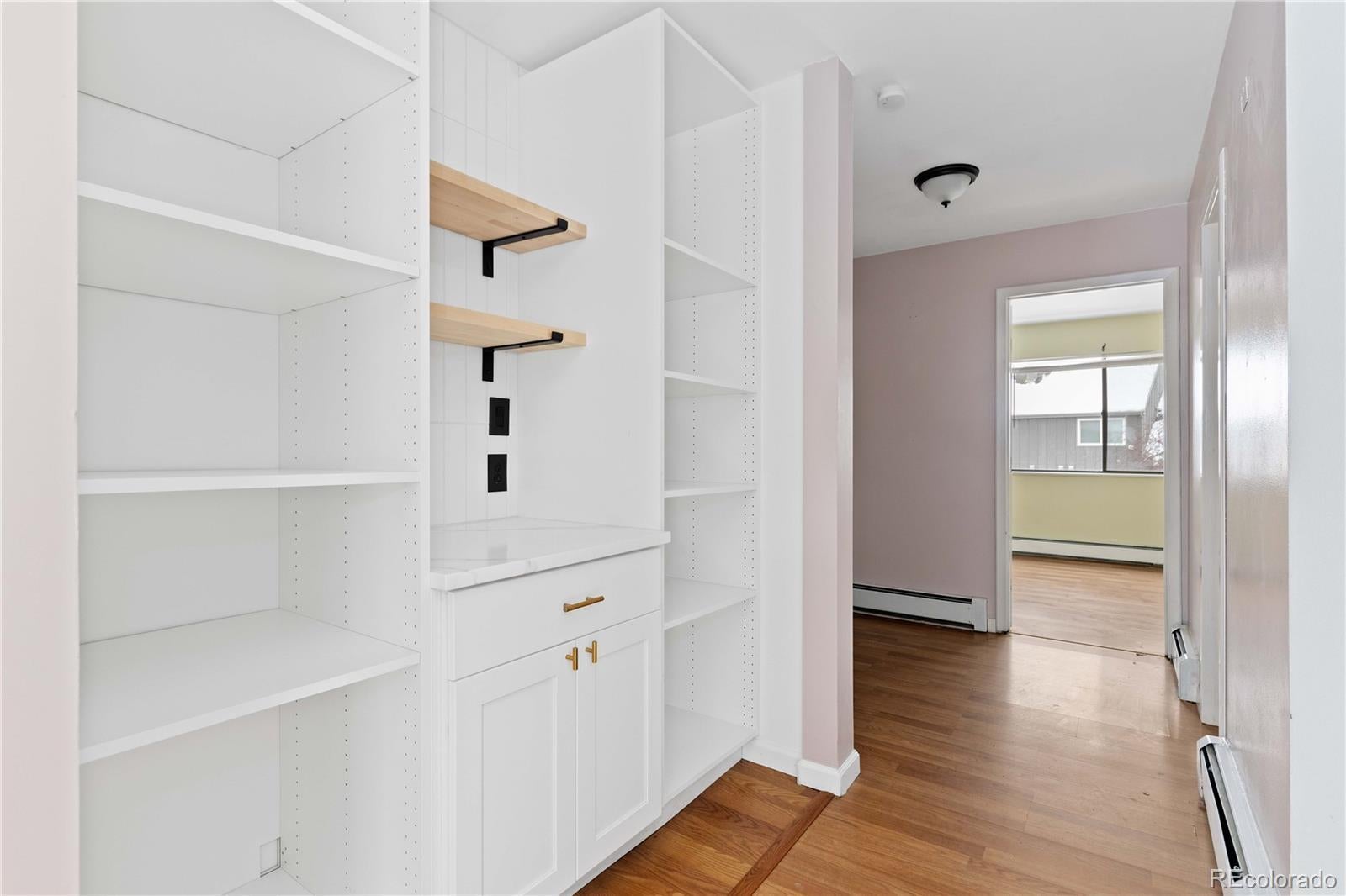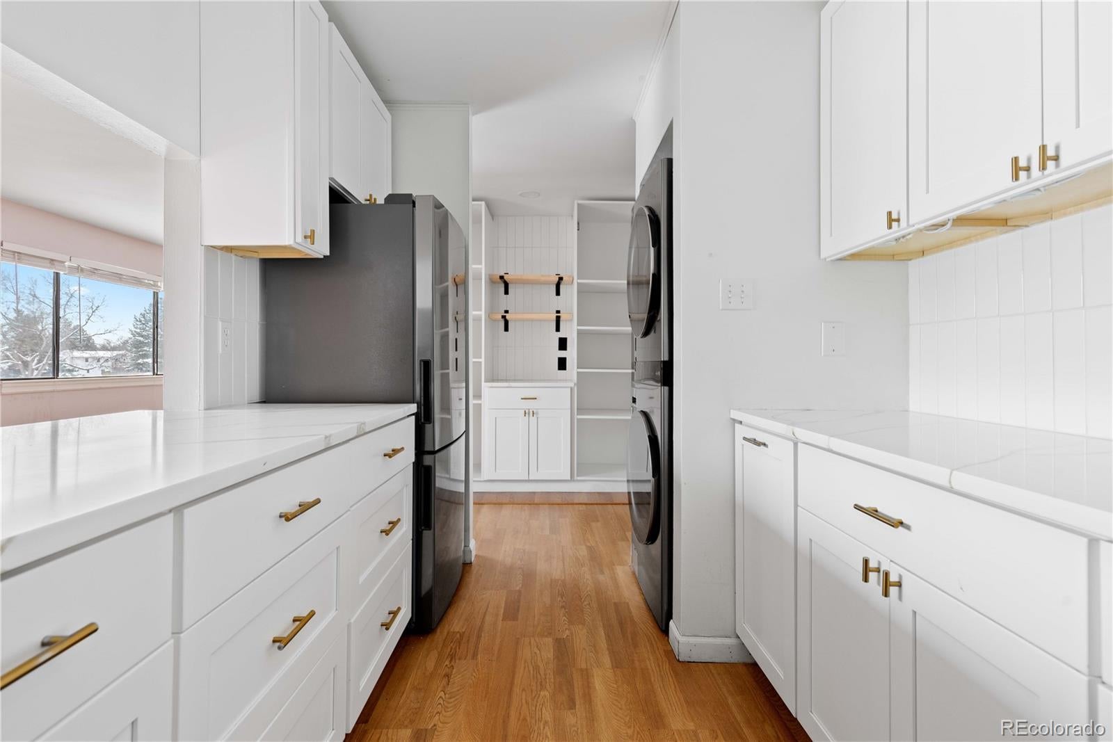 Discover this beautifully remodeled 2-bedroom, 1-bath condo in a prime mid-town Fort Collins location—just minutes to Old Town and Colorado State University. Sitting on the desirable second floor with no neighbors above, this move-in-ready gem backs to peaceful open space for added privacy and scenery. Step inside to an inviting, freshly updated interior. The sleek, modern kitchen features brand-new quartz countertops, stainless steel appliances, ample white Shaker cabinetry with chic hardware, and a convenient pass-through window to the dining area—perfect for effortless entertaining. The dining room shines with a stylish wood accent wall, built-in storage, and direct access to a nice-sized balcony overlooking open space and community amenities. Both spacious bedrooms offer walk-in closets, while the beautifully designed full bathroom impresses with a quartz-topped vanity, subway tile surround, and elegant tile details in the tub and shower. Additional new hallway built-ins create even more functional storage. Newer easy-to-maintain laminate flooring throughout. With low HOA dues and access to great amenities, this Fort Collins condo delivers modern comfort, convenience, and value in one thoughtful package. Ready for you to move right in and enjoy!