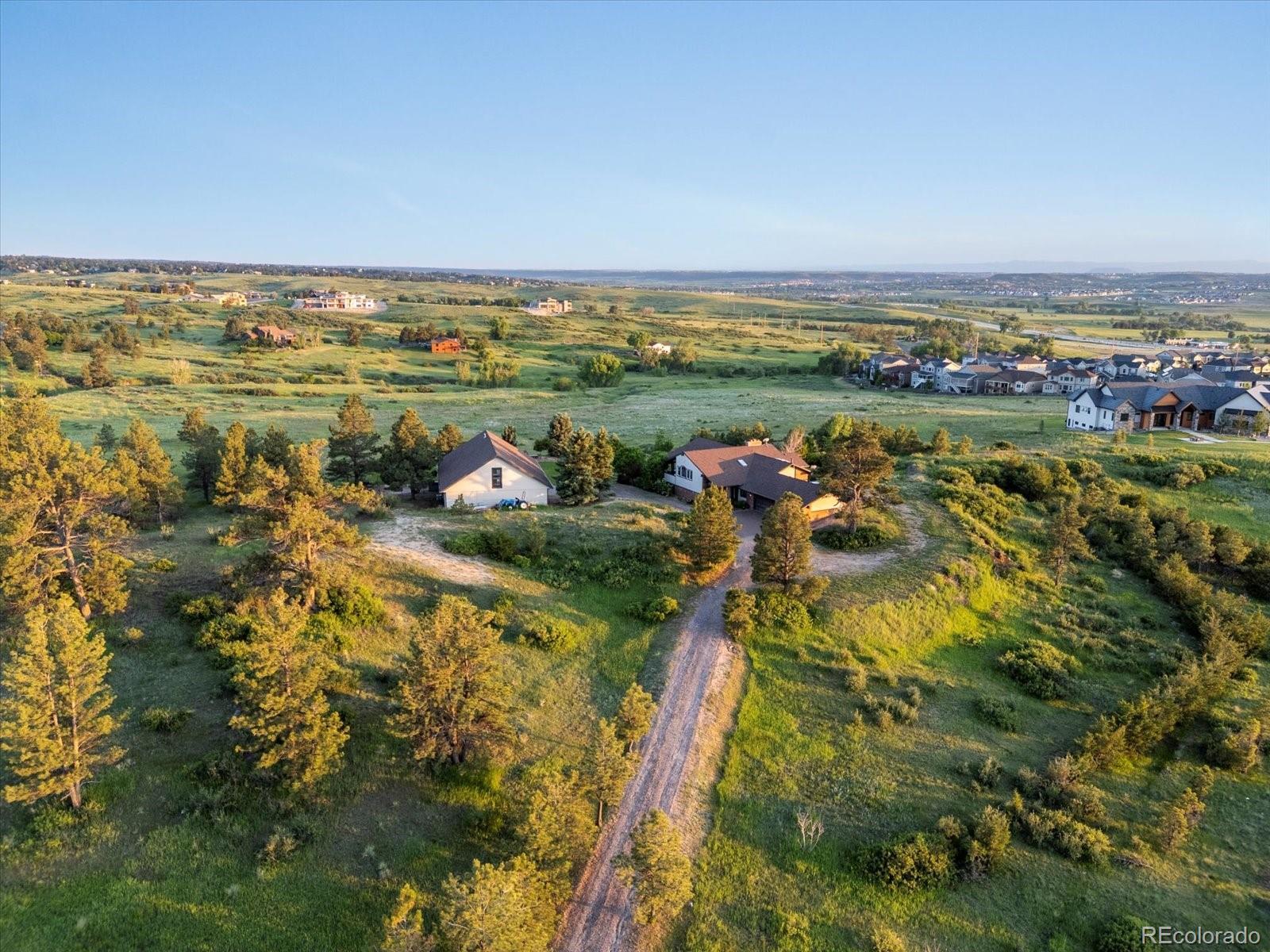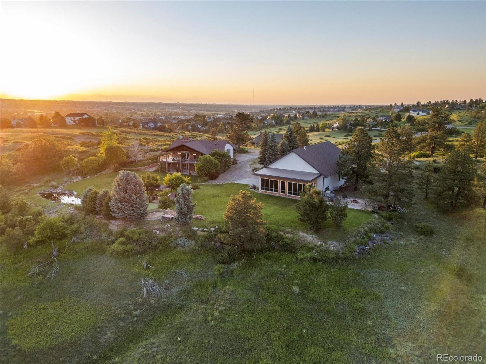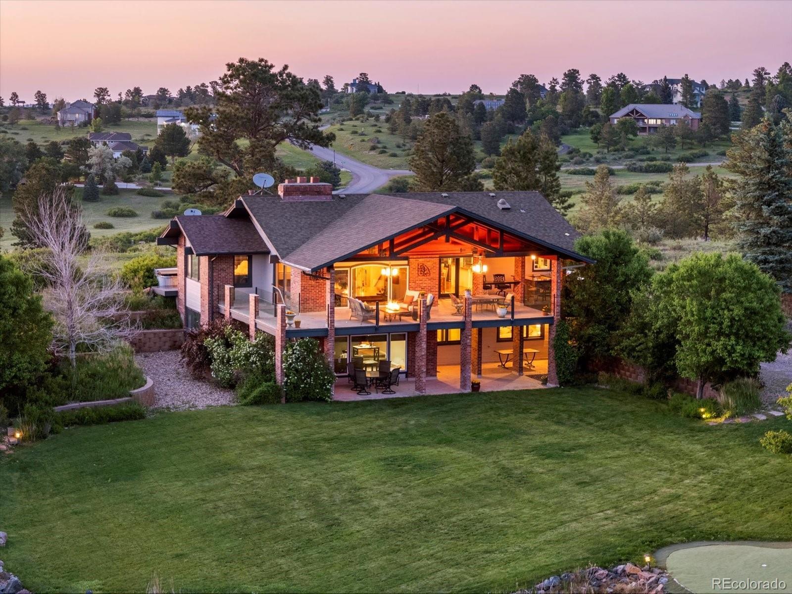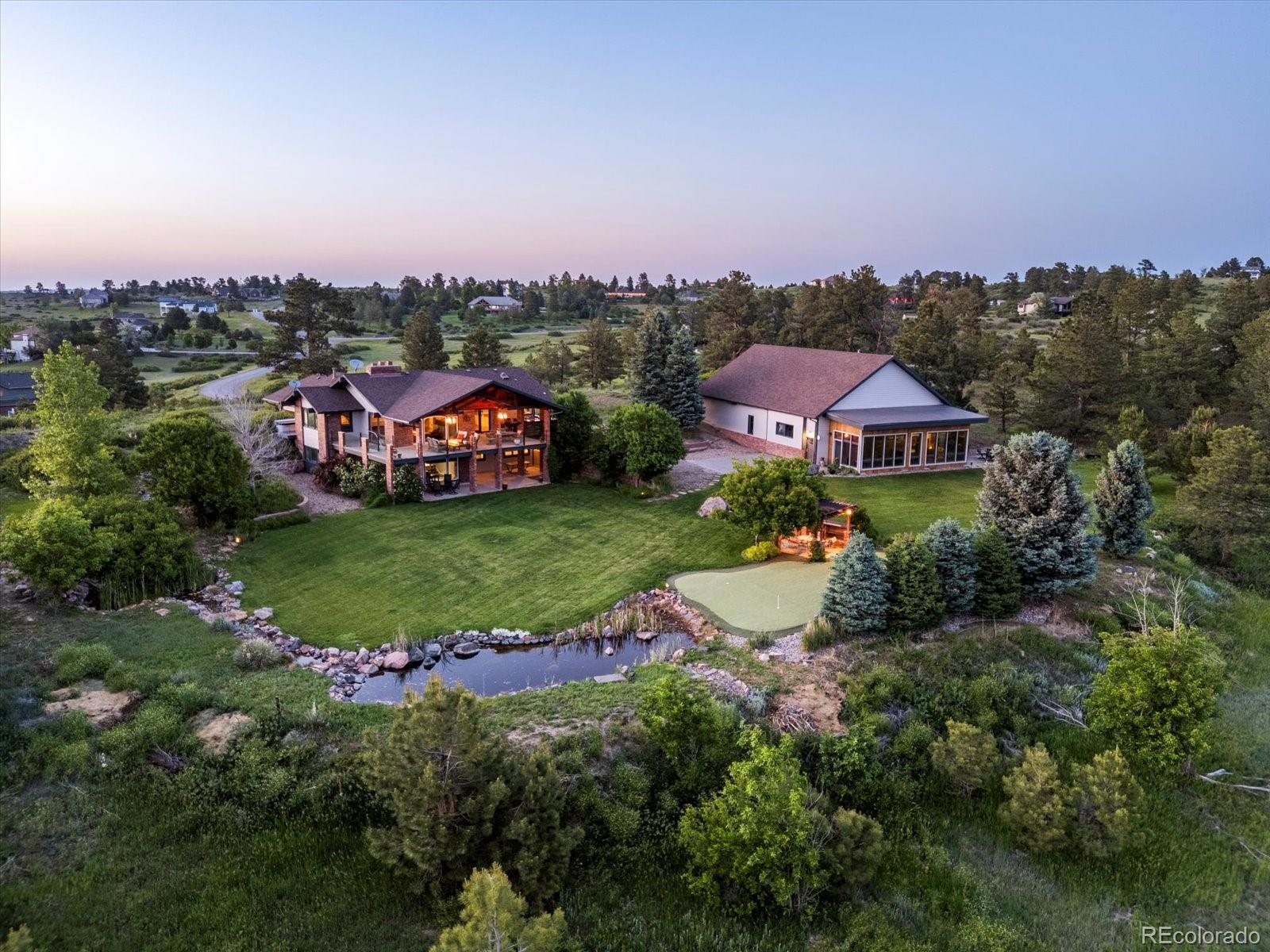 Welcome to your exceptional Parker estate, where luxury meets lifestyle. Perfectly positioned on 5 meticulously maintained acres and backing to 35+ acres of protected open space, this property offers rare privacy, a natural buffer, and frequent visits from Colorado wildlife. From your doorstep, take in breathtaking mountain views, stretching from the majestic Pikes Peak to the south and the iconic Sleeping Indian to the west. Designed for both living and entertaining, the 3,208 sqft residence features an expansive kitchen with leathered stone counters, Wolf induction cooktop, large island, and seamless flow to a covered deck—perfect for gatherings or quiet mornings with mountain views. The main floor primary suite is a true escape with spa-inspired bath, dual walk-in closets, and private deck access with hot tub. The lower level offers three bedrooms, a full bath with double vanity, and a spacious family room with bar and walk-out access to the outdoor living areas. A 3-car attached garage with concrete drive provides ample parking and storage. Step outside to your personal oasis: lush lawns, koi pond, custom putting green with pergola lounge space, multiple decks and patios, and a firepit for evening relaxation. A 2,400 sq ft climate-controlled outbuilding provides endless flexibility—RV storage, workshop, or hobby space—plus an attached 700 sq ft art studio that inspires creativity at every turn. With soaring ceilings, expansive windows framing the surrounding pines and mountain views, and thoughtfully designed workspace, ideal for artistic pursuits, crafting, or even a quiet retreat to recharge. You’re just 5 minutes from downtown Parker dining, shopping, healthcare, etc, with easy access to I-25 & E-470. This spacious, quiet neighborhood boasts well-maintained access roads and prompt snow removal, ensuring year-round ease. Also minutes from the prestigious Colorado Golf Club & The Pinery Country Club, offering world-class golf and social amenities.