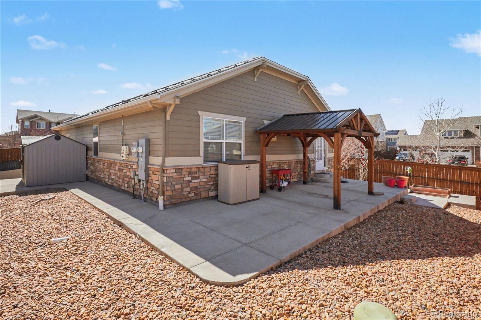 Welcome to this immaculate ranch-style residence on a premier corner lot in the highly desirable Traditions community. This open-concept floor plan is flooded with natural light and features elegant granite countertops and sleek stainless steel appliances—perfect for effortless entertaining. *** MASSIVE VALUE-ADD *** The solar panel system is FULLY OWNED and PAID IN FULL, offering significant, immediate savings on monthly utility costs! The professionally finished basement provides incredible versatility as a spacious guest suite, a secluded home office, or a private fitness studio. Outdoor enthusiasts will love being just one block from the community park and pool. Unbeatable location just minutes from Buckley Space Force Base, the Anschutz Medical Campus, and Southlands shopping/dining. Seamless commuting via E-470 and I-70. Modern efficiency meets a prime Aurora location—this home is truly move-in ready!