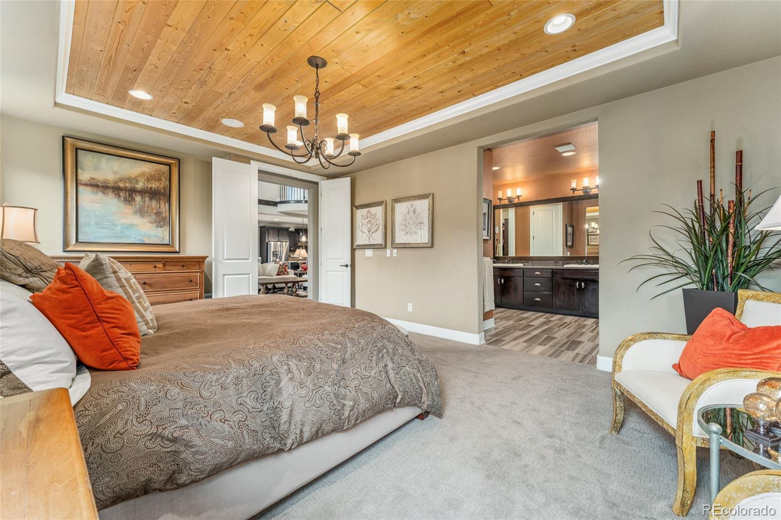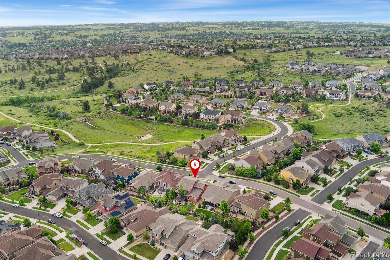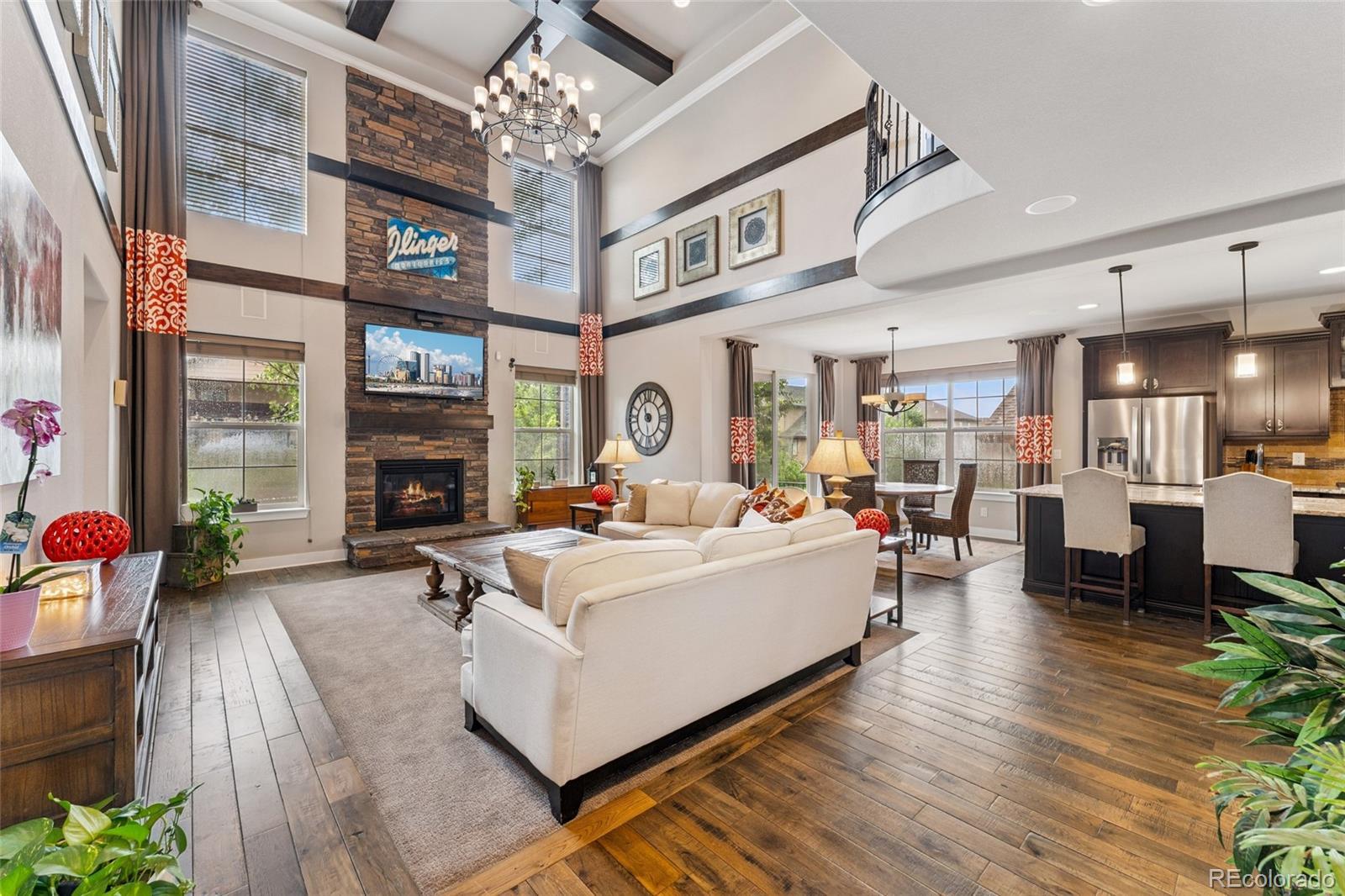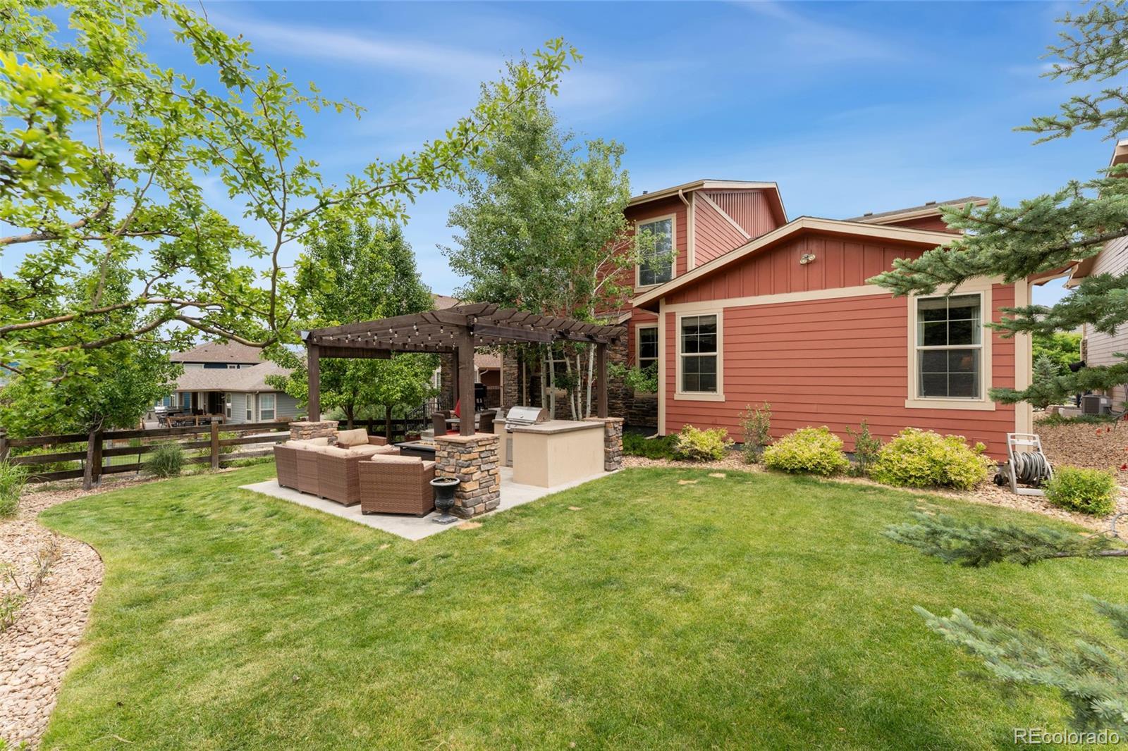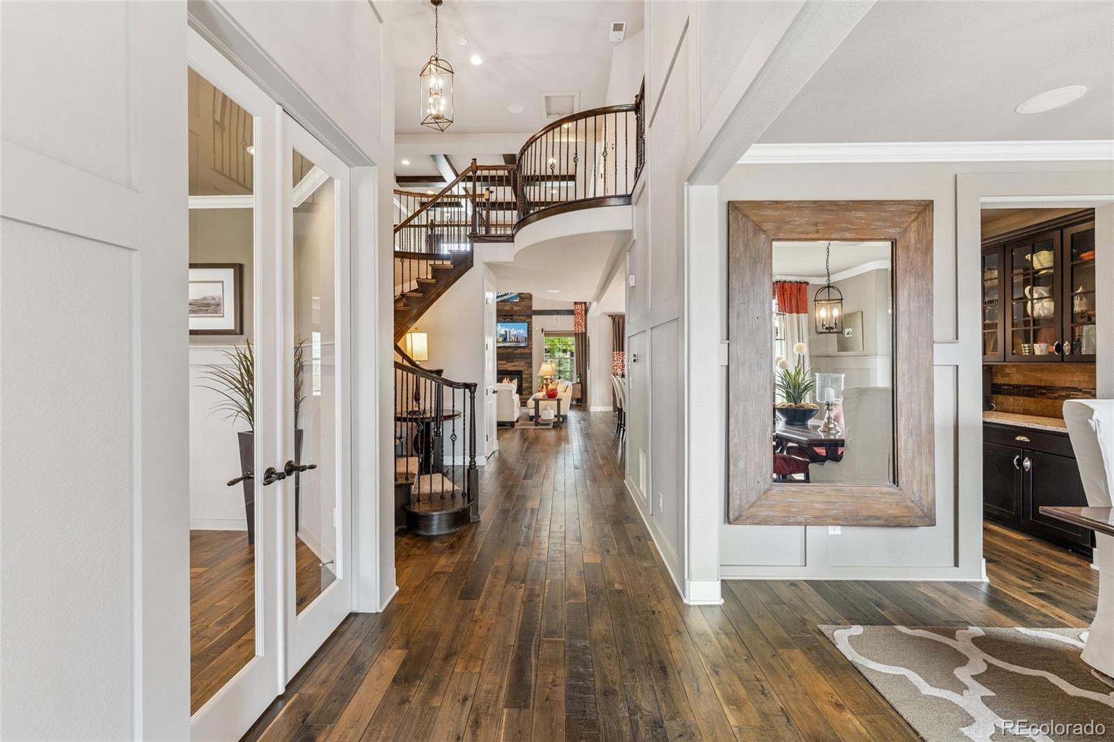 This former Toll Brothers model home makes a striking impression from the moment you arrive, showcasing impeccable design, timeless craftsmanship, and exceptional upgrades throughout. From the dramatic spiral staircase with oak end caps to rich solid hardwood floors and custom built-ins, every detail has been thoughtfully curated to elevate everyday living. A grand two-story foyer welcomes you into an open, flowing floor plan designed for both comfort and entertaining. At the heart of the home, the soaring two-story great room features exposed wood beams and a stunning floor-to-ceiling brick fireplace, creating warmth and character while flooding the space with natural light. The gourmet kitchen is a true showpiece, equipped with a gas cooktop, double ovens, built-in refrigerator, butler’s pantry, and an oversized walk-in pantry—perfect for gatherings or quiet evenings at home. Just off the kitchen, a beautifully appointed study features a custom granite desk and built-in bookcases, ideal for remote work or creative pursuits. The main-level primary suite offers a private retreat with an inlaid wood ceiling, luxurious five-piece bath, and walk-in closet with custom built-ins. Upstairs, a versatile loft provides flexible space for a recreation room or lounge area. The finished basement expands the home’s livability with ample room for movie nights or game days, plus a stylish wet bar for effortless entertaining. Outside, the fully landscaped backyard offers a built-in gas grill for easy al fresco dining. Additional highlights include a functional mudroom, laundry room with extra cabinetry, and a spacious 3-car tandem garage. Ideally located steps from scenic trails with sweeping views and access to the neighborhood pool, clubhouse, and nearby coffee house, this home blends luxury, comfort, and community close to downtown Parker and the DTC.