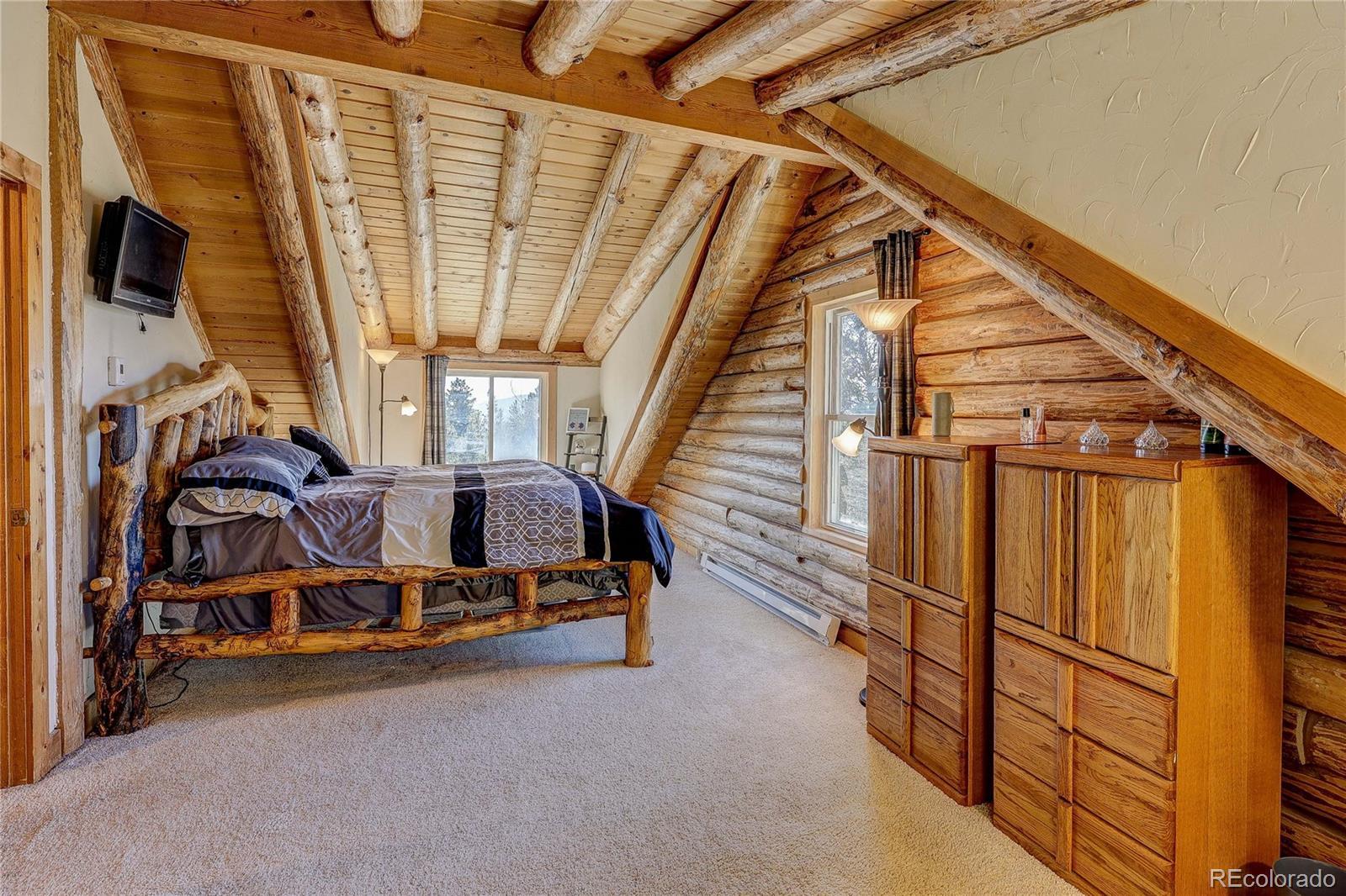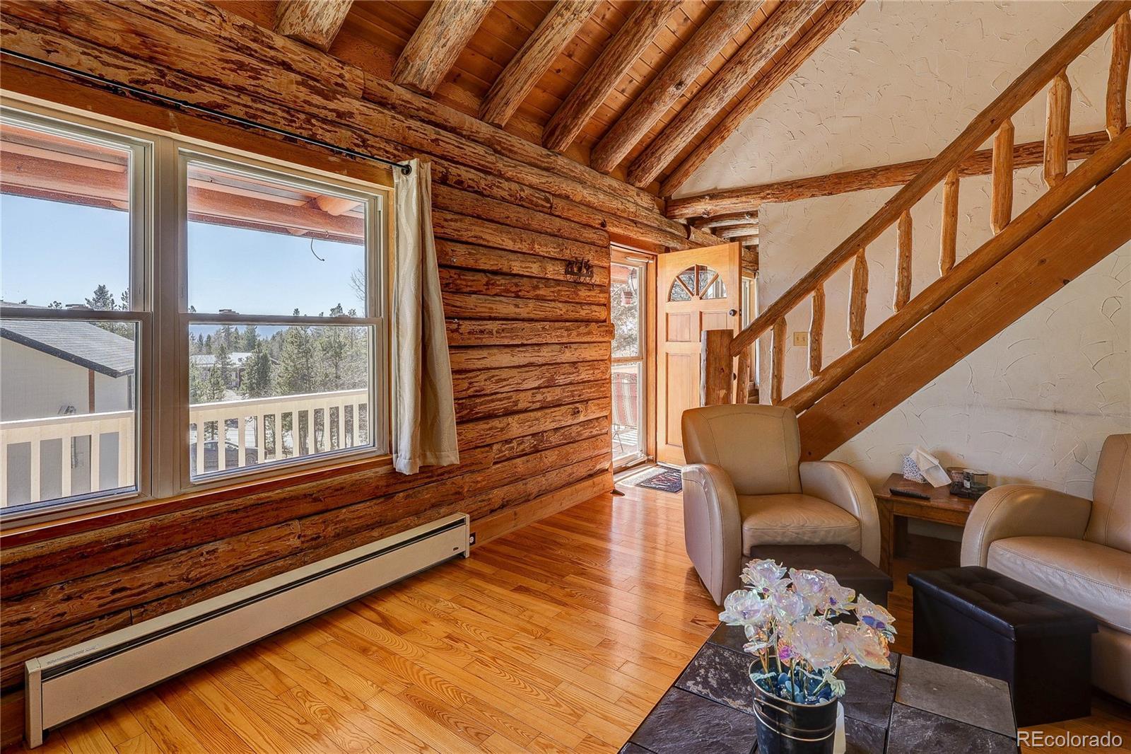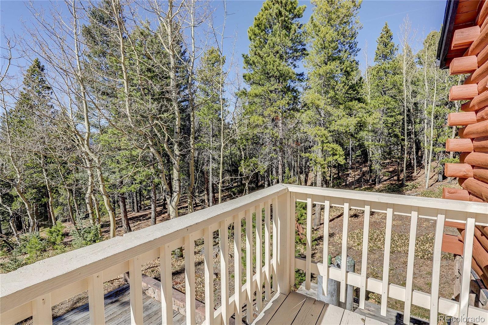 Beautiful log home with panoramic views! Pride of ownership with thoughtful updates and meticulous maintenance. A sunny, South facing, paved driveway with beautiful aspen trees welcome you to this immaculate 4 bedroom, 3 bathroom home, on 2+ acres with picturesque views of Staunton State Park, plus more! There is an amazing, finished living space above the garage that could be ideal for an office, workshop, yoga or dance studio, etc.! The space above the garage includes a pellet stove and a closet. This charming mountain home’s high end features include a Coleman Generator Powermate 6250 Watts, a 1-year old roof, and Champion Windows with warranty. The bright living room features a vaulted ceiling and one of the home’s two additional pellet stoves, creating a cozy space. The inviting dining area adjacent to the kitchen is perfect for easy living and entertaining. The kitchen also includes its own balcony. Enjoy the magnificent mountain views from the deck accessible from the living area. The main floor also includes a bedroom, and an updated ¾ bathroom. The walk-out lower level features the bright family area with a pellet stove, and access to the large patio. The lower level also includes a bedroom with beautiful built-in shelving and a walk-in closet, an updated ¾ bathroom, and the utility/laundry area. The upper-level features two additional bedrooms, including the primary room, and a full bath. Immerse yourself in the Colorado lifestyle on your large patio, with a stunning atmosphere and abundant wildlife. Close to 285 for convenience, 1 minute to the local firehouse, and the school bus picks up at the end of the driveway. Total square footage includes the finished space above the garage. Welcome to your Colorado dream home!