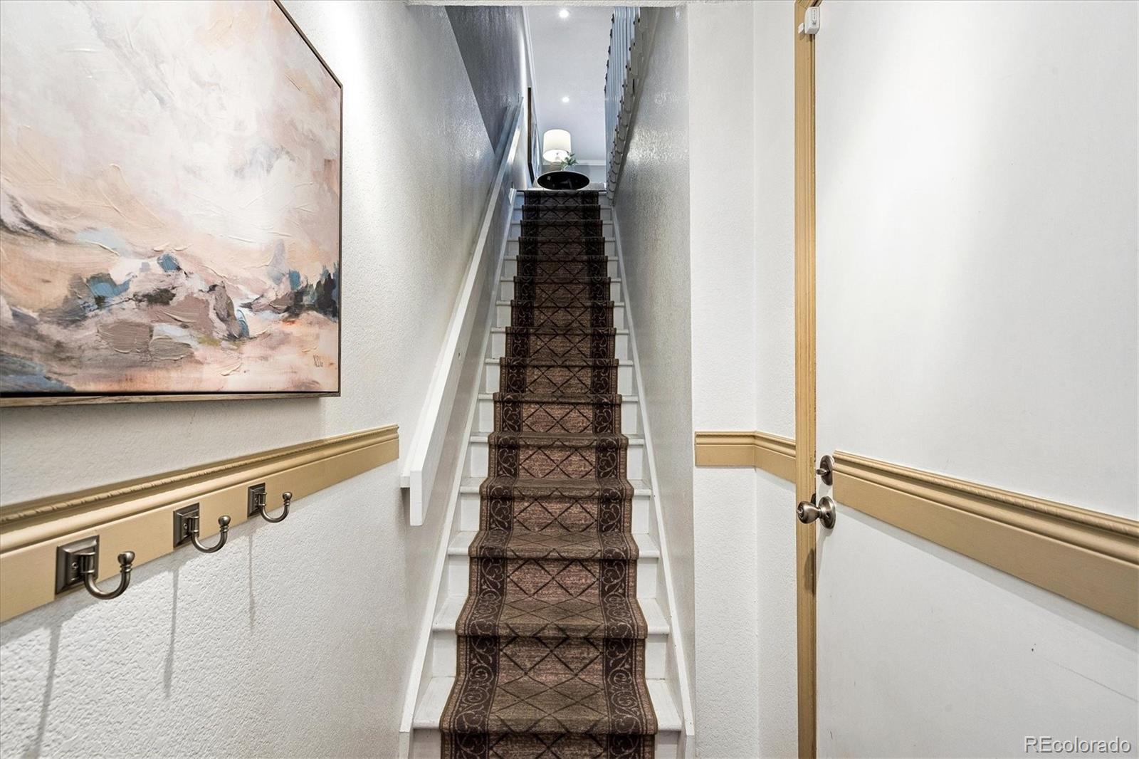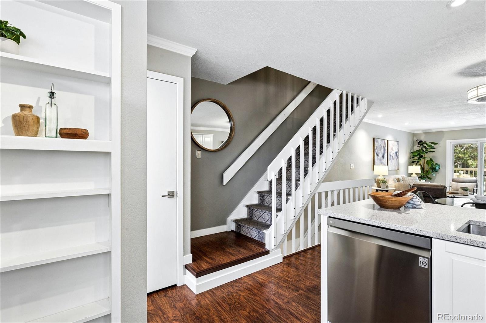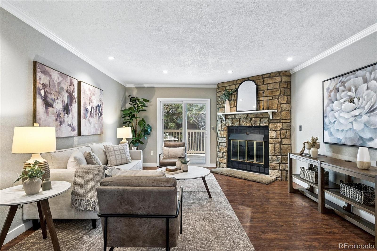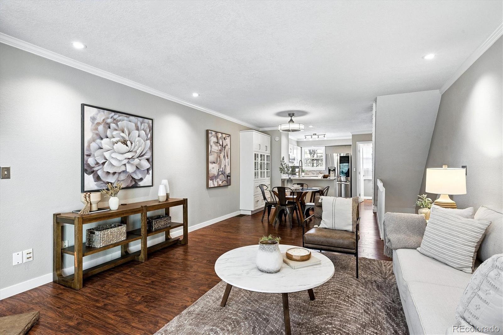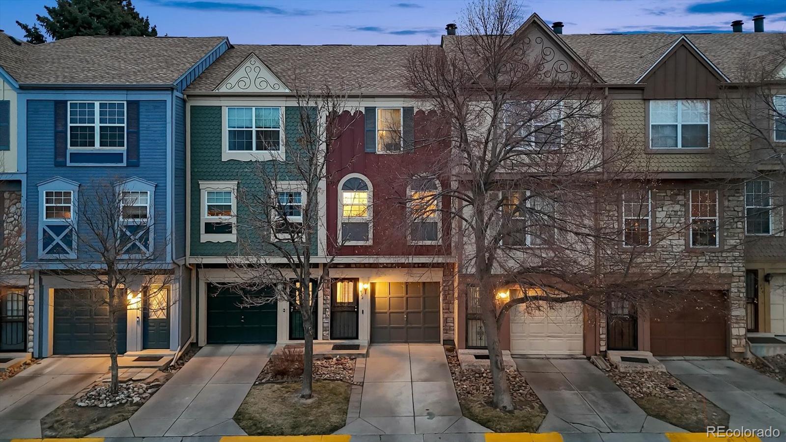 Simply the Best! Refined & Smart Updates in this 2 Bed, 2 Bath townhome with Attached Garage in desirable Peachwood community. Feeds to Cherry Creek Schools! Great location within neighborhood near the end of only no-outlet street for minimal traffic flow. Enter to find extensive low maintenance engineered hardwood flooring & upgraded baseboards throughout most of the home. Take a peek at the mountains from the front windows! Flowing floorplan with Great Room living & sizeable rooms has tasteful crown molding throughout the main level. Fall in love with the semi-custom, remodeled kitchen with expanded footprint & peninsula - rare in this price range! Kitchen boasts upgraded soft-close cabinets w/lower drawers, extensive Silestone counters & stylish tile backsplash, high-end stainless steel appliances. Also added: built-in wall shelves, large built-in cabinet/hutch & over/under cabinet lighting. Expanded peninsula has upgraded sink w/pro faucet & bar seating; opens to Dining area with newer light fixture. Family Room features new recessed can lighting, corner wood-burning fireplace & access to recently upgraded, private deck- custom extended size with added stairs & gate - unique to this property! Main floor 1/2 Bath is tastefully updated. Upstairs find the Primary Bedroom w/peaked ceiling & fan, large wall closet & door to updated 4-pc Bath. Bed #2 has Brand New Carpet & large wall closet, fan. Head to the lower level to access the oversized/deep 1-car garage with included workbench & space for parking. Home sits across from guest lot for additional car. Laundry/Utility Room includes washer/dryer & utility sink plus more storage. Newer Features: Interior Paint, Double Hung Windows (Upper Fl), HVAC, Door Hardware, Water Purifier/Whole House Back Flush system. Excellent locality within walking minutes to grocery, shopping, services. Central to I225, DIA, Buckley SFB, DTC & Downtown. Easy 2 min walk to neighborhood pool without crossing larger roads. Buyer's Warranty!