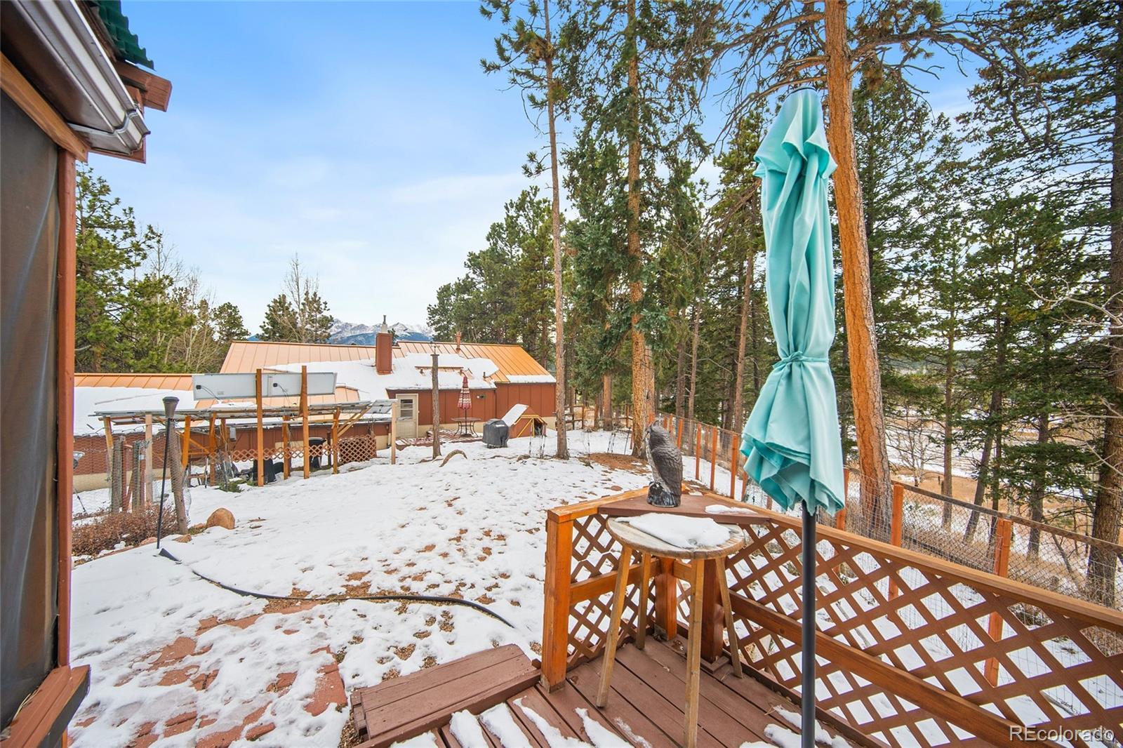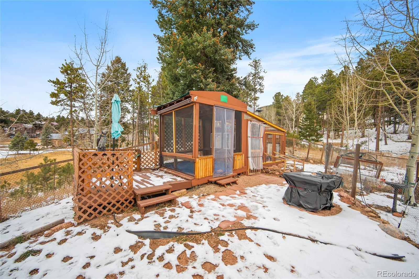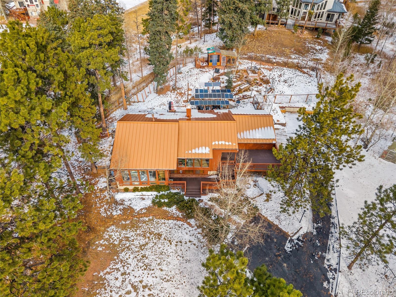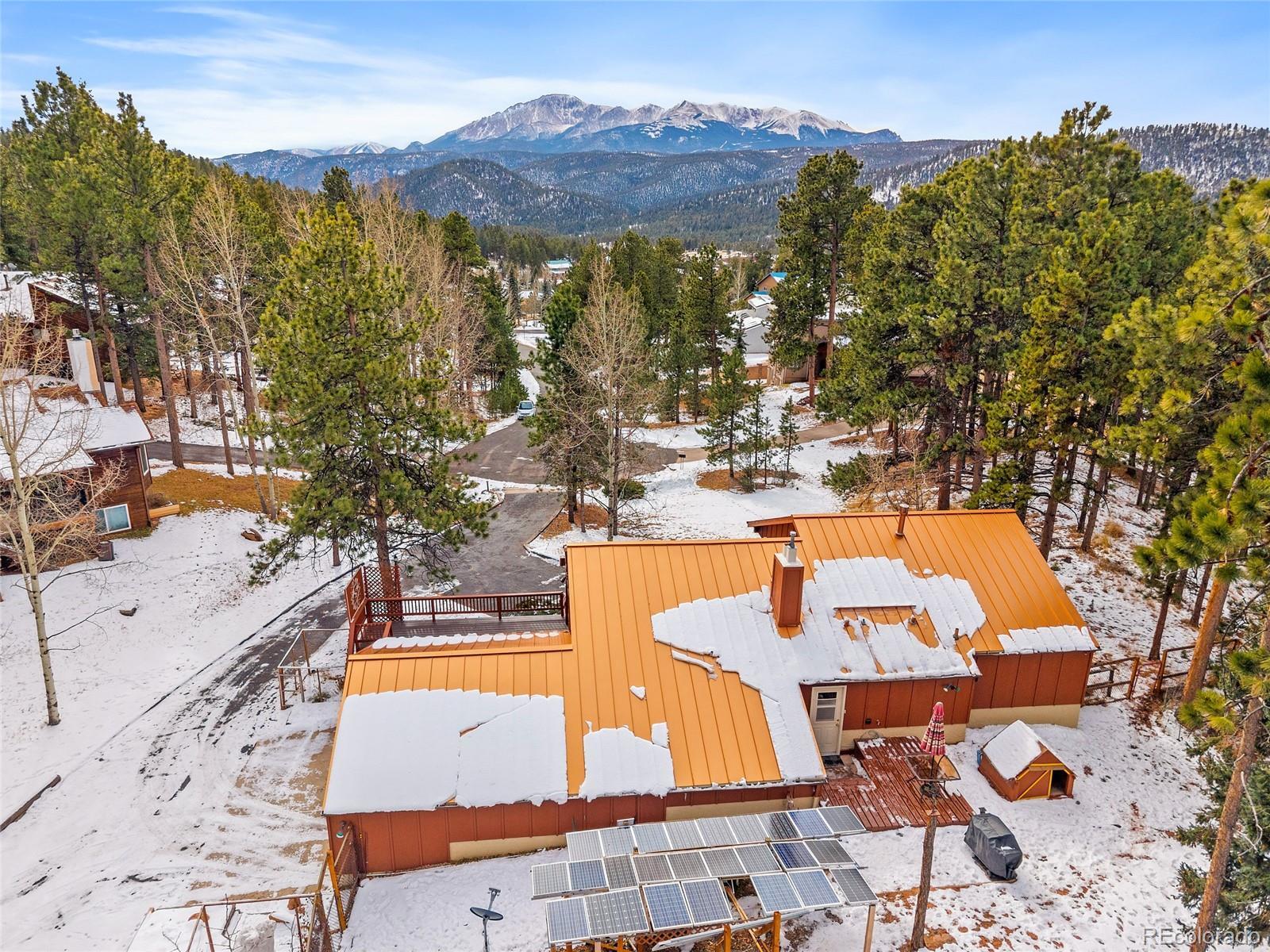 The owners of this property have poured there lives into this home and it truly shows. Centrally located and neighbor to Chimney park, this NO HOA, 2450 sq ft, 3 bed 2 bath home is ready to be yours! A country vibe with refined sense of comfort and connection to the Colorado outdoors. A true standout feature of the home is the Colorado esque wood exterior boasting large glass panes for Mountain views all throughout the home. Self sufficient on power with 28 solar panels, included.; Enjoy warmth, and unbeatable mountain scenery. Inside, the kitchen is hickory cabinetry, solid-core doors, new wood flooring, and a brand-new oven. The primary suite has dual walk-in closets and views toward Pikes Peak. The walk-out basement provides two additional bedrooms, a full bath, family/rec room, a cozy gas stove. The attached 2 car garage comes with 2 freezers and a fridge, a workshop area, utility sink, storage area, and bonus pantry space.Landscaped and fenced backyard featuring mature trees, abundant gardens, and a greenhouse/covered seating area. A rainwater cistern system for water collection and a solar setup with battery storage for electricity independance/efficiency. A new metal roof, freshly painted exterior, and paved driveway further enhance durability and curb appeal.This is mountain home is ready to be yours!