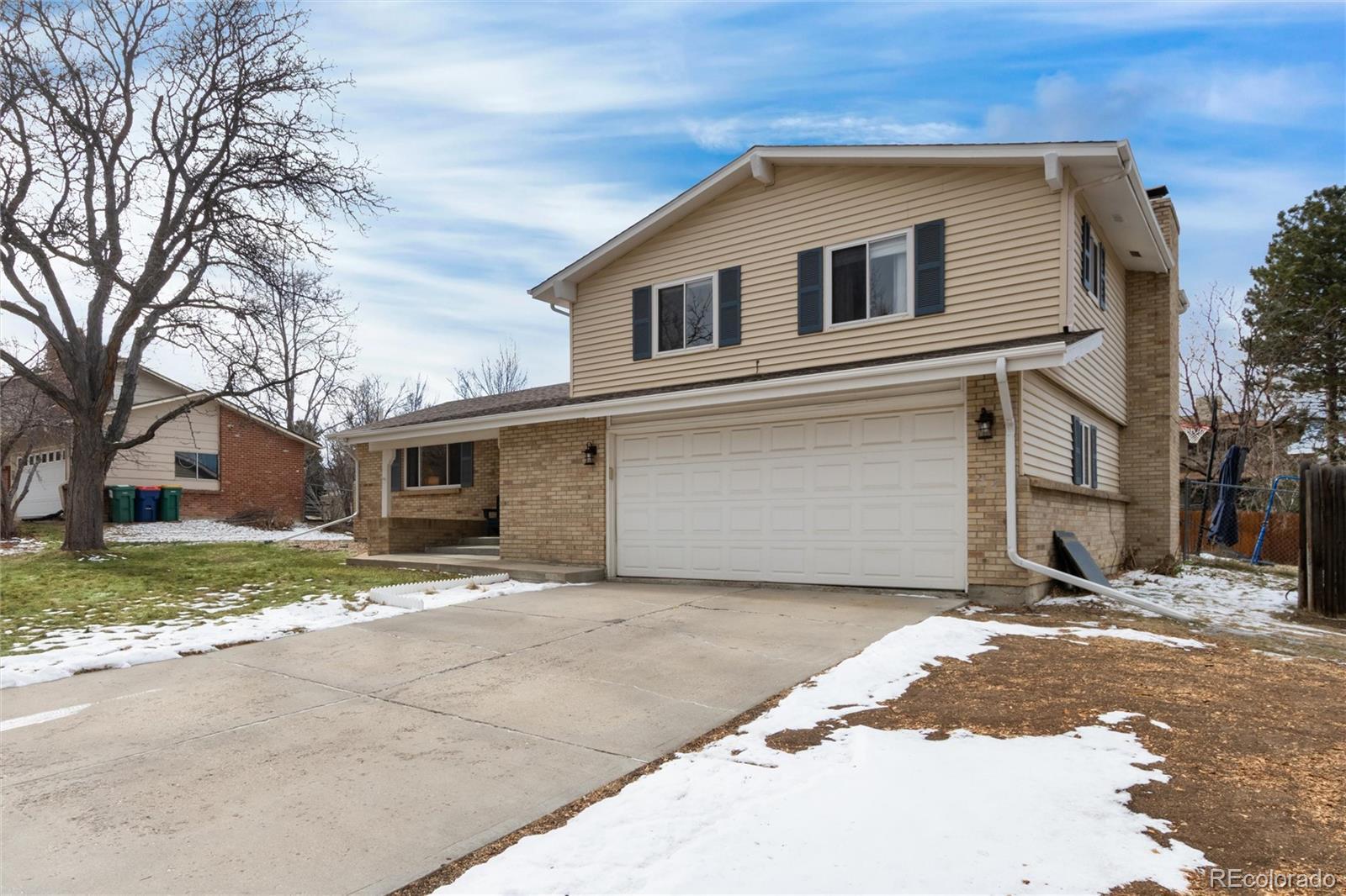 Columbine Hills Tri-Level Home with a Basement! Move-in condition with Kitchen and Bath updates. This home is located on a large lot offering a park-like backyard with a lg. covered patio where the roof blinds open and close adding a nice comfort feature. The privacy curtains allow you to enjoy this outdoor space throughout the year, no matter what the weather. There is also a frisbee golf hole for your enjoyment! This home also features an updated kitchen with granite counters, lots of cabinets, pantry, built-in coffee bar/buffet/serving counter, eat-in dining area and overlooks the family room. The Living room has a tiled entry, picture window and adjoins the dining room. Easy to care for laminate flooring throughout. The Family room is on the lower level with a brick wood burning fireplace and sliding glass doors to the covered patio and backyard. The lower level also has a guest bathroom, and access to the garage. The basement is unfinished and perfect for storage and currently has the washer/dryer hookup. Central Air Conditioning. Seller's will consider leaving the trampoline, pellet grill/smoker and all the patio furniture on the back patio. Set a showing today to see this terrific home.