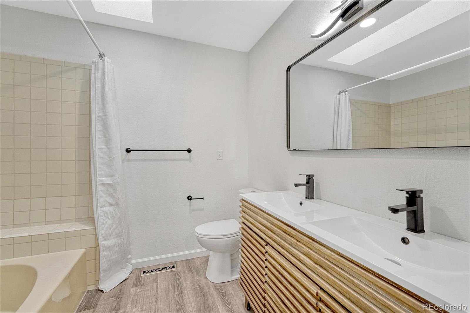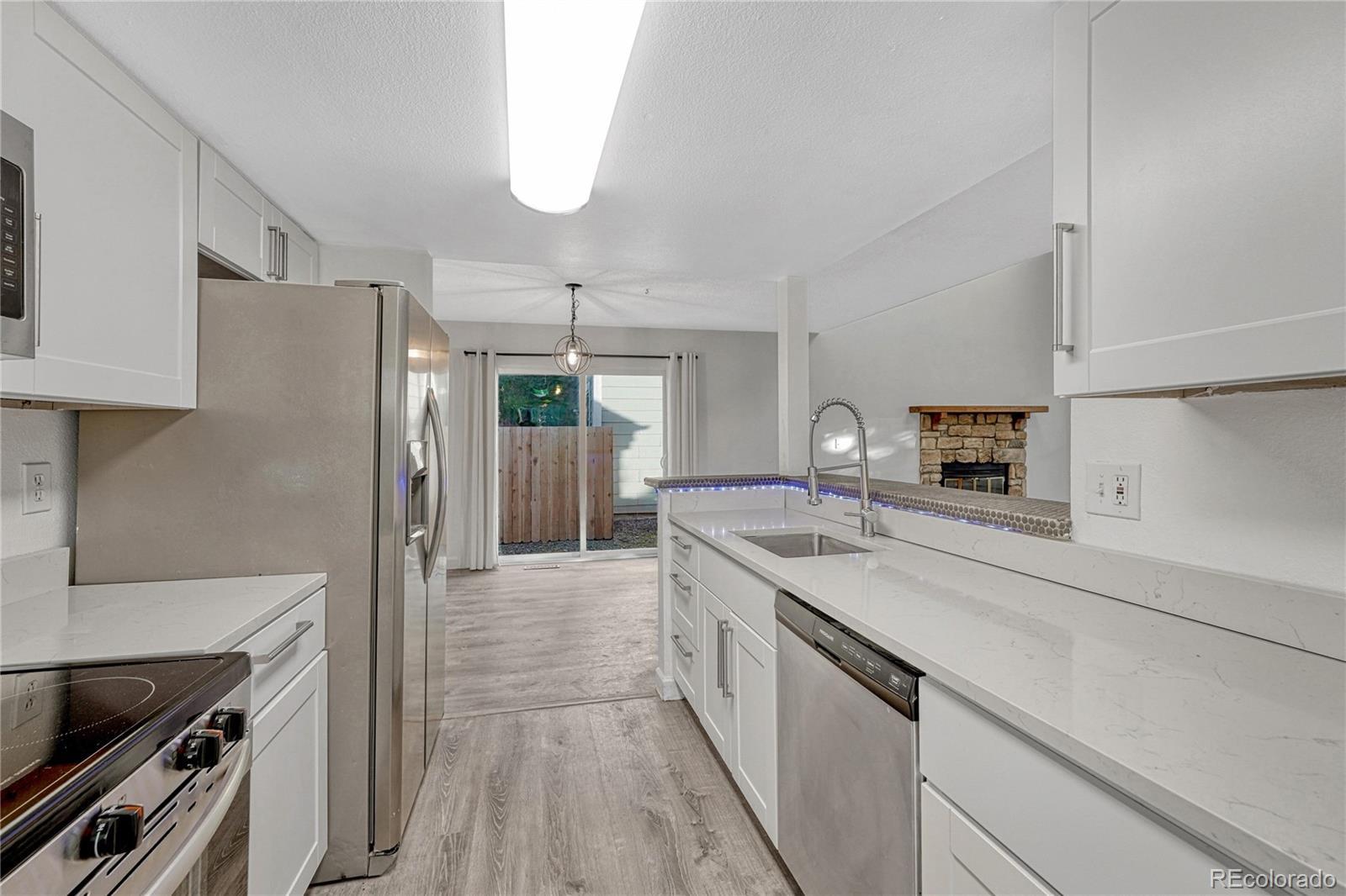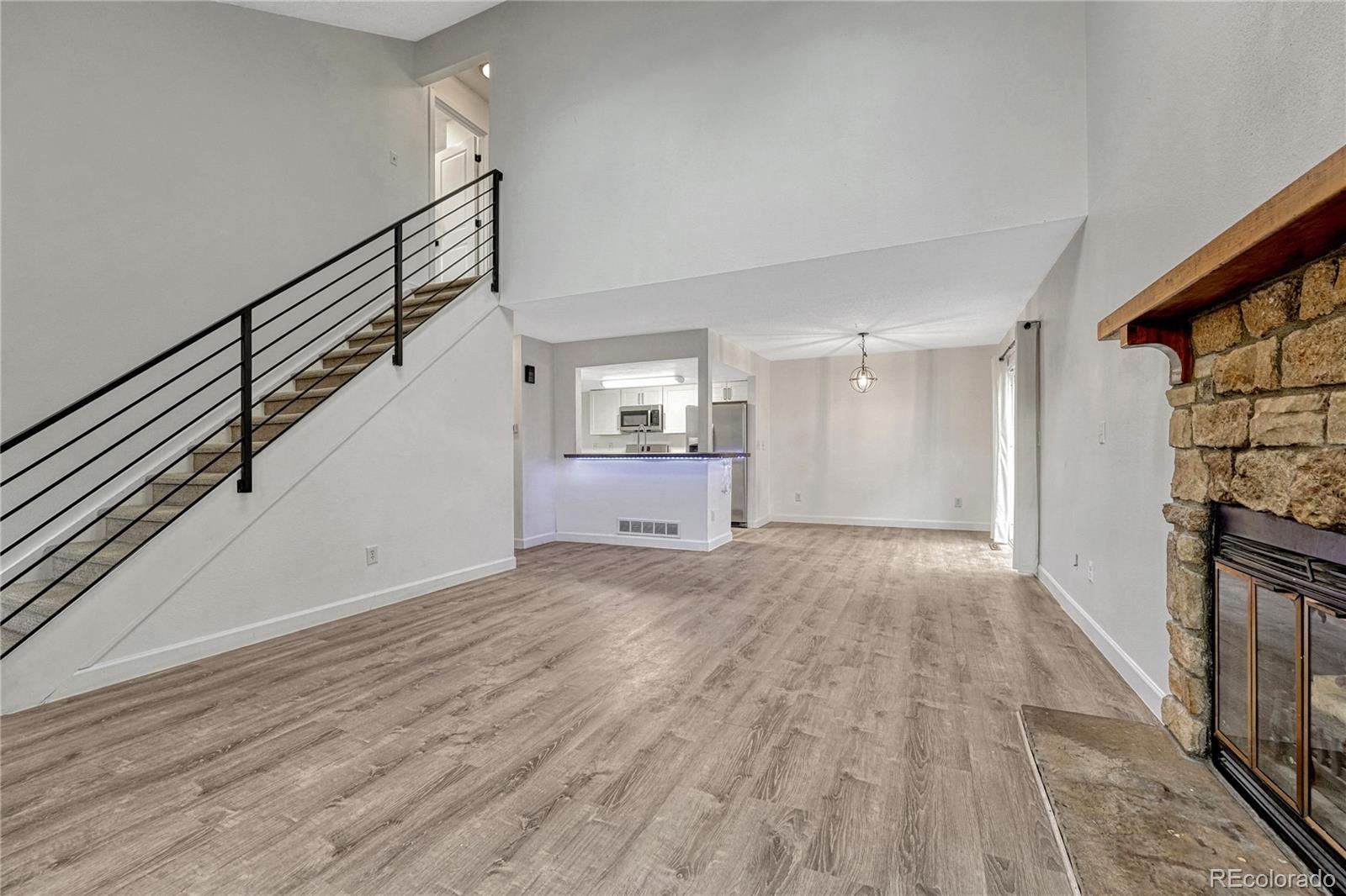 Here is your chance to buy a single family home with a small fenced in backyard/patio AND a basement. Walk to the grocery store, restaurants and public transportation. The Nine Mile Station (Park and Ride) is minutes away. This newly updated and renovated single family home has three bedrooms and three bathrooms. Dining room, family room with vaulted ceiling and skylights. Fireplace with stone front. The main floor has a bedroom or a study...very flexible space. Upstairs there are two large bedrooms...each with their own bath. The primary bedroom has an ensuite with a large tub and new vanity/ dual sinks. The second bedroom has an updated ensuite 3/4 bath. There is an updated powder bath on main floor. Newer windows, flooring, cabinets, appliances and countertops. New doors and hardware with a new vanity as well. There is NEW modern black staircase railing. The basement has 8 1/2 foot tall ceilings and a conforming window for an additional bedroom. Basement could easily have a bathroom making this a finished space that you could add value to your home. There is a large private backyard with new 6ft fence, a perfect space for kids or your fur baby. Located strategically to have easy access to I225 for a quick commute to DIA and DTC. Parents will love the schools as they are in Cherry Creek School District.