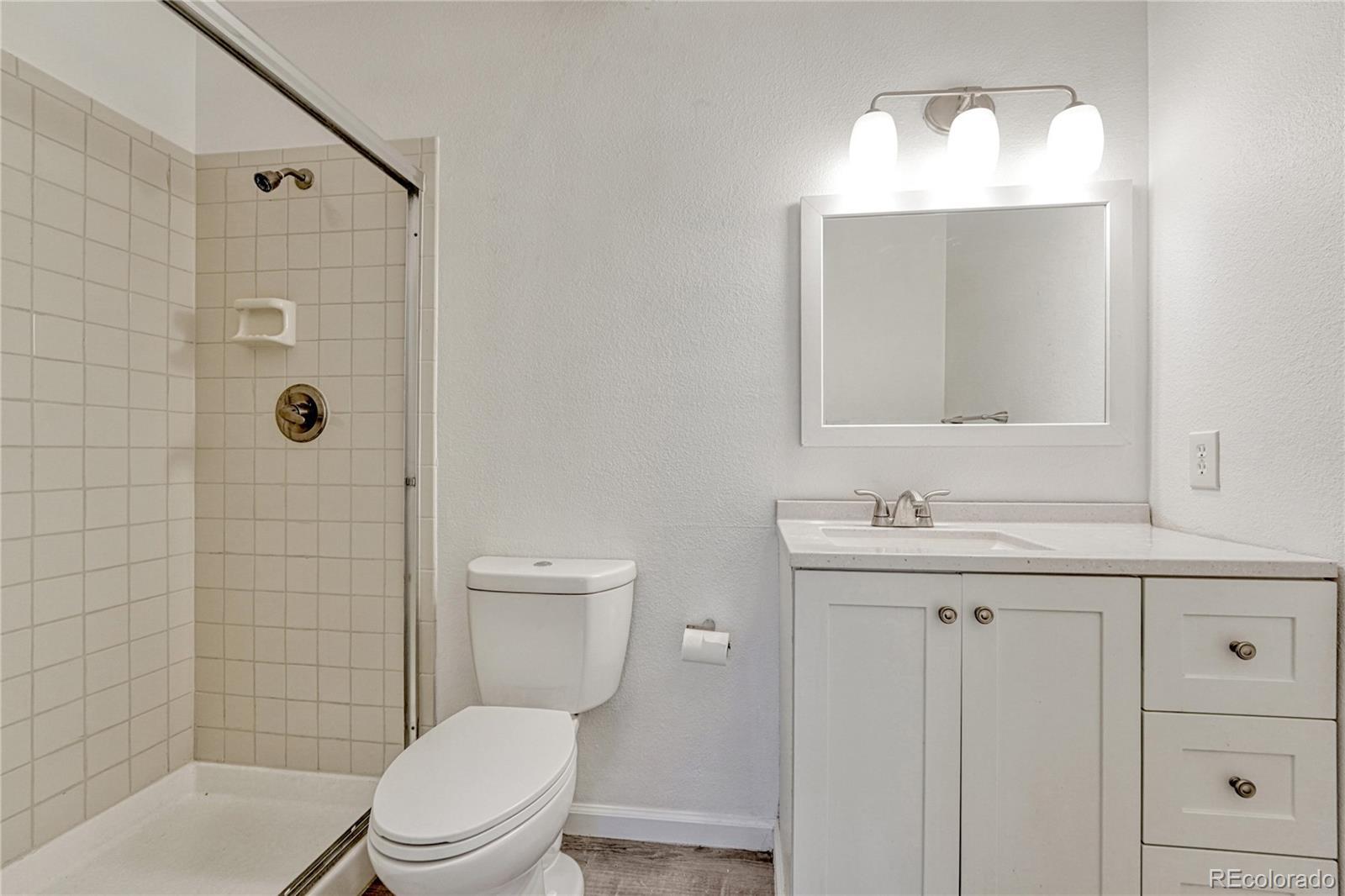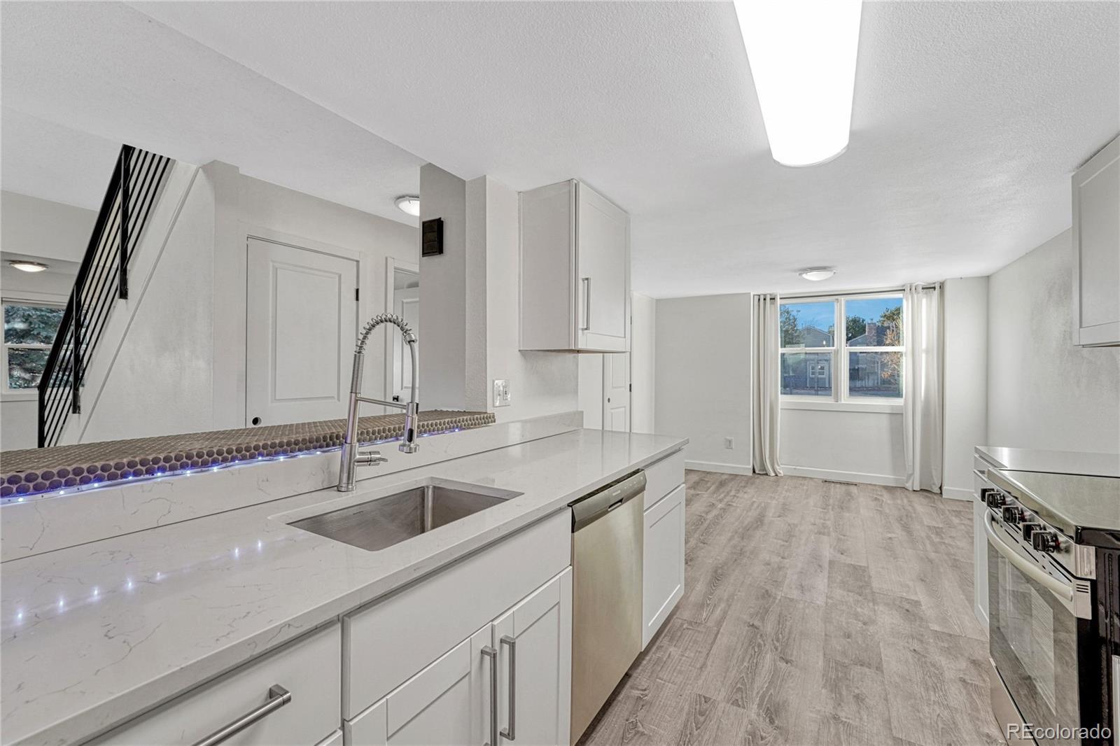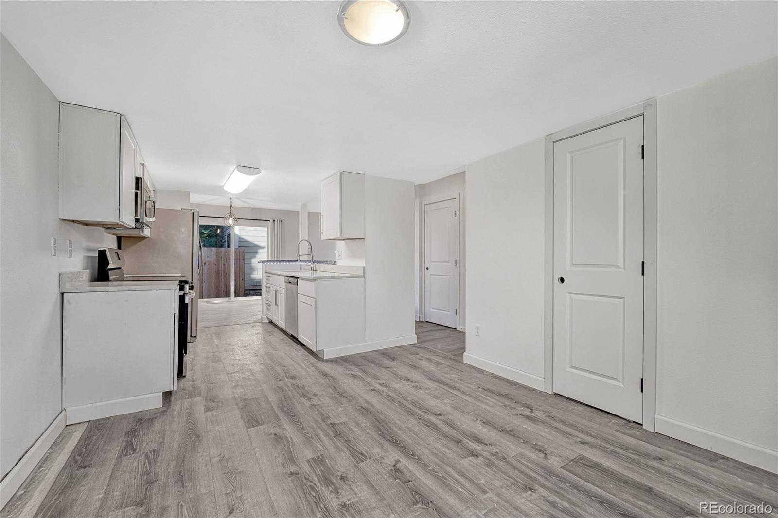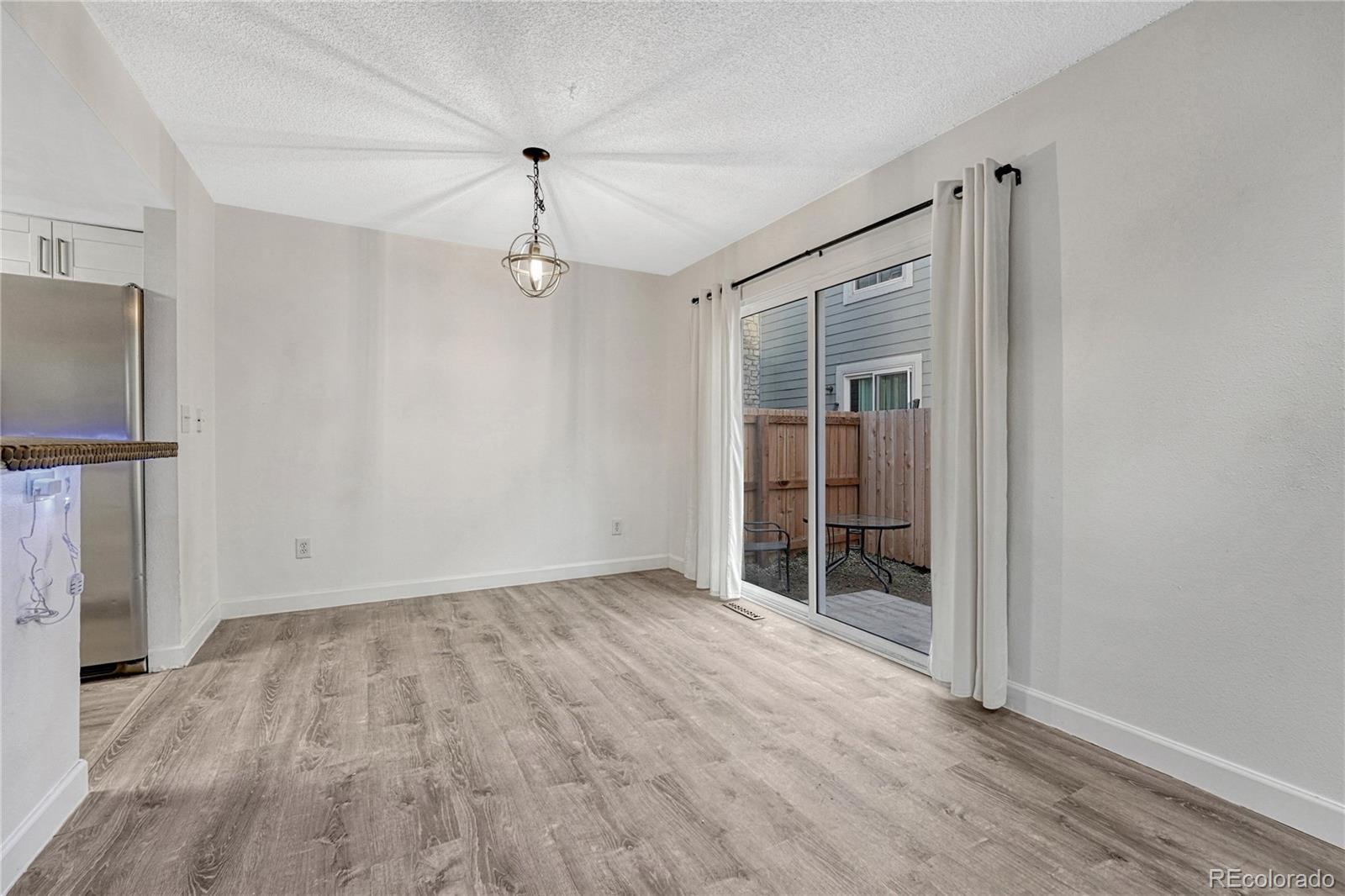 Here is your chance to buy a single family home with a small fenced in backyard/patio AND a basement. Walk to the grocery store, restaurants and public transportation. The Nine Mile Station (Park and Ride) is minutes away. This newly updated and renovated single family home has three bedrooms and three bathrooms. Dining room, family room with vaulted ceiling and skylights. Fireplace with stone front. The main floor has a bedroom or a study...very flexible space. Upstairs there are two large bedrooms...each with their own bath. The primary bedroom has an ensuite with a large tub and new vanity/ dual sinks. The second bedroom has an updated ensuite 3/4 bath. There is an updated powder bath on main floor. Newer windows, flooring, cabinets, appliances and countertops. New doors and hardware with a new vanity as well. There is NEW modern black staircase railing. The basement has 8 1/2 foot tall ceilings and a conforming window for an additional bedroom. Basement could easily have a bathroom making this a finished space that you could add value to your home. There is a large private backyard with new 6ft fence, a perfect space for kids or your fur baby. Located strategically to have easy access to I225 for a quick commute to DIA and DTC. Parents will love the schools as they are in Cherry Creek School District.