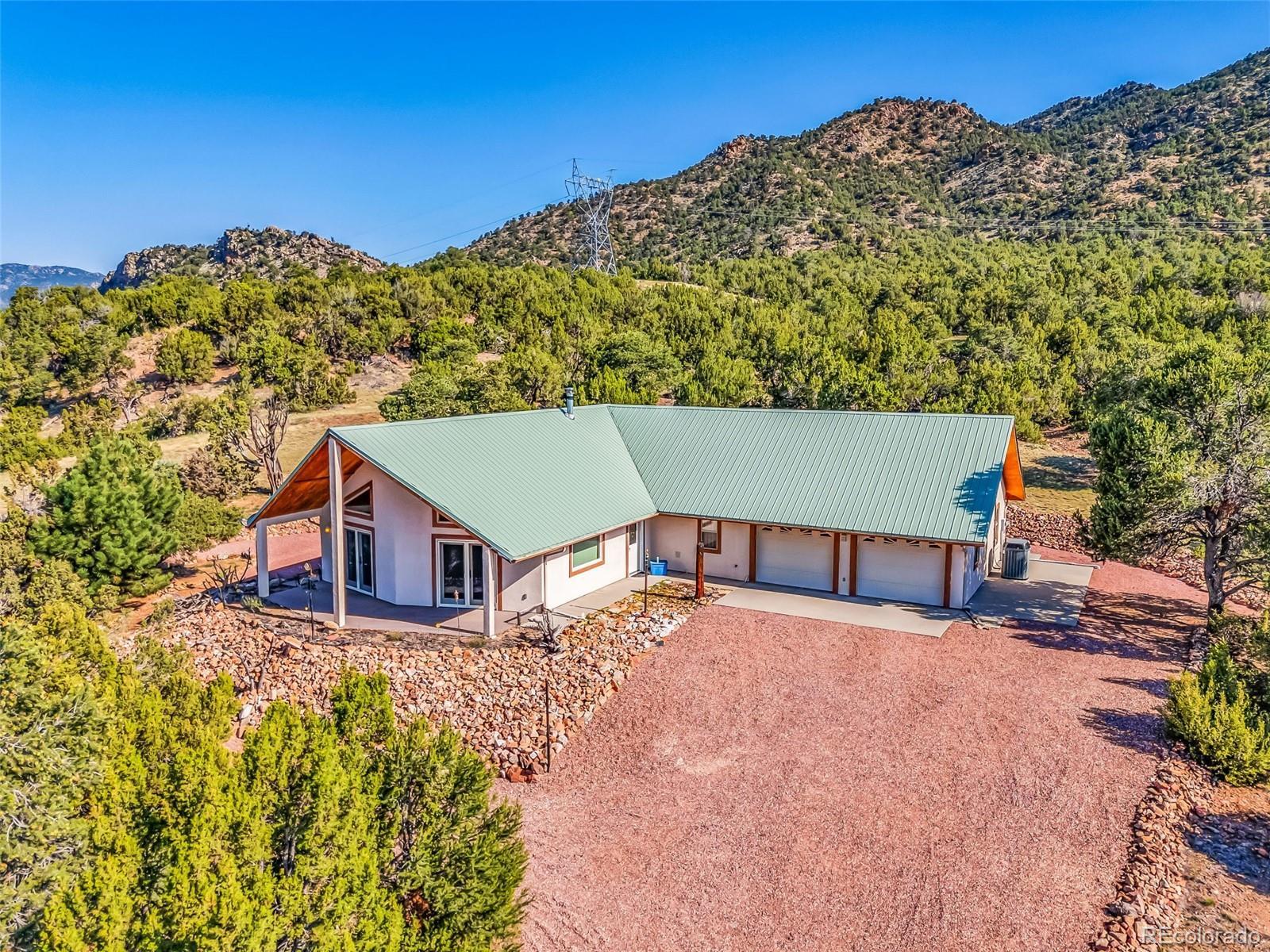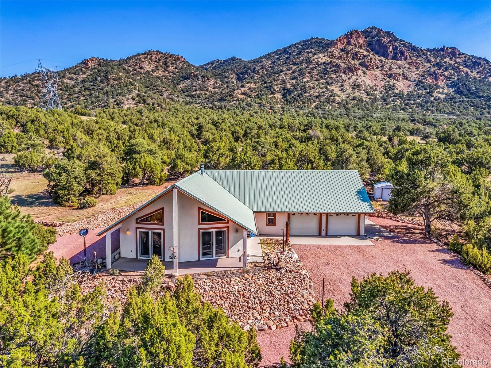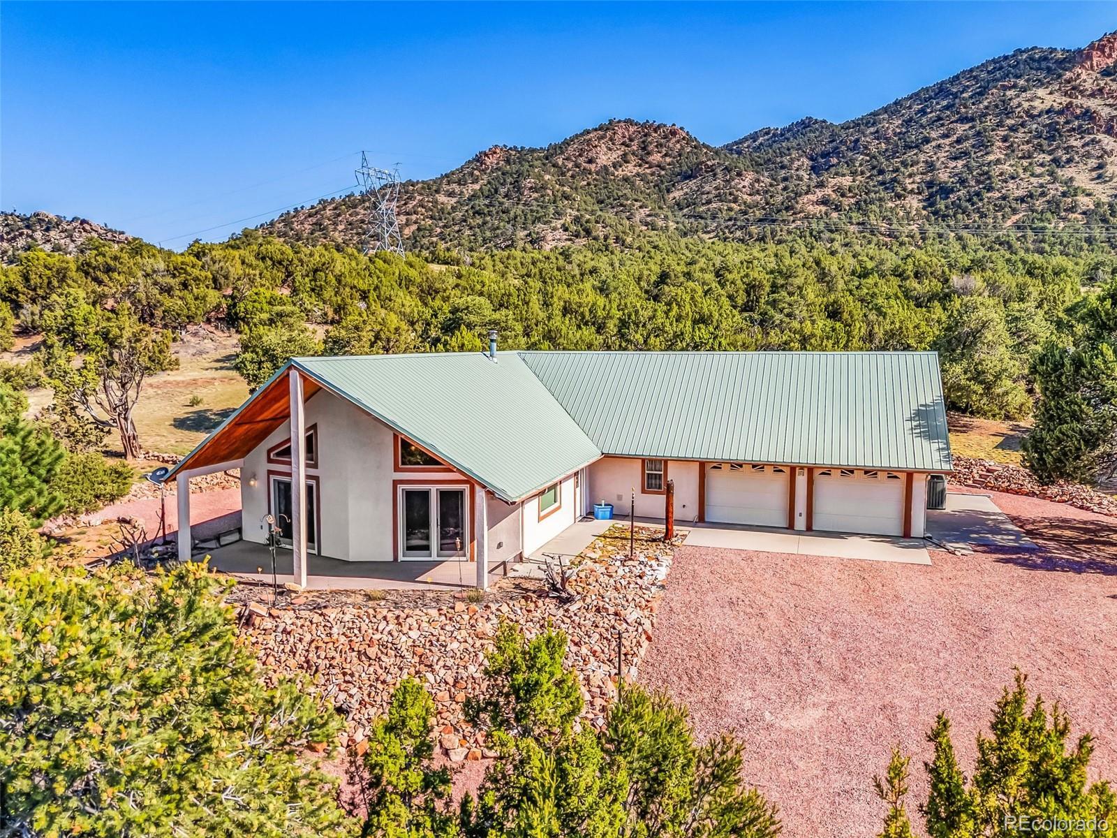 Mountain Views, Total Privacy, and Prime Location—This One Has It All! This beautifully maintained, single-level 3-bedroom, 2-bath property is set on 36 private acres just off Highway 9—only 11 miles from town, yet worlds away from the hustle and bustle. Backing up to over 13,000 acres of BLM land in GMU 581, it’s a rare combination of peace, privacy, and outdoor adventure. Inside, you'll find an open-concept layout with a spacious kitchen featuring ample storage, a large breakfast bar that seats six, and a bright, airy dining/living area. Two sets of heavy-duty French doors lead to a private covered patio—perfect for soaking in the incredible mountain views and star-filled skies. A bonus flex space off the living area includes a beautiful soapstone wood stove and can be used as a formal dining room, office, or cozy sitting area. The primary suite is a true retreat with large windows, an 8-foot walk-in closet, and a five-piece bath complete with soaking tub & walk-in shower. Two additional bedrooms offer large closets and great natural light. The laundry room is located just off the attached two-car garage and includes built-in cabinetry and a linen closet for added storage. This home was built for mountain living with hardy features, including a durable metal roof, stucco exterior, tall pine ceilings, newer double-pane windows, and a strong domestic well producing over 15 GPM. A 1,200-gallon cistern provides extra water storage, and the iron filter and water softener ensure excellent water quality. You'll stay comfortable year-round with electric baseboard heaters, an electric furnace, a soapstone stove, and A/C for those warmer summer months. Outside, the property is clean and well cared for with rock-lined driveways, two sheds including a large Morton shed, and a powered RV-ready carport. Whether you're looking for a forever home, a getaway, or a base for outdoor adventures, this property offers the perfect mix of comfort, freedom, and natural beauty.