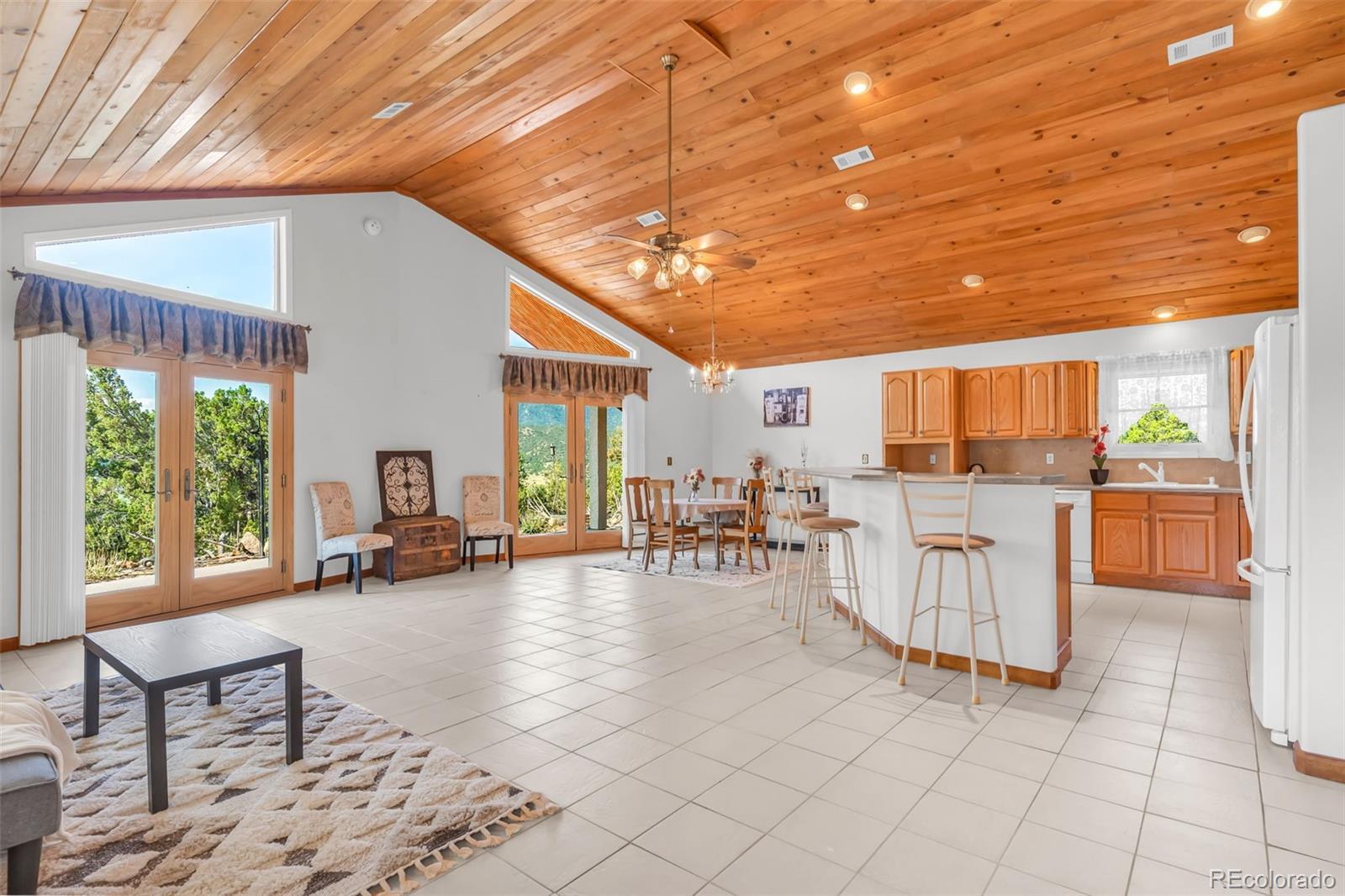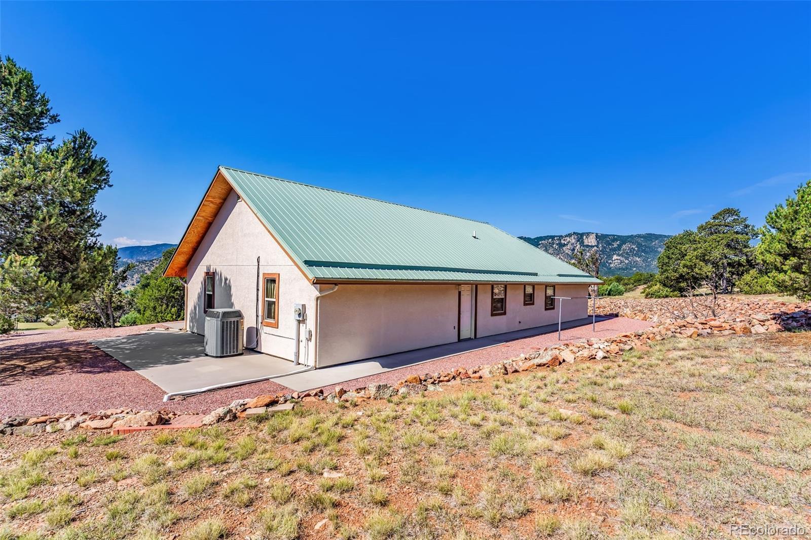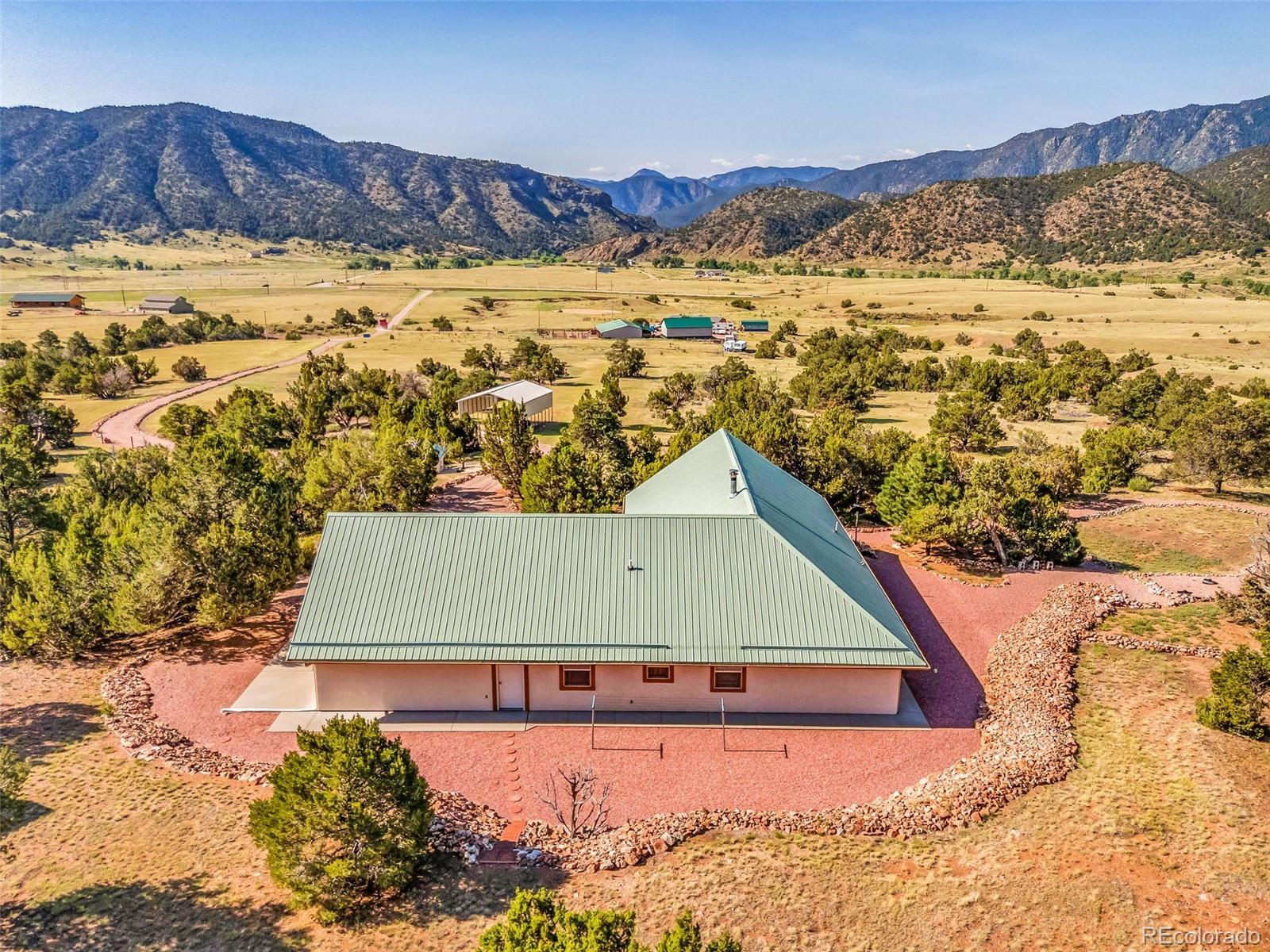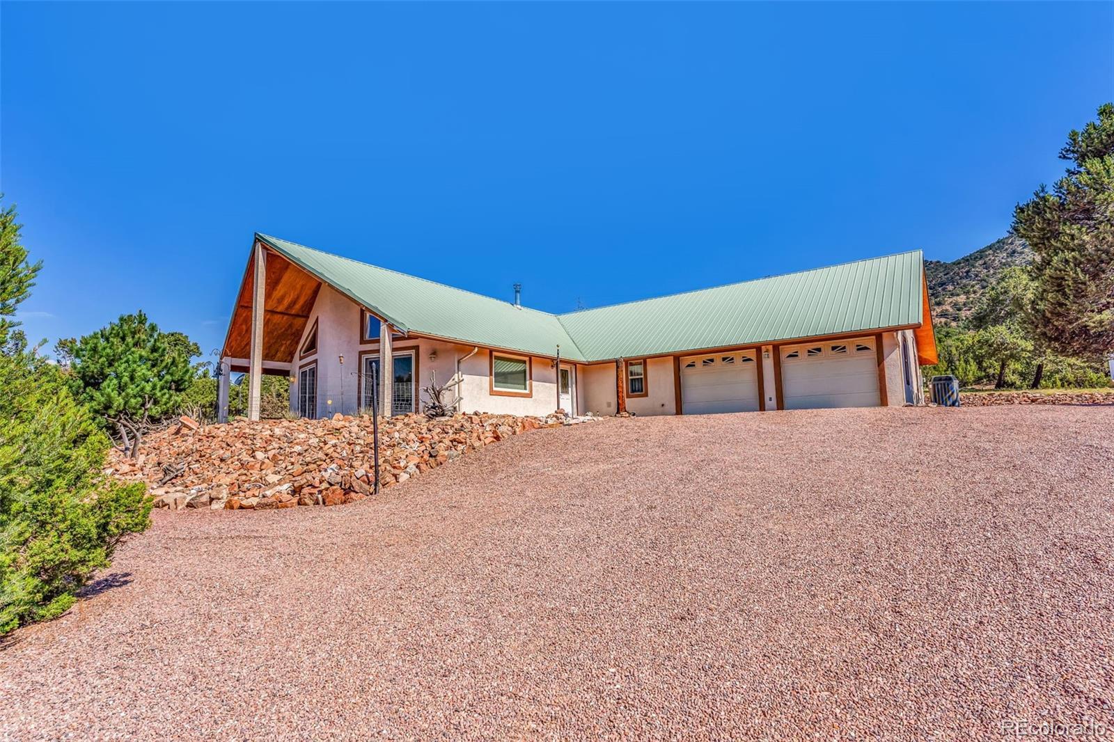Mountain Views, Total Privacy, and Prime Location—This One Has It All! This beautifully maintained, single-level 3-bedroom, 2-bath property is set on 36 private acres just off Highway 9—only 11 miles from town, yet worlds away from the hustle and bustle. Backing up to over 13,000 acres of BLM land in GMU 581, it’s a rare combination of peace, privacy, and outdoor adventure. Inside, you'll find an open-concept layout with a spacious kitchen featuring ample storage, a large breakfast bar that seats six, and a bright, airy dining/living area. Two sets of heavy-duty French doors lead to a private covered patio—perfect for soaking in the incredible mountain views and star-filled skies. A bonus flex space off the living area includes a beautiful soapstone wood stove and can be used as a formal dining room, office, or cozy sitting area. The primary suite is a true retreat with large windows, an 8-foot walk-in closet, and a five-piece bath complete with soaking tub & walk-in shower. Two additional bedrooms offer large closets and great natural light. The laundry room is located just off the attached two-car garage and includes built-in cabinetry and a linen closet for added storage. This home was built for mountain living with hardy features, including a durable metal roof, stucco exterior, tall pine ceilings, newer double-pane windows, and a strong domestic well producing over 15 GPM. A 1,200-gallon cistern provides extra water storage, and the iron filter and water softener ensure excellent water quality. You'll stay comfortable year-round with electric baseboard heaters, an electric furnace, a soapstone stove, and A/C for those warmer summer months. Outside, the property is clean and well cared for with rock-lined driveways, two sheds including a large Morton shed, and a powered RV-ready carport. Whether you're looking for a forever home, a getaway, or a base for outdoor adventures, this property offers the perfect mix of comfort, freedom, and natural beauty.