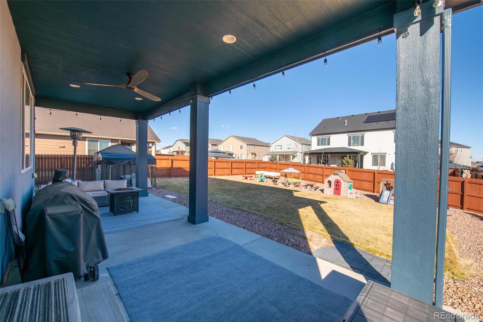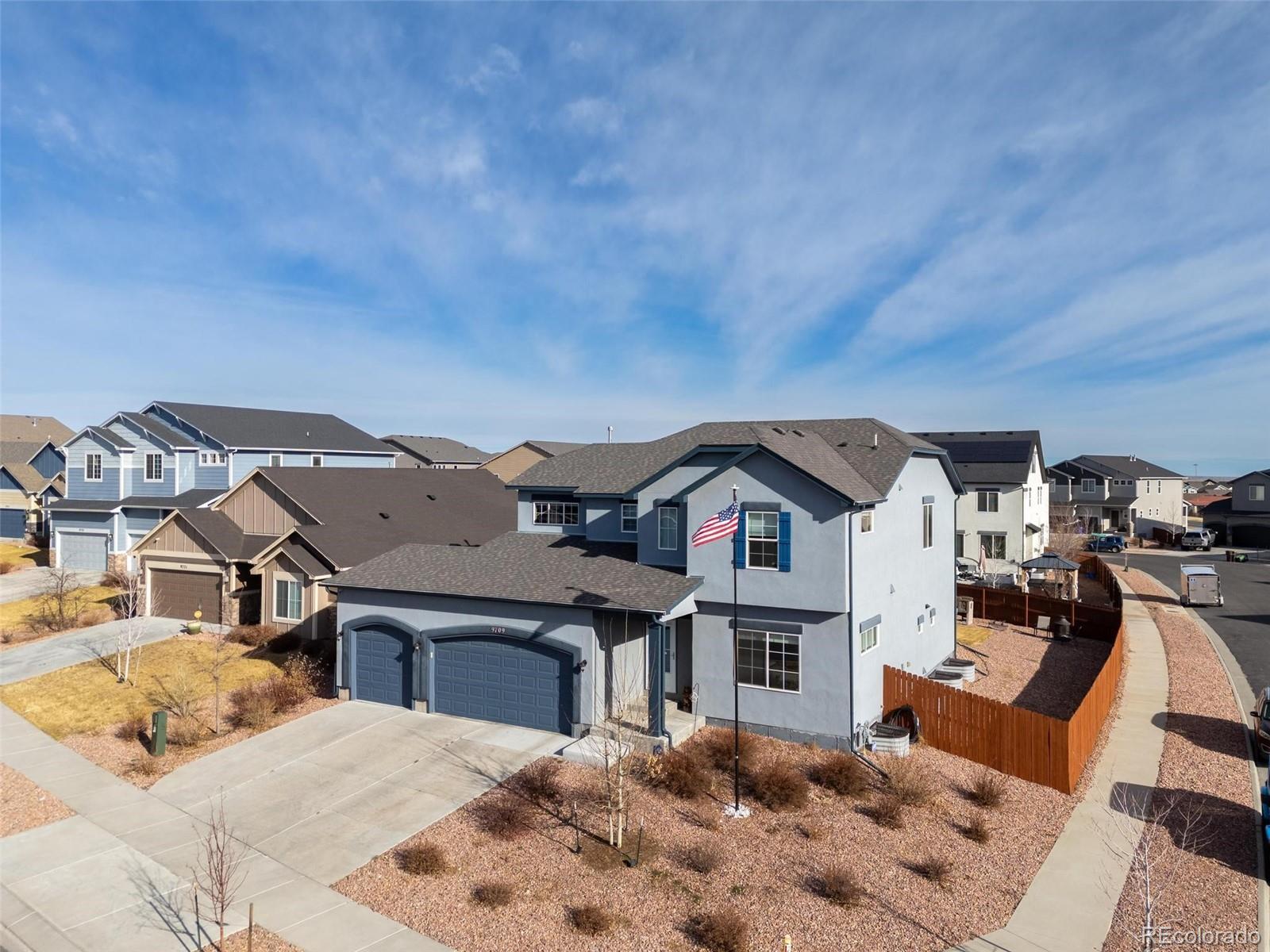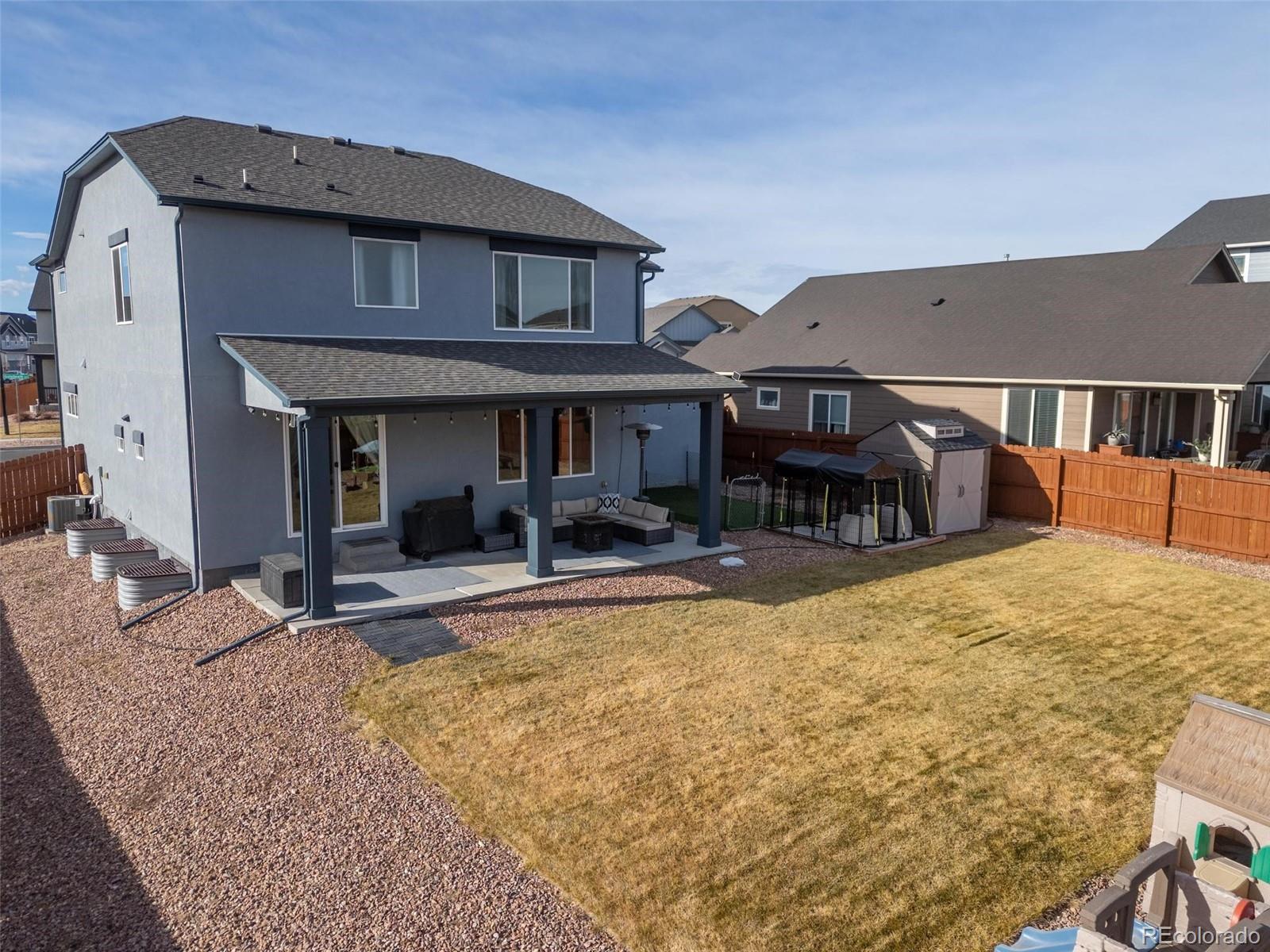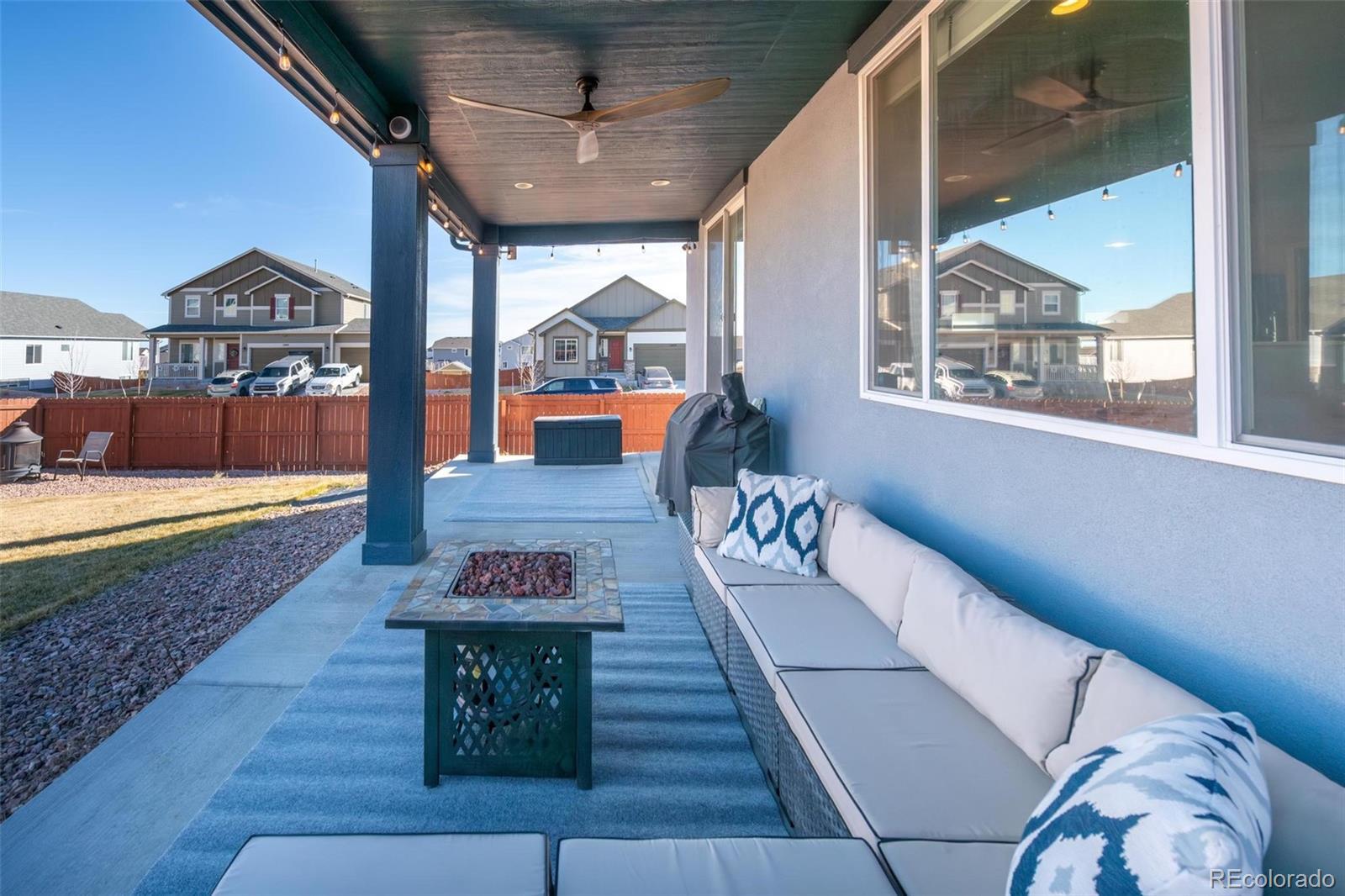 Welcome to this expansive 3,862 sq ft home built in 2020. This home offers extended living spaces across all three finished levels. The main level welcomes you with a bright entryway, private office, half bath, and a spacious living area with an electric fireplace. The kitchen is both stylish and functional, featuring quartz countertops, a large center island, 42" upper cabinets, a walk-in pantry, and a dedicated dining area complete with a built-in buffet. Additional upgrades include a reverse osmosis water system under the sink and a whole-home water filtration and softener system. Upstairs, the primary suite is a true retreat, boasting a luxurious five-piece bath, a double vanity with quartz counters, and an expansive walk-in closet. Three additional bedrooms, 2 full bathrooms, and a laundry room complete the upper level. Blackout blinds in all bedrooms and the living room provide comfort, privacy, and energy efficiency. The fully finished basement adds exceptional flexibility with a large great room, exercise or flex space, two additional bedrooms—each with a walk-in closet—and a full bath, making it ideal for guests or multi-generational living. This home is equipped with premium health, comfort, and security features including a radon mitigation system, UV light filter in the furnace, whole-home humidifier, and a security system. Outdoor living shines with an extended covered patio measuring 29' x 11', complete with a ceiling fan. The fenced yard features a dog run, and storage shed. Completing the property is an oversized, fully insulated 5-car garage with a heater making it comfortable for year-round use, storage, or workshop needs. Located in the desirable Meridian Ranch community, this home offers an easy commute to military installations and access to exceptional neighborhood amenities including hiking and biking trails, a golf course, and two recreation centers featuring full gyms, childcare, and both indoor and outdoor pools.