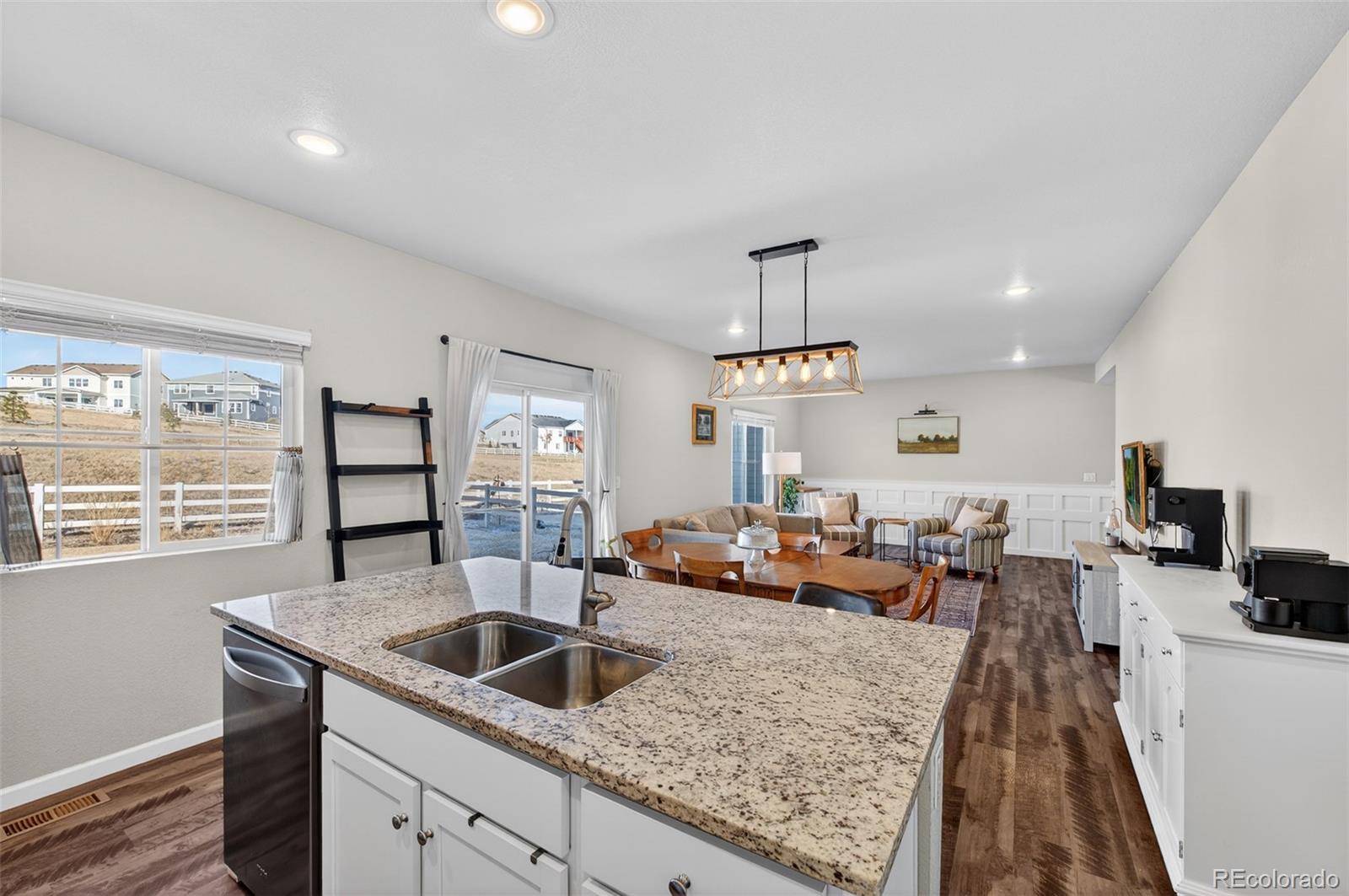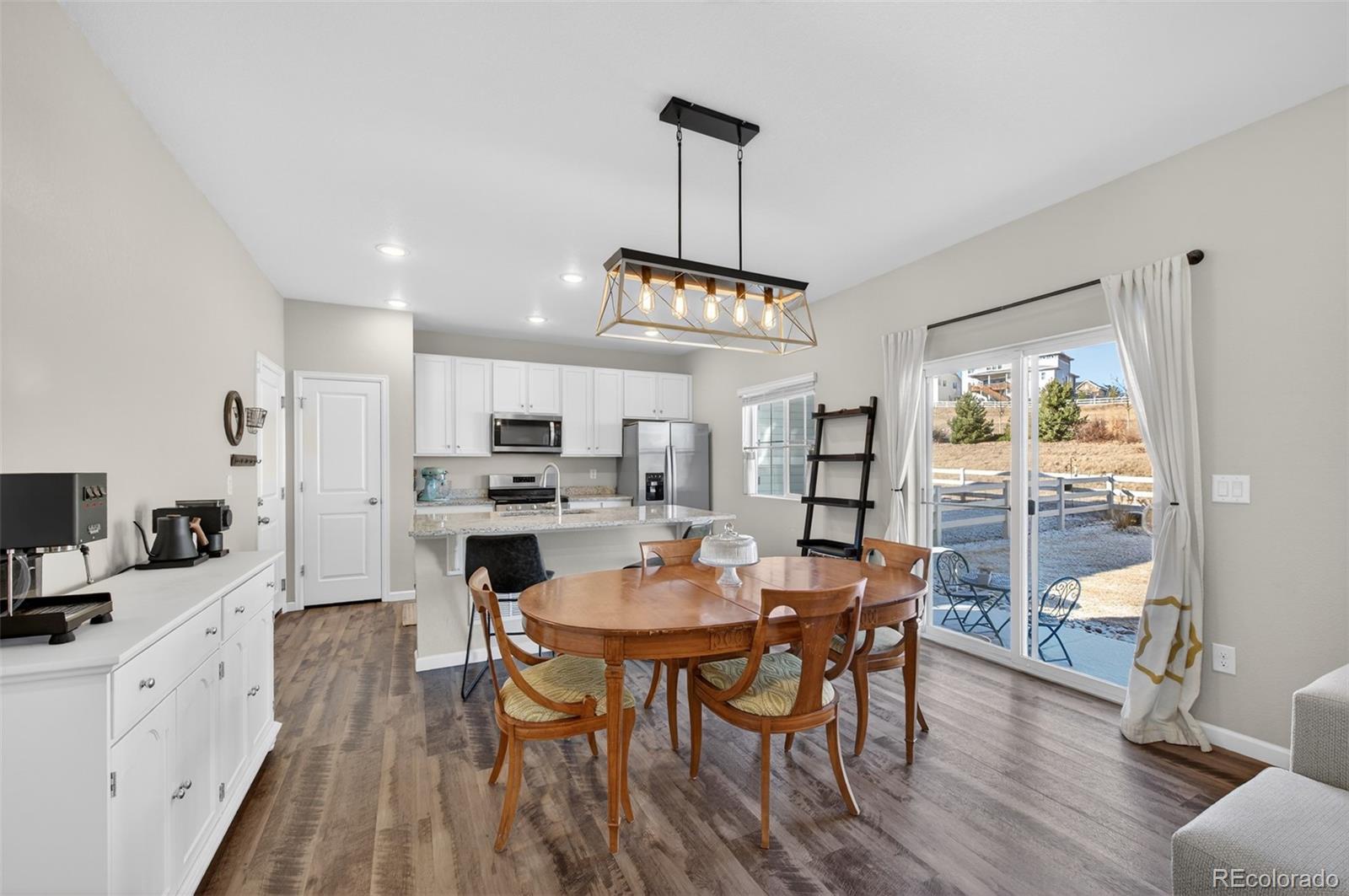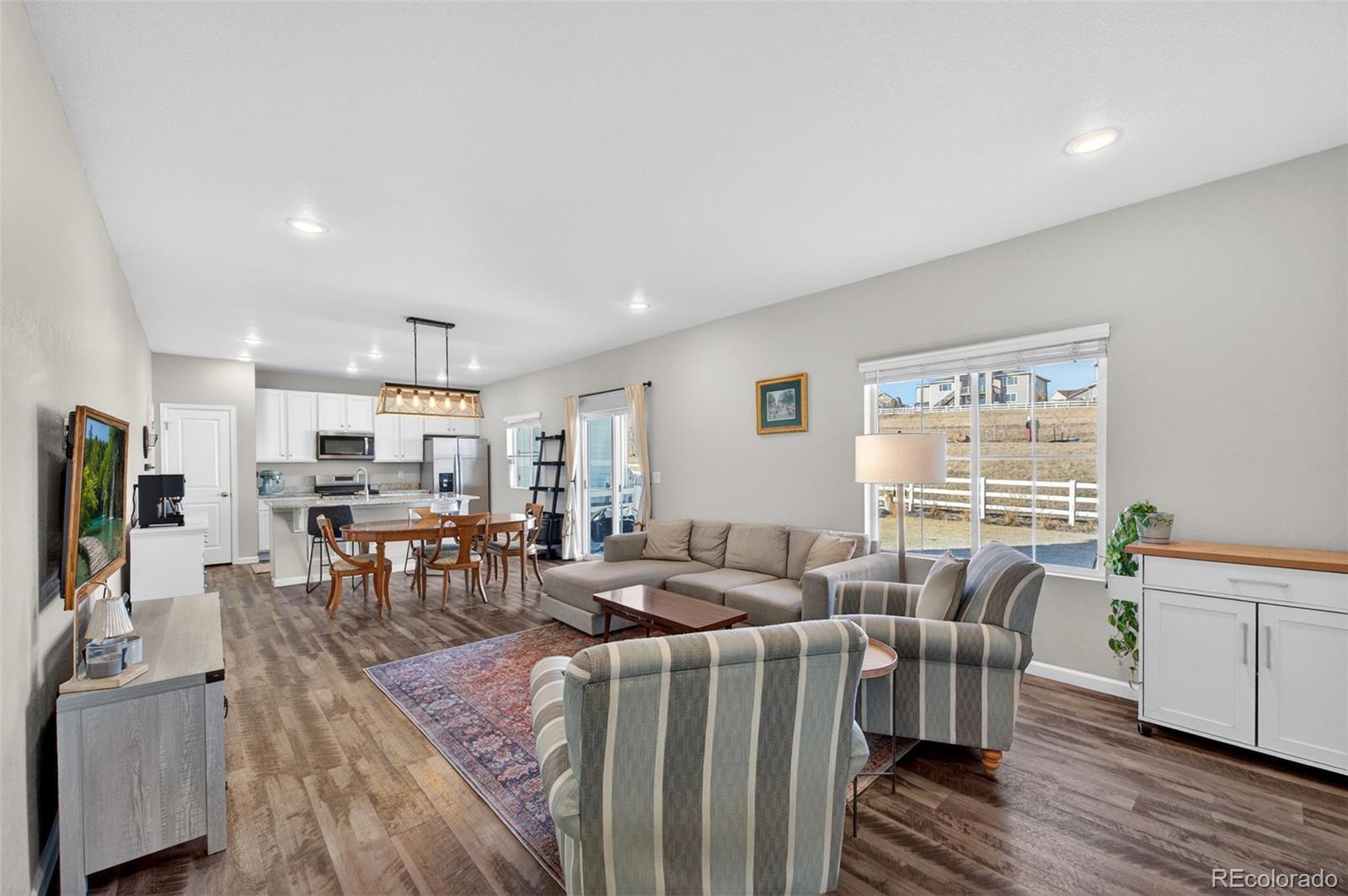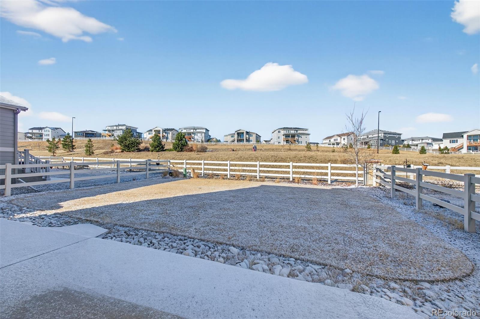 Located in the highly desired neighborhood of Crystal Valley Ranch, this home boasts an open-floor plan that seamlessly connects a spacious great room, complete with decorative molding, LVP flooring throughout, large windows that flood the space with natural light and a private patio with open space and no neighbors behind you. A chef-inspired kitchen featuring stainless-steel appliances including a gas stove, granite slab countertops, and an expansive island perfect for hosting. Upstairs, the primary suite offers a tranquil retreat with an ensuite bath with granite slab countertops leading into a sizable walk-in closet. Completing the layout find a full bath with granite slab countertops, three bedrooms, to provide flexible space for family, guests, or a home office, and an ideally located laundry room on the same level as the bedrooms, adding everyday ease to your routine. The unfinished basement features high ceilings and full insulation ready for your own personal design. Step outside to a landscaped, fully fenced backyard that is perfect for relaxation on the outdoor patio. The covered front porch is ideal for enjoying quiet mornings or cozy evenings. Impact resistant roof installed in December 2024. Nestled in a desirable location close to parks, trails, and welcoming community amenities, with convenient access to shopping, dining, and major roadways for an easy daily commute. A rare opportunity to enjoy Colorado living! Don't miss it!