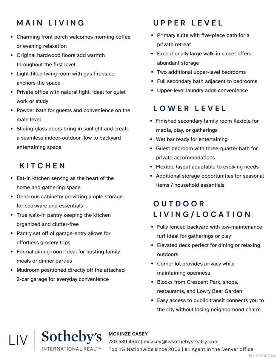 Positioned on a corner lot in the heart of Lowry, 7303 East 8th Place combines a thoughtful floorplan with a sense of openness and intentional living. Hardwood floors guide you through the living and dining areas into an eat-in kitchen that anchors the home. Generous cabinetry, a true walk-in pantry, and space to gather around the table make the kitchen both practical and inviting. A gas fireplace adds warmth to the living area, while sliding glass doors open to a fully fenced backyard with low-maintenance turf and an elevated deck ideal for outdoor dining or relaxed gatherings. A sunny front office and powder bath complete the main floor. Upstairs, three bedrooms are arranged for both privacy and function, led by a spacious primary suite with a five-piece bath and a generous walk-in closet. Two additional bedrooms share a full bath, and upper-level laundry adds everyday convenience. The finished basement expands living space with a secondary family room, fully plumbed wet bar, bedroom, and three-quarter bath, offering from game days to guests. Additional highlights include an attached two-car garage with overhead storage and a mudroom drop zone adjacent to the pantry. Carefully maintained and freshly painted in 2025, this home sits just blocks from Crescent Park, the Lowry Beer Garden, shops, and restaurants. Its location offers convenient access to public transit, combining the character of one of Denver’s most established neighborhoods with everyday ease.