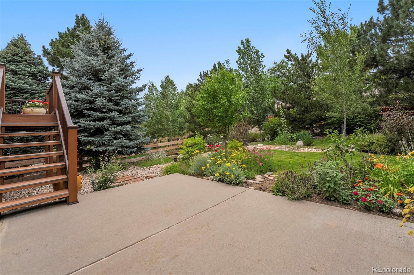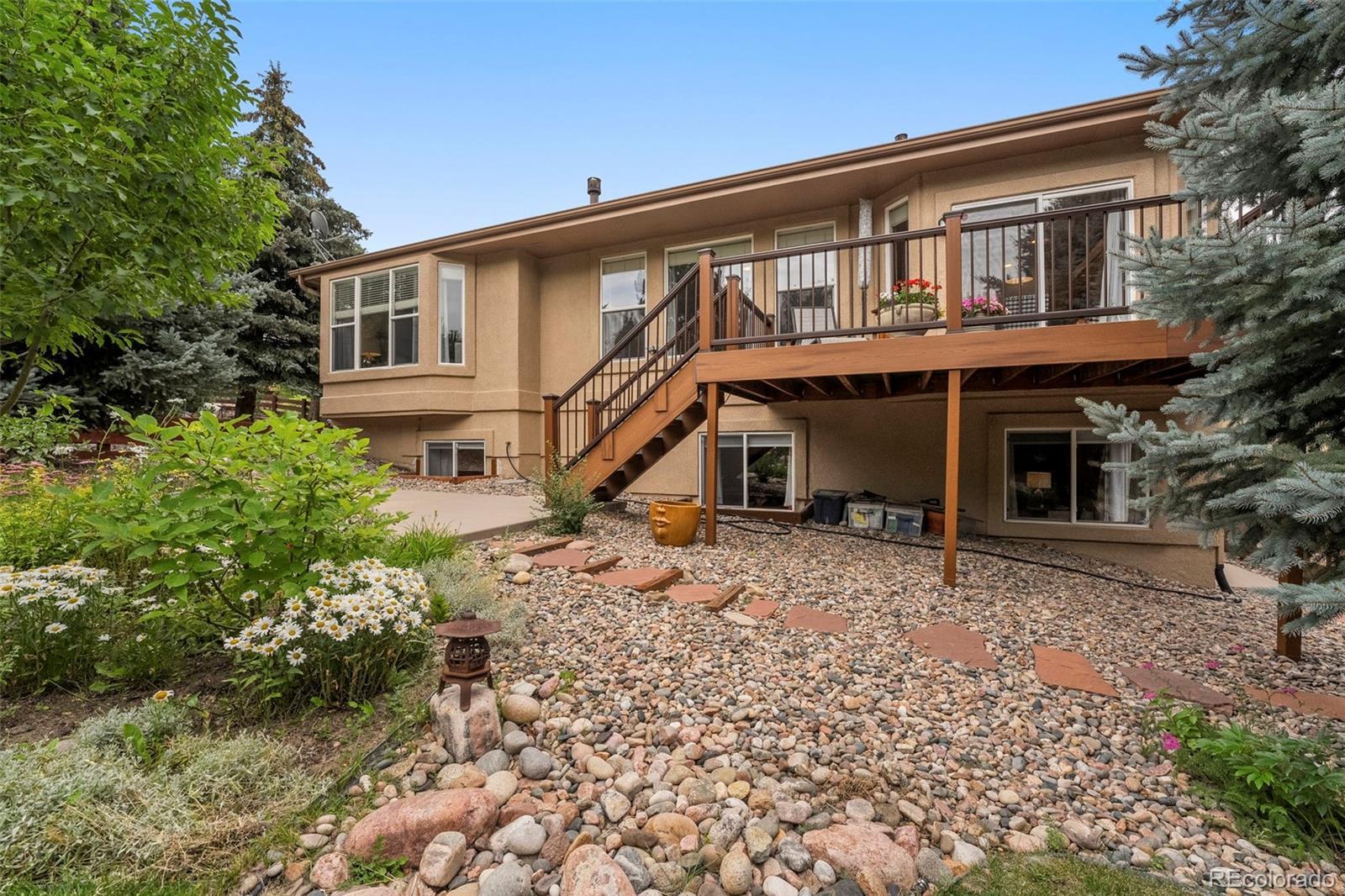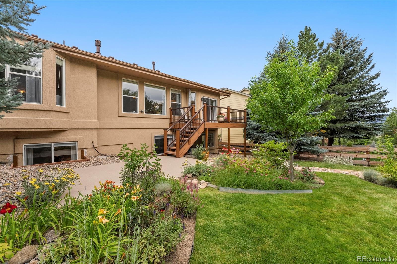 Nestled in the desirable Trail Ridge at Northgate community, this well-maintained ranch-style home offers comfortable main-level living with a thoughtfully finished walkout basement, all within highly sought-after Academy School District 20. Set on a landscaped lot with a peaceful, park-like backyard, the home blends tasteful updates, functional spaces, and a prime Northgate location. The entry welcomes you with warm wood floors, crisp walls, updated lighting, and an open layout that flows seamlessly between the living room, kitchen, and dining area. The great room features a gas fireplace and built-in bookcases, while the dining area walks out to a composite deck overlooking the backyard—ideal for everyday living and entertaining. The kitchen is both stylish and functional with stone countertops, a breakfast bar, pantry, and ample cabinetry. The main level is anchored by a spacious primary suite with walk-in closet and an updated five-piece bath with double vanities, soaking tub, and separate shower. A second main-level bedroom—ideal for guests or a home office—along with a full bath and convenient main-level laundry complete this level. The walkout basement expands the living space with a large family room offering flexibility for media, recreation, or work-from-home needs, plus two additional bedrooms and a full bath—perfect for guests or extended stays. Outdoors, mature trees, a dry creek feature, and lush landscaping create a private-feeling retreat. Low-maintenance stucco siding, composite decking at both the front entry and rear deck, and an oversized attached three-car garage add comfort and everyday practicality. Located near parks, shopping, hospitals, and major commuter routes, this inviting home delivers space, serenity, and convenience in one desirable Northgate setting.