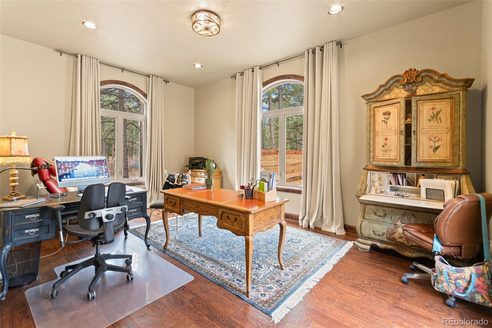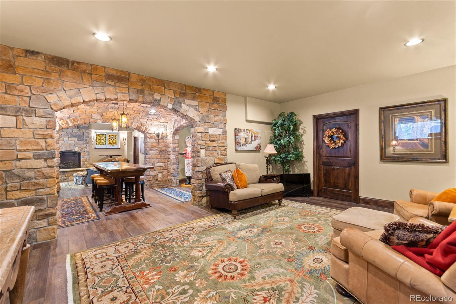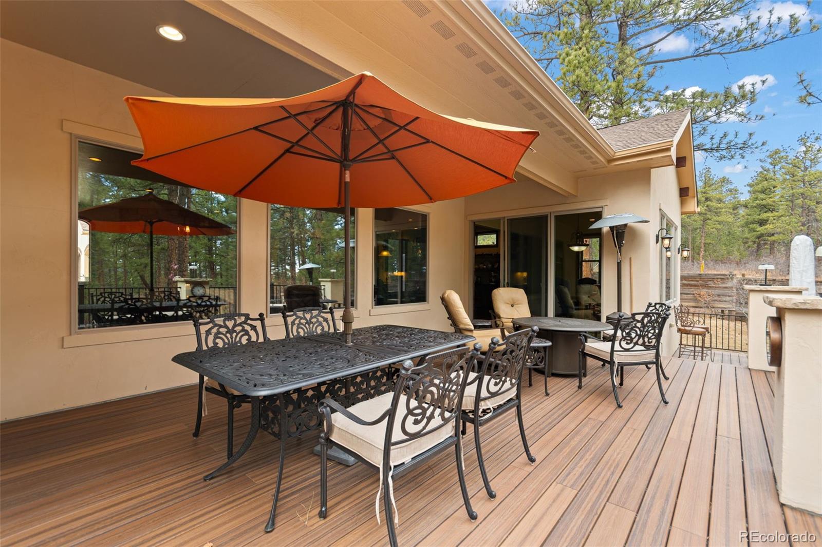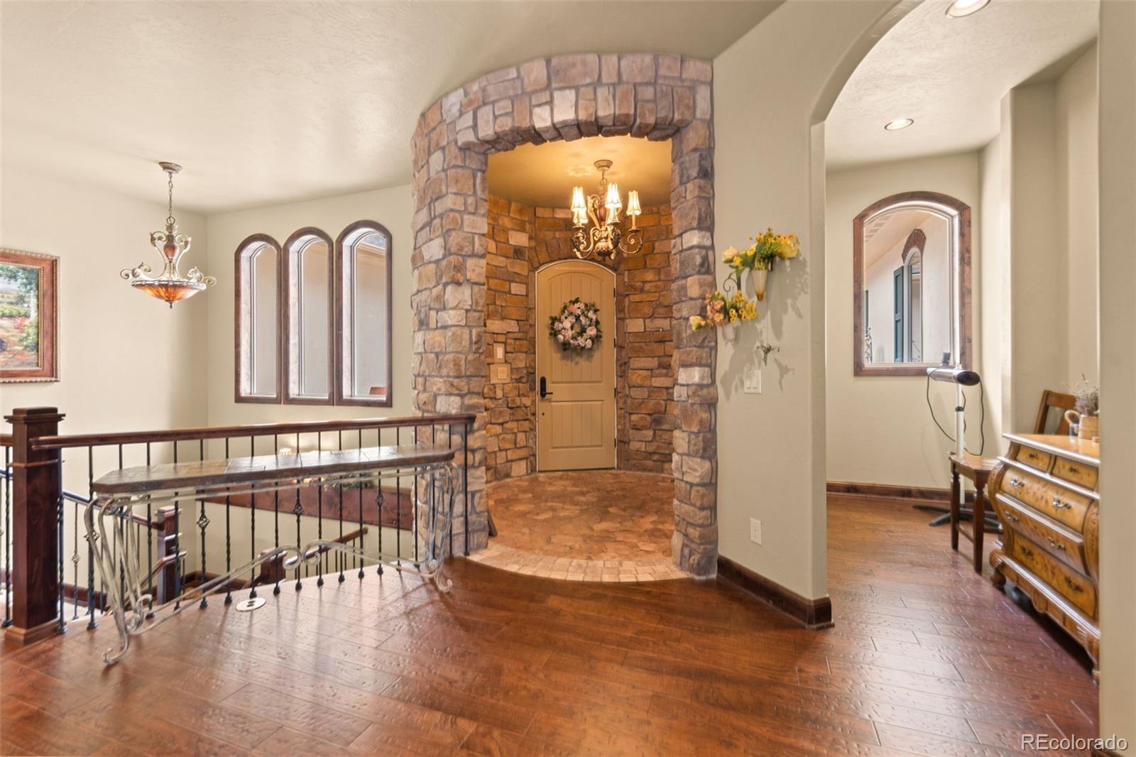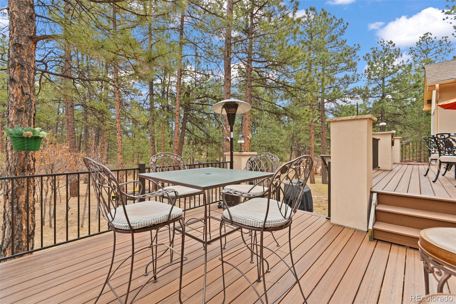 This custom estate, framed by towering Ponderosa Pines is set behind handmade wrought-iron gates on a private, one-acre wooded site. This custom home blends a Tuscan and Mediterranean architectural style with the quiet serenity of Colorado mountain living. The stucco and stone facade, arched windows, and enclosed courtyard establish a sense of arrival rarely found in the Sage Port neighborhood. Inside, superior craftsmanship defines every space. A circular stone rotunda foyer opens to a refined main level where arched transitions, rich hardwood flooring, hand troweled walls, iron detailing and extensive stonework create architectural continuity. The expansive great room is anchored by a statement fireplace, while the chef's gourmet kitchen features an oversized custom stone island, quality knotty alder cabinetry, professional-grade Wolf & Sub Zero appliances and seamless flow for entertaining. The main-level primary suite offers deck access and a spa-inspired copper soaking tub, stone shower, dual vanities, and an oversized walk-through closet connecting to the spacious laundry room. The finished lower level introduces a dramatic stone-arched ceiling, custom wet bar, recreation lounge, family room with a warming gas fireplace and relaxing guest accommodations. The covered deck offers outdoor living to enjoy the beauty of mother nature and delivering a private retreat just 30 minutes from Denver Tech Center and Colorado Springs.