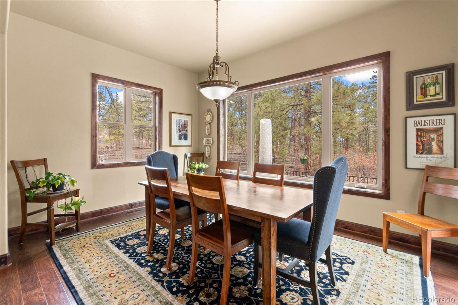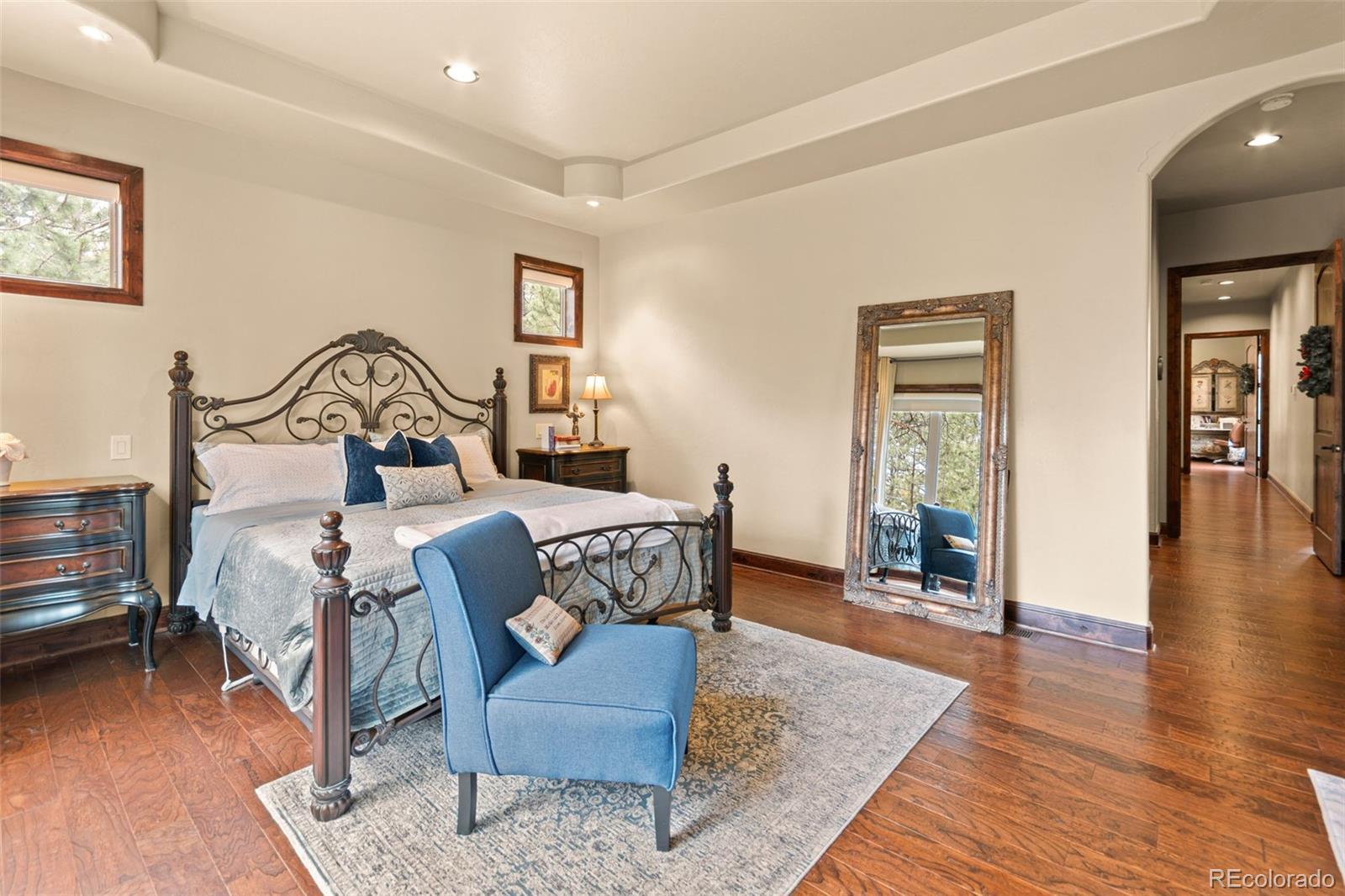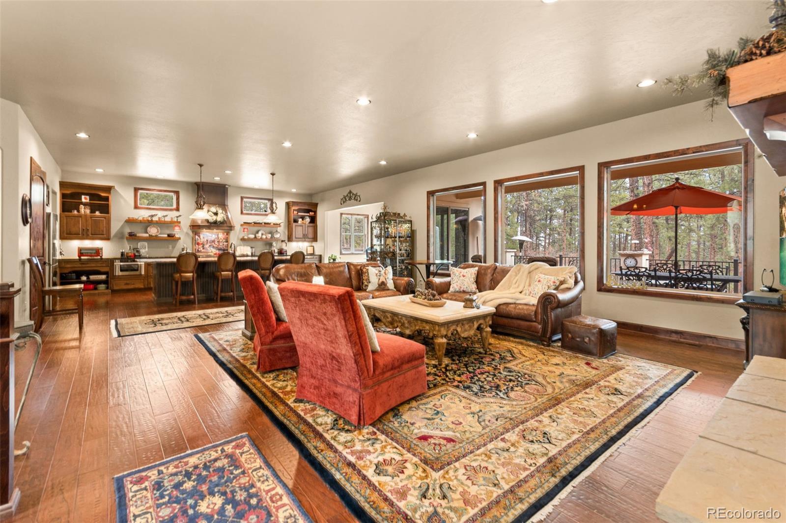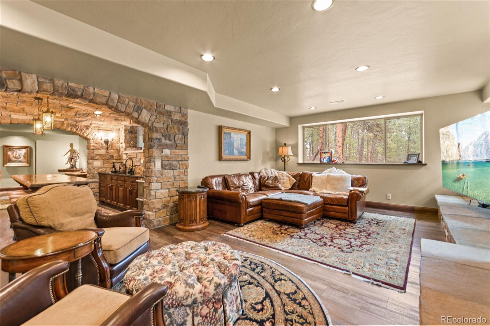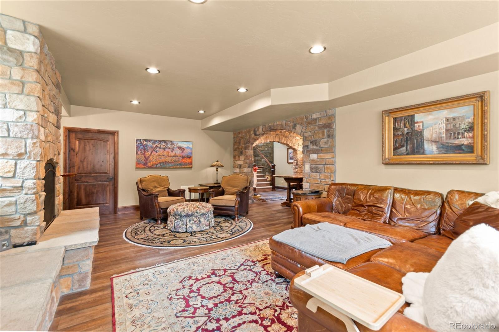 This custom estate, framed by towering Ponderosa Pines is set behind handmade wrought-iron gates on a private, one-acre wooded site. This custom home blends a Tuscan and Mediterranean architectural style with the quiet serenity of Colorado mountain living. The stucco and stone facade, arched windows, and enclosed courtyard establish a sense of arrival rarely found in the Sage Port neighborhood. Inside, superior craftsmanship defines every space. A circular stone rotunda foyer opens to a refined main level where arched transitions, rich hardwood flooring, hand troweled walls, iron detailing and extensive stonework create architectural continuity. The expansive great room is anchored by a statement fireplace, while the chef's gourmet kitchen features an oversized custom stone island, quality knotty alder cabinetry, professional-grade Wolf & Sub Zero appliances and seamless flow for entertaining. The main-level primary suite offers deck access and a spa-inspired copper soaking tub, stone shower, dual vanities, and an oversized walk-through closet connecting to the spacious laundry room. The finished lower level introduces a dramatic stone-arched ceiling, custom wet bar, recreation lounge, family room with a warming gas fireplace and relaxing guest accommodations. The covered deck offers outdoor living to enjoy the beauty of mother nature and delivering a private retreat just 30 minutes from Denver Tech Center and Colorado Springs.