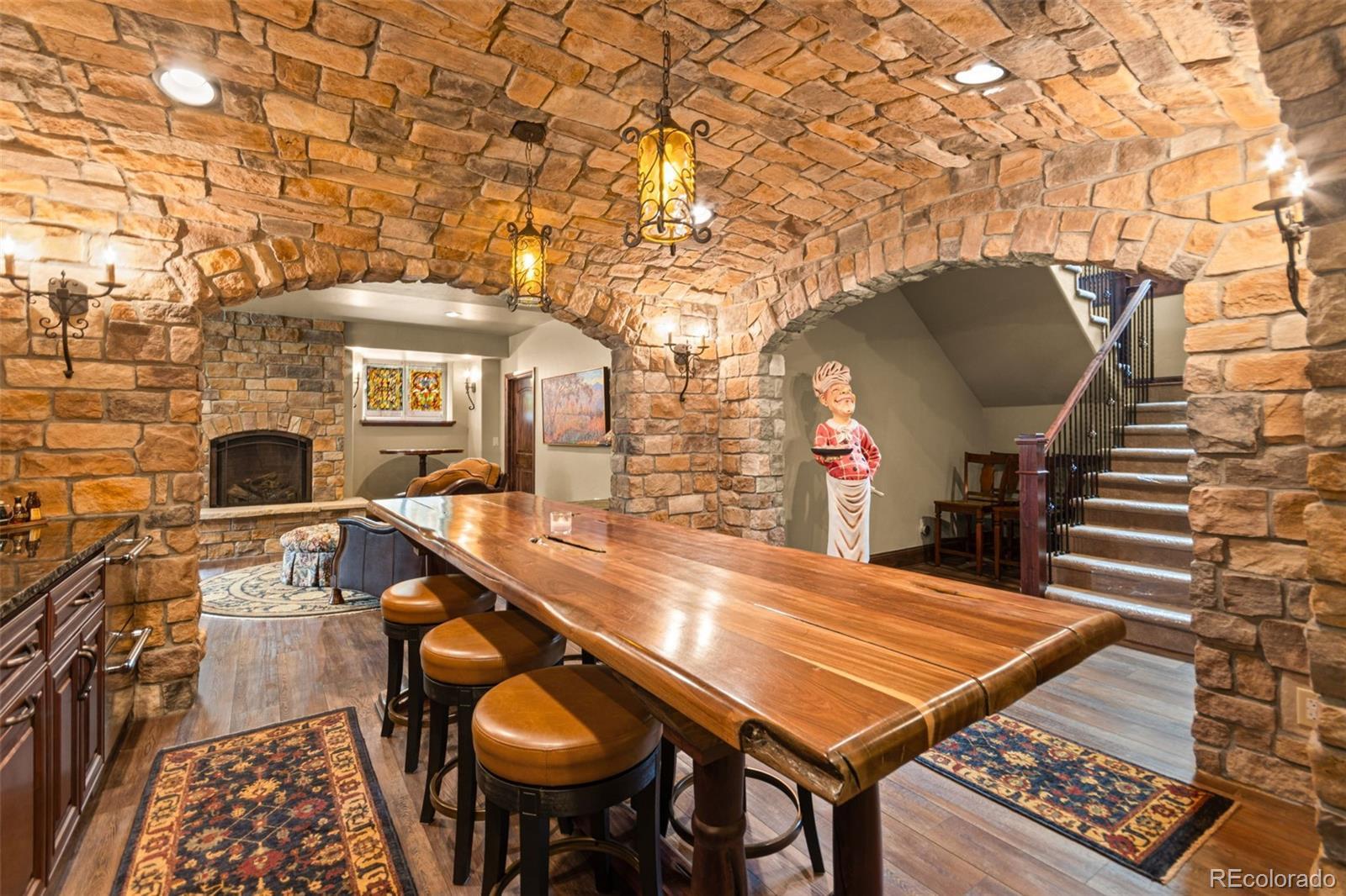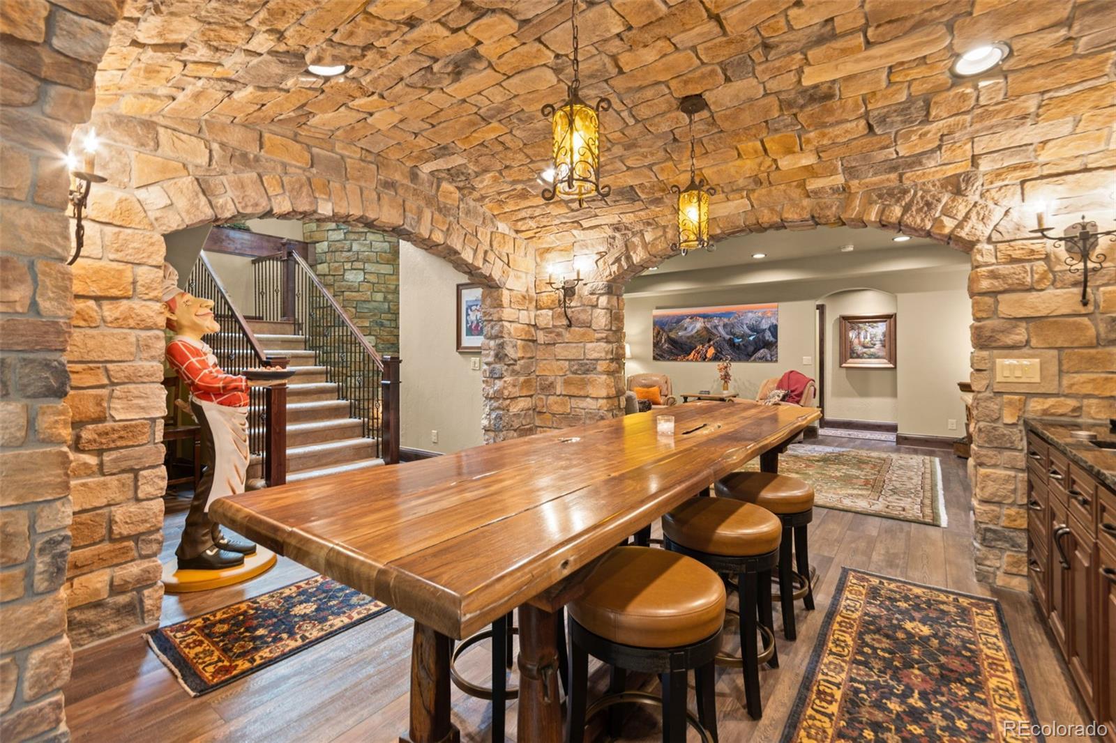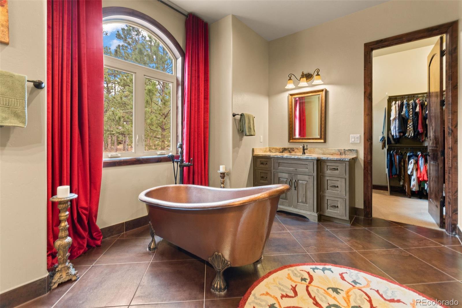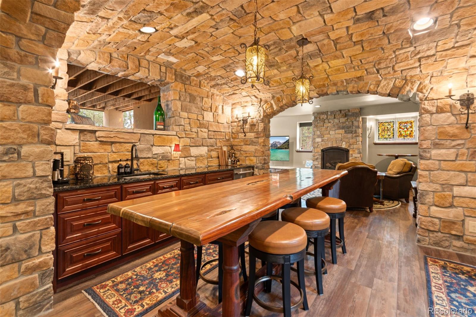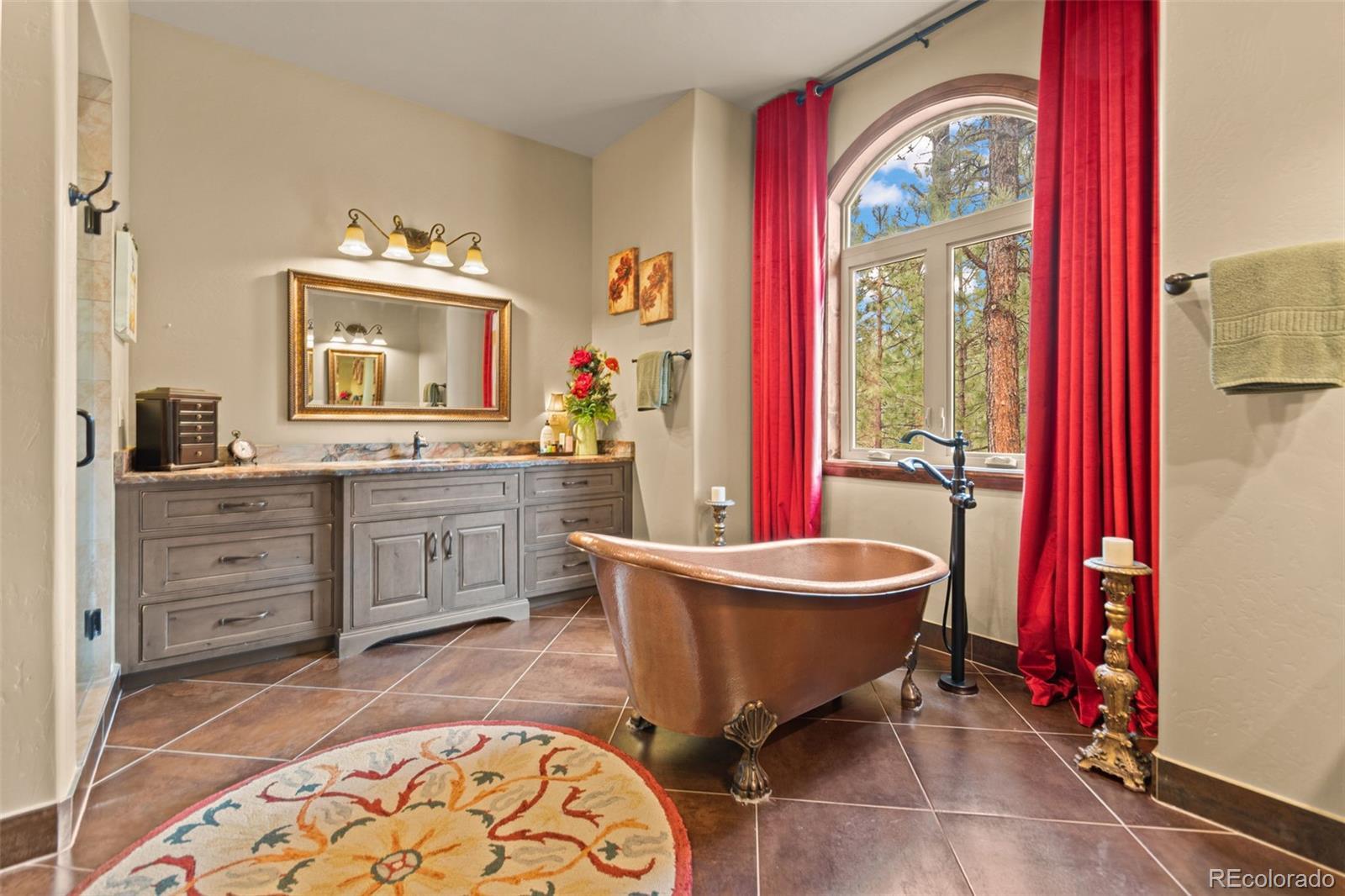 This custom estate, framed by towering Ponderosa Pines is set behind handmade wrought-iron gates on a private, one-acre wooded site. This custom home blends a Tuscan and Mediterranean architectural style with the quiet serenity of Colorado mountain living. The stucco and stone facade, arched windows, and enclosed courtyard establish a sense of arrival rarely found in the Sage Port neighborhood. Inside, superior craftsmanship defines every space. A circular stone rotunda foyer opens to a refined main level where arched transitions, rich hardwood flooring, hand troweled walls, iron detailing and extensive stonework create architectural continuity. The expansive great room is anchored by a statement fireplace, while the chef's gourmet kitchen features an oversized custom stone island, quality knotty alder cabinetry, professional-grade Wolf & Sub Zero appliances and seamless flow for entertaining. The main-level primary suite offers deck access and a spa-inspired copper soaking tub, stone shower, dual vanities, and an oversized walk-through closet connecting to the spacious laundry room. The finished lower level introduces a dramatic stone-arched ceiling, custom wet bar, recreation lounge, family room with a warming gas fireplace and relaxing guest accommodations. The covered deck offers outdoor living to enjoy the beauty of mother nature and delivering a private retreat just 30 minutes from Denver Tech Center and Colorado Springs.