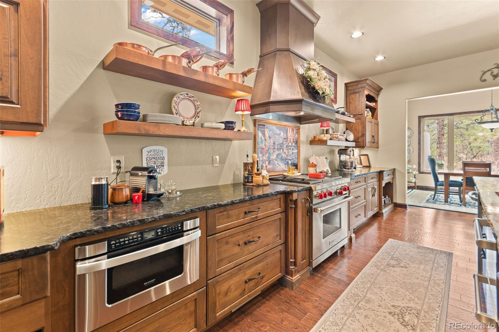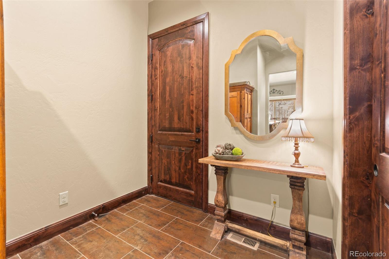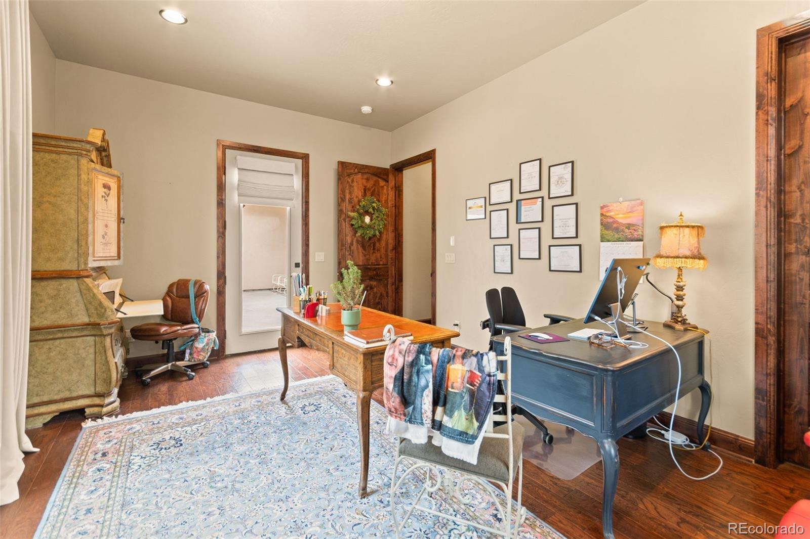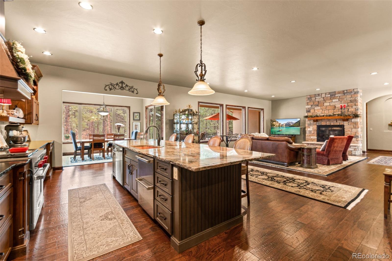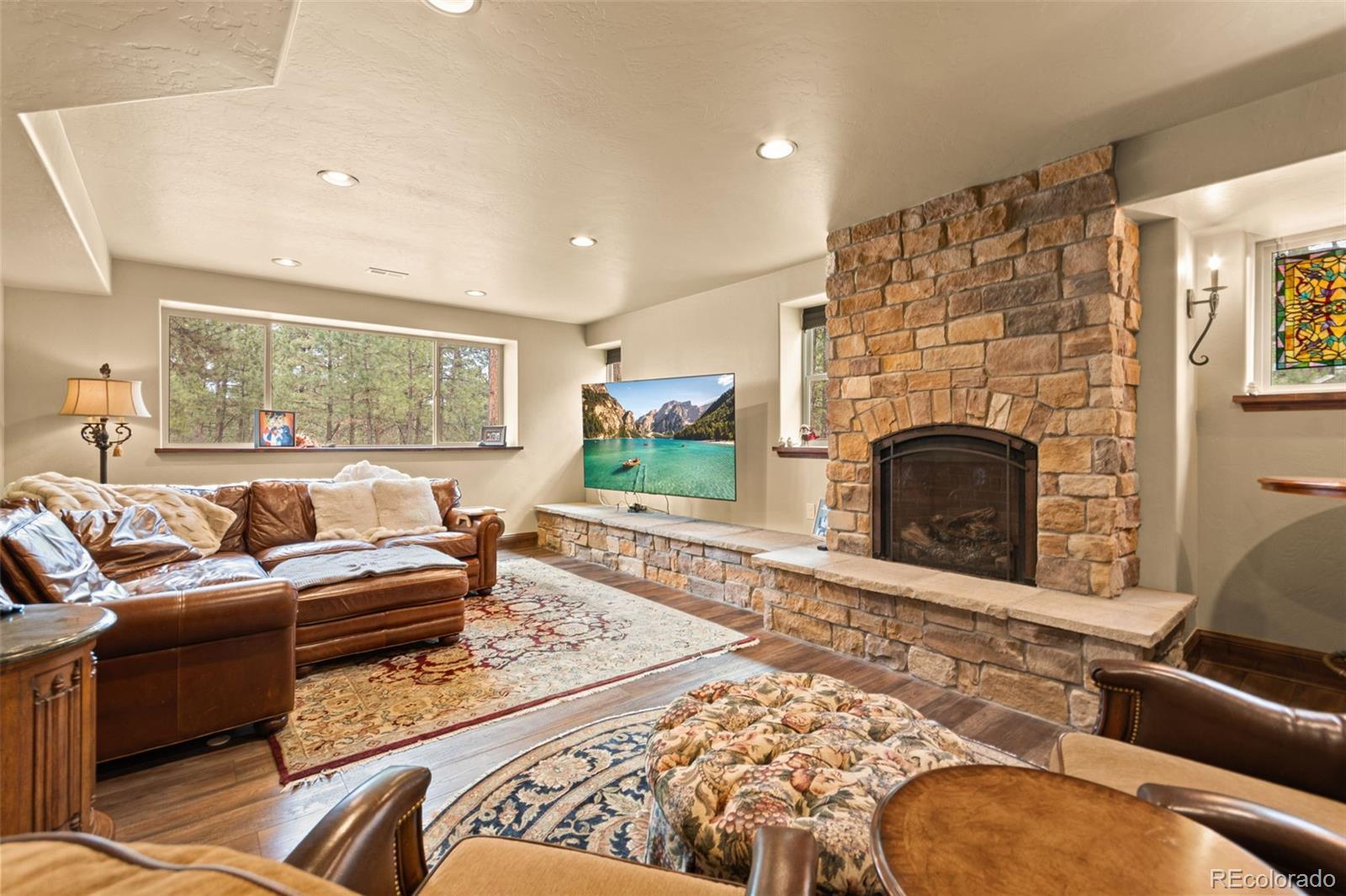 This custom estate, framed by towering Ponderosa Pines is set behind handmade wrought-iron gates on a private, one-acre wooded site. This custom home blends a Tuscan and Mediterranean architectural style with the quiet serenity of Colorado mountain living. The stucco and stone facade, arched windows, and enclosed courtyard establish a sense of arrival rarely found in the Sage Port neighborhood. Inside, superior craftsmanship defines every space. A circular stone rotunda foyer opens to a refined main level where arched transitions, rich hardwood flooring, hand troweled walls, iron detailing and extensive stonework create architectural continuity. The expansive great room is anchored by a statement fireplace, while the chef's gourmet kitchen features an oversized custom stone island, quality knotty alder cabinetry, professional-grade Wolf & Sub Zero appliances and seamless flow for entertaining. The main-level primary suite offers deck access and a spa-inspired copper soaking tub, stone shower, dual vanities, and an oversized walk-through closet connecting to the spacious laundry room. The finished lower level introduces a dramatic stone-arched ceiling, custom wet bar, recreation lounge, family room with a warming gas fireplace and relaxing guest accommodations. The covered deck offers outdoor living to enjoy the beauty of mother nature and delivering a private retreat just 30 minutes from Denver Tech Center and Colorado Springs.
