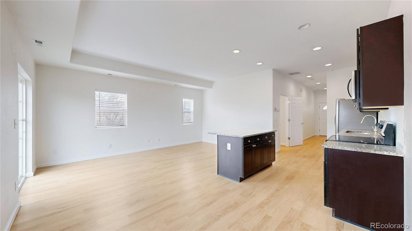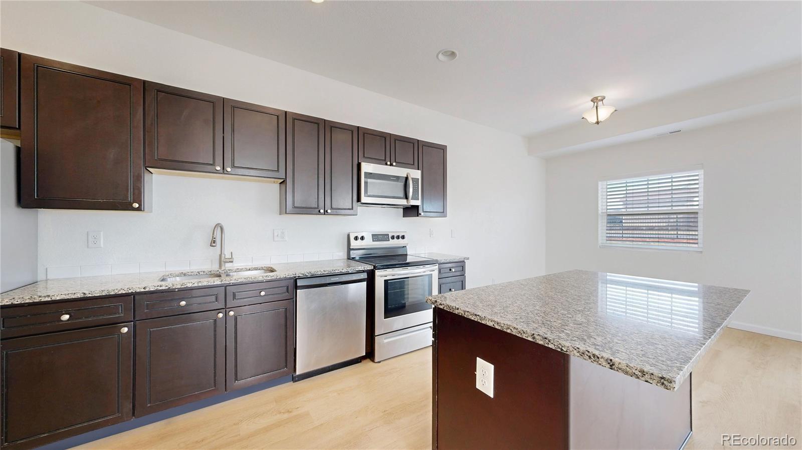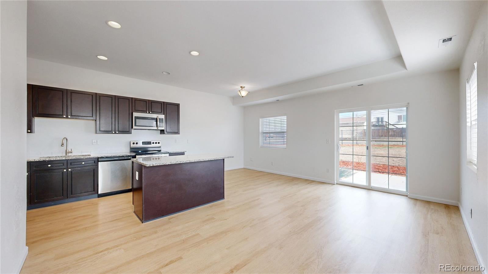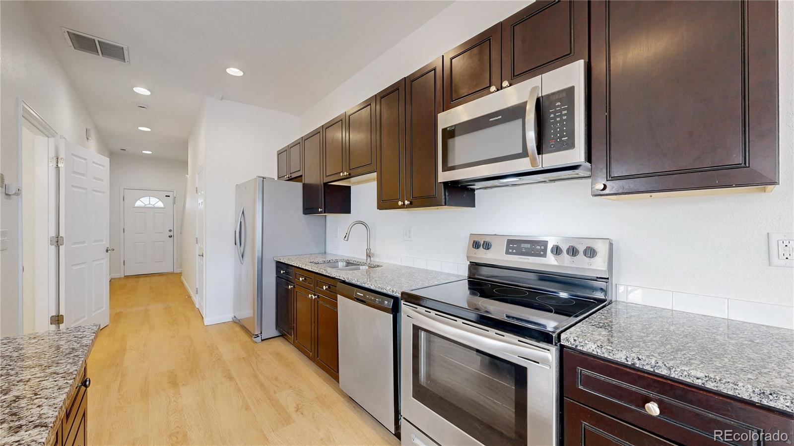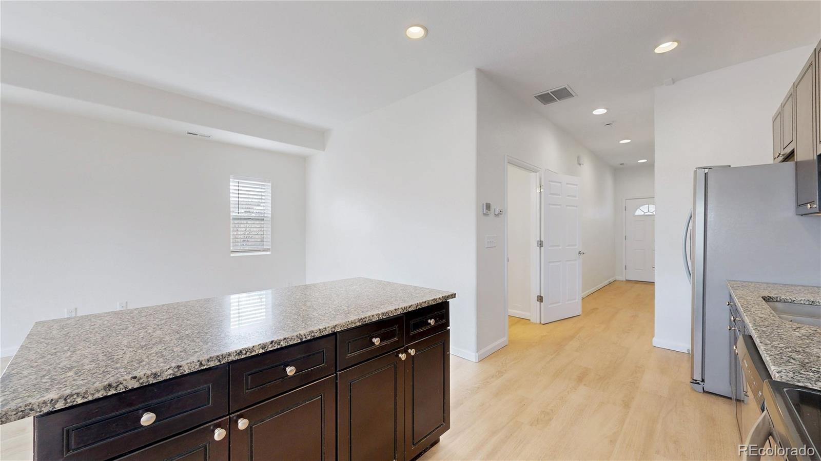 When you enter the front door of this west facing end unit, you are greeted with beautiful newly installed LVP floors that lead you into an open floor plan with a spacious kitchen/island, family/dining room as well as a half bath and oversized coat closet/pantry! The kitchen is finished with granite countertops and stainless-steel appliances, while the great room features large windows that invite natural lighting and look out on to the back patio. Upstairs, you'll find new luxury carpet, a spacious primary bedroom and ensuite full bathroom. Two additional bedrooms share a full bathroom. The laundry closet is conveniently located upstairs. This townhouse includes A/C & 1 car attached deep garage! Centrally located with easy access to DIA, CU/Anschutz Medical Center, retail, dining and entertainment options, Light rail, and I-225.