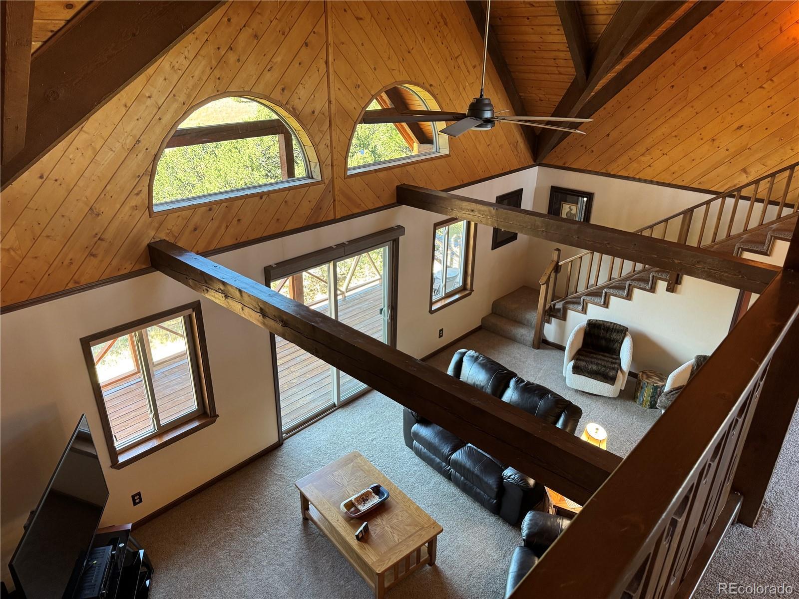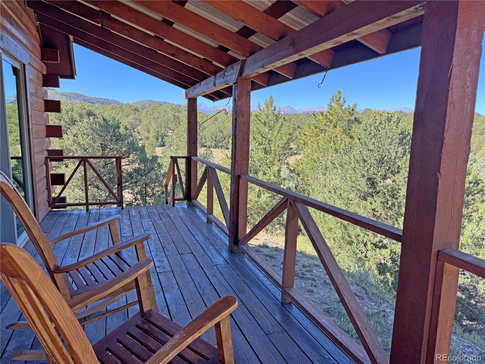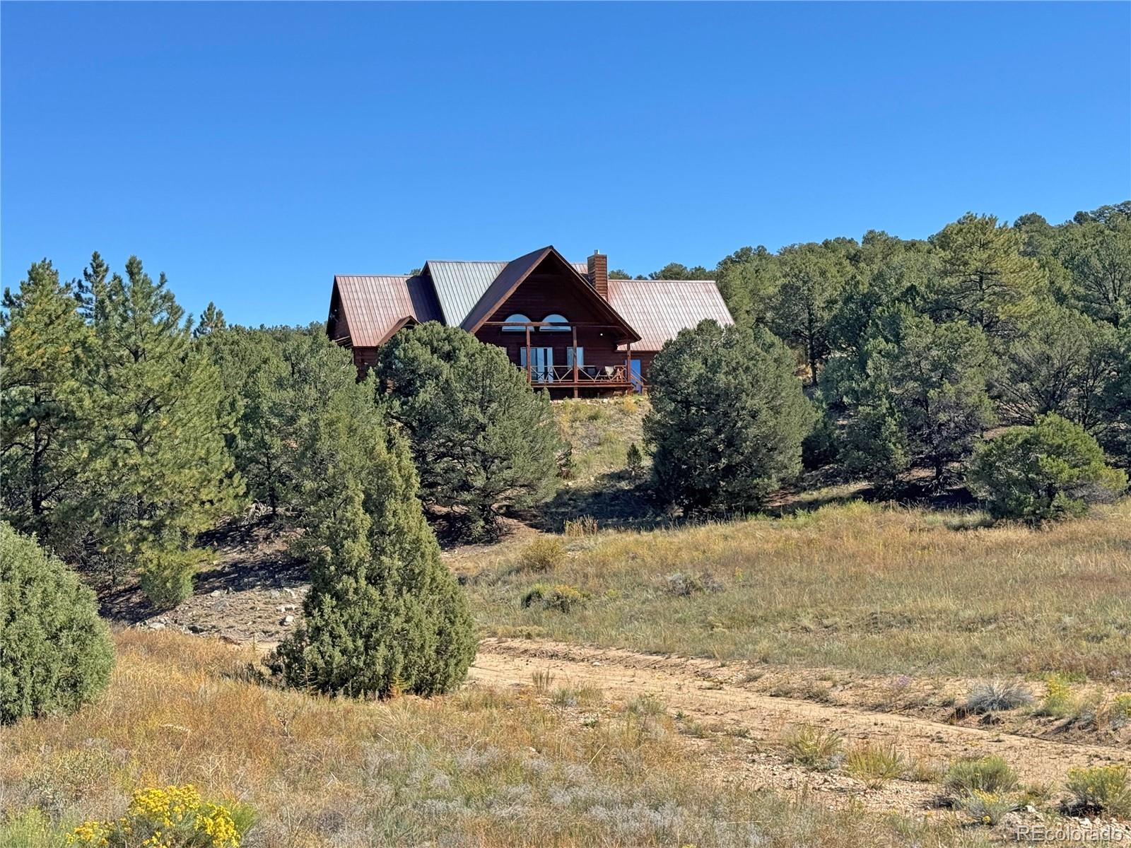 Lucky Horseshoe Ranch- Year round accessible cabin with rolling hills, meadows, seasonal water and mountain views in all directions is located in the desirable Bull Domingo subdivision. Move in condition with perimeter fencing in place for your horses and varied terrain offering natural shelter from the elements. This charming cabin has two bedroom and two and 1/2 baths, newer gas range/oven, refrigerator and dishwasher in the kitchen, a cozy living room with a stone accented gas fireplace and an attached spacious 2 car garage. Primary bedroom on main level has a cozy Vermont Casting stove for warmth, patio doors to deck and ensuite ¾ bath. Upstairs is an open bedroom as well as a full bath location. Covered deck entryway welcomes you to the delightful well -conceived living space and rear deck from patio doors in living room allows for Sangre de Cristo views and the lower meadow for wildlife viewing. Bonus heated studio is just across the driveway for extra space. This 43.71 acre holding is ready for your year round or seasonal occupation.