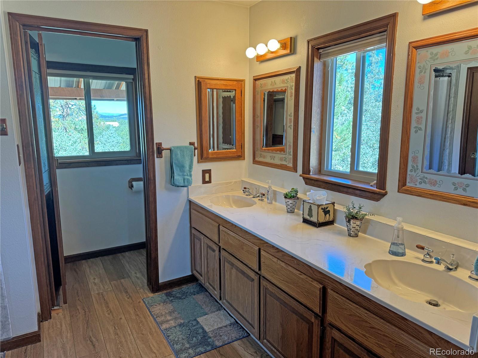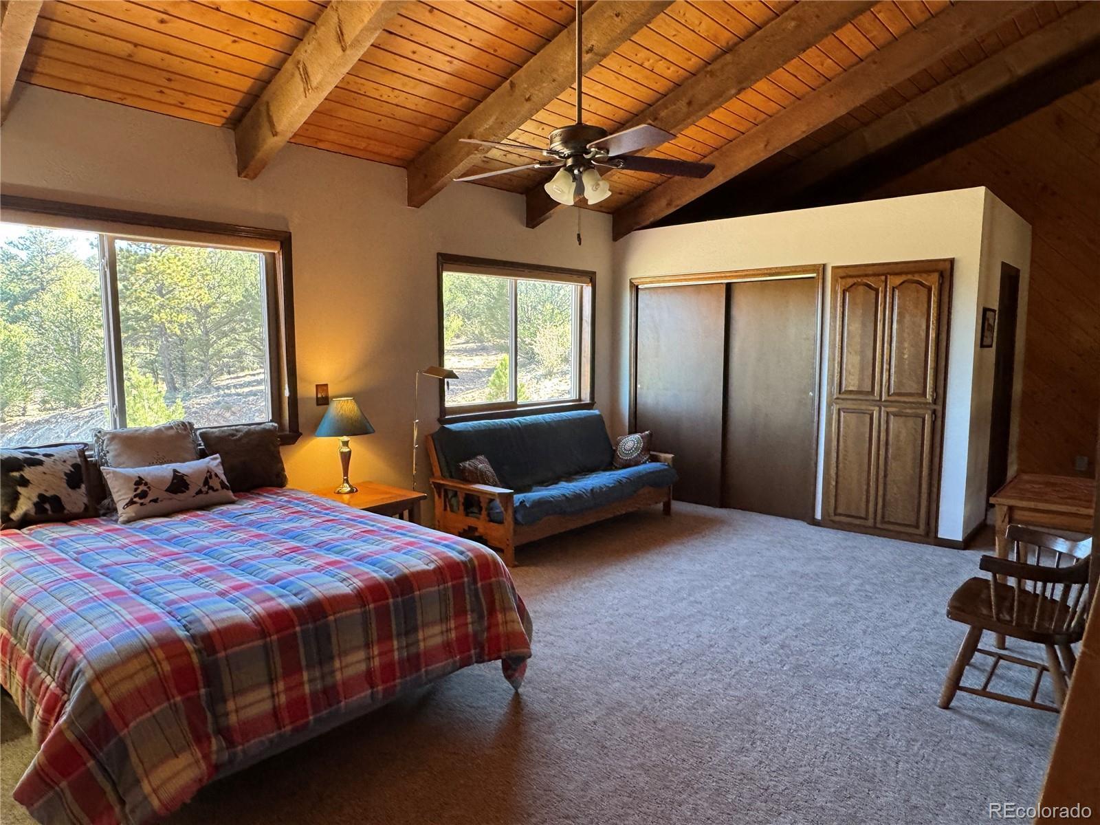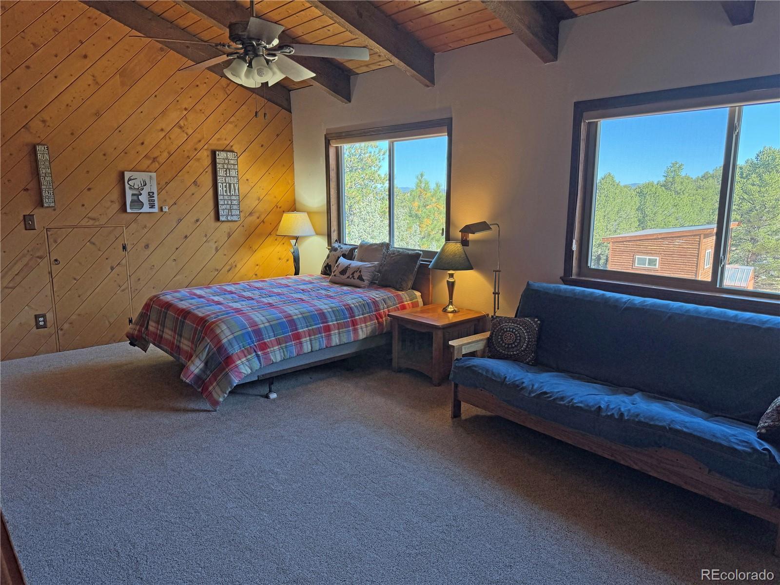 Lucky Horseshoe Ranch- Year round accessible cabin with rolling hills, meadows, seasonal water and mountain views in all directions is located in the desirable Bull Domingo subdivision. Move in condition with perimeter fencing in place for your horses and varied terrain offering natural shelter from the elements. This charming cabin has two bedroom and two and 1/2 baths, newer gas range/oven, refrigerator and dishwasher in the kitchen, a cozy living room with a stone accented gas fireplace and an attached spacious 2 car garage. Primary bedroom on main level has a cozy Vermont Casting stove for warmth, patio doors to deck and ensuite ¾ bath. Upstairs is an open bedroom as well as a full bath location. Covered deck entryway welcomes you to the delightful well -conceived living space and rear deck from patio doors in living room allows for Sangre de Cristo views and the lower meadow for wildlife viewing. Bonus heated studio is just across the driveway for extra space. This 43.71 acre holding is ready for your year round or seasonal occupation.