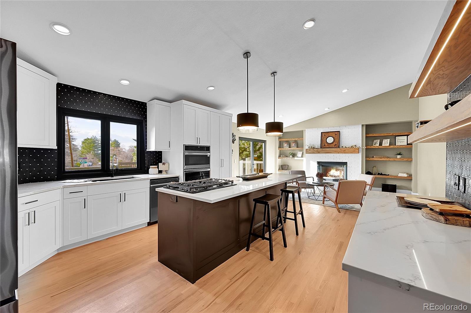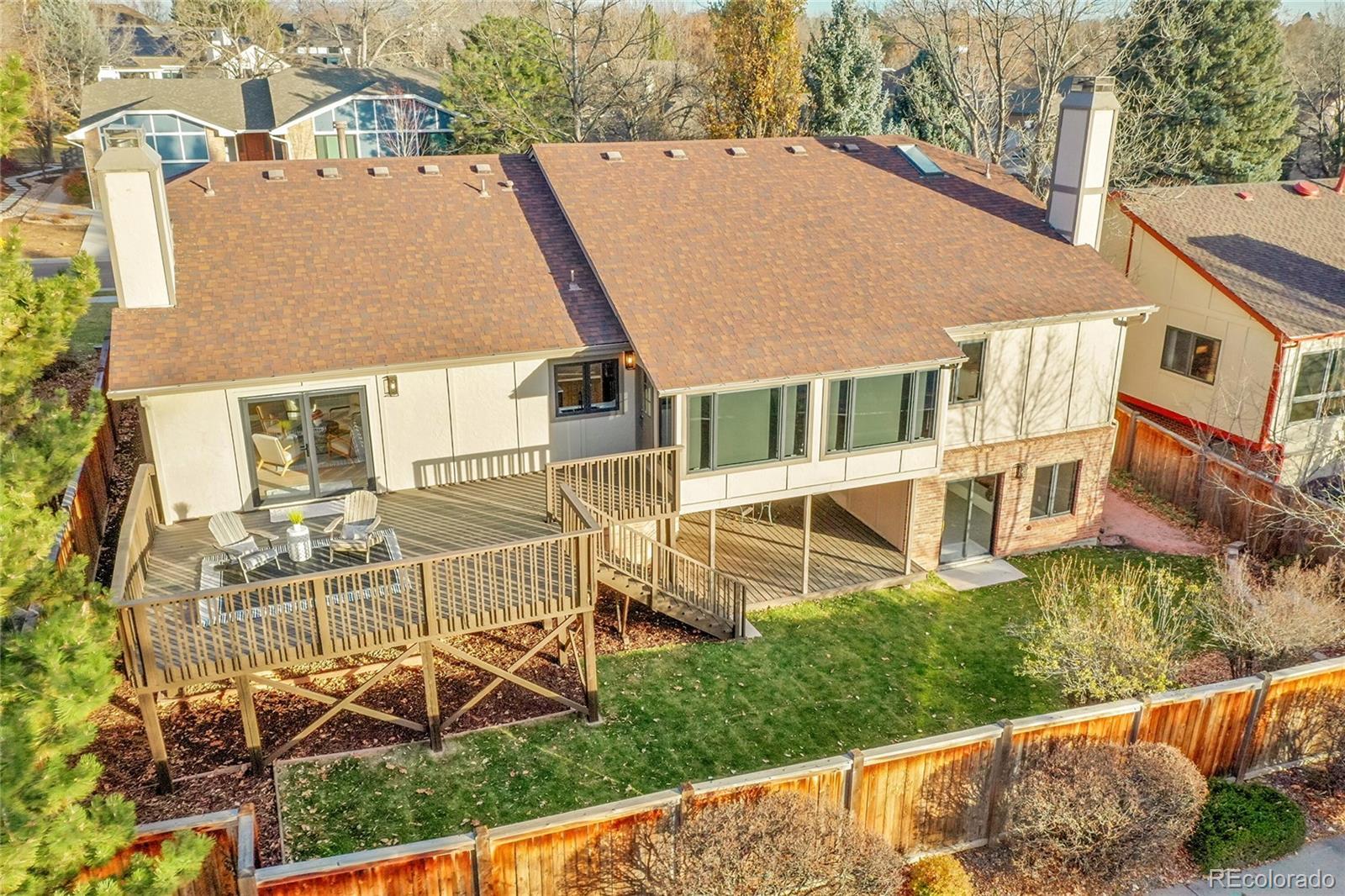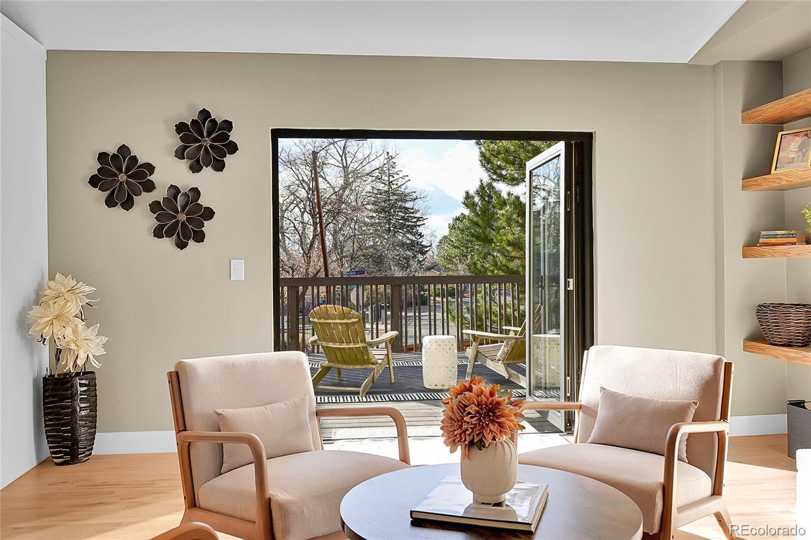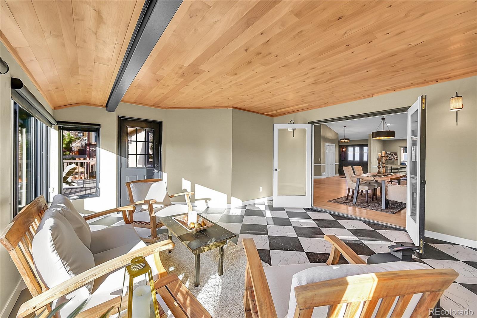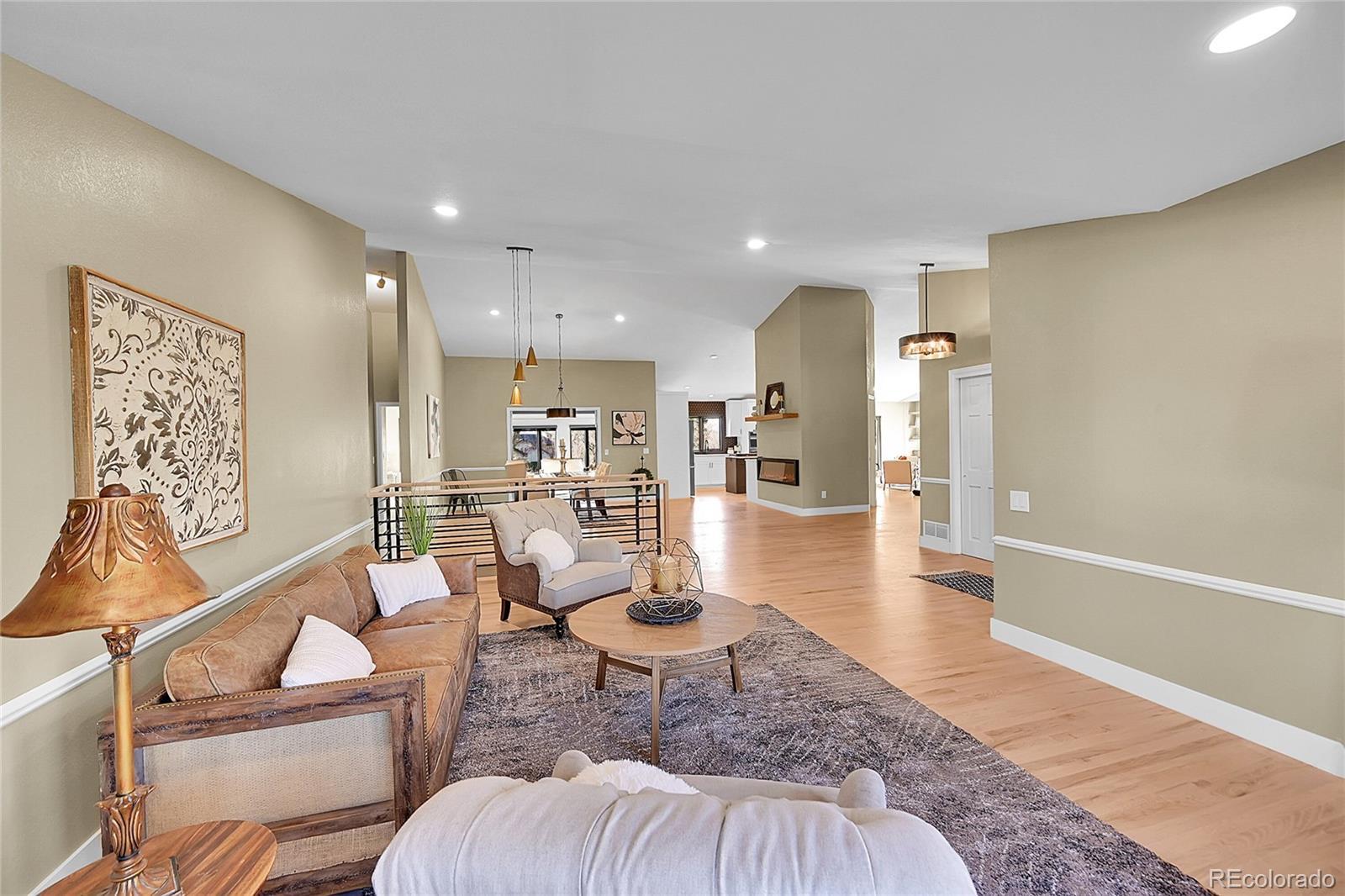 Welcome to this charming remodeled home situated in the Sundown Ridge community of Littleton. This ranch-style home boasts over 4,600 total square feet and features 5 bedrooms, 4 bathrooms, making it an ideal fit for a variety of living arrangements. Upon entering, you are welcomed by a grand foyer adorned with light-stained oak wood flooring with a beautiful wrought iron and wood staircase. The open-concept layout integrates the living room, dining area—which features an electric fireplace for added warmth and charm & a bright sunroom that showcases a beautiful knotty alder ceiling paired with striking black and white luxury vinyl tile flooring. The sunroom is bathed in natural light from its large windows, equipped with sun screens to ensure comfort during sunny days, truly the perfect spot for relaxation. The kitchen has custom white cabinetry, a spacious island, double ovens equipped with a microwave and air fryer, and a breakfast bar w/ stylish shelving above w/ under-cab lighting for a warm touch. Adjacent to the kitchen, the family room is anchored by a wood-burning fireplace & showcases a panoramic stacking door that opens up to west-facing views, enhancing the home’s connection to the outdoors. The walk-out basement adds versatility to the home, featuring two additional bedrooms—one is non-conforming room with a walk-in closet. This expansive basement includes multiple seating areas and boasts a wet bar with butcher block counters and a beverage center, creating an ideal space for entertaining or activities like pool or game nights. The main floor laundry room conveniently located off of the garage entrance features ample shelving, & butcher block counters. This charming home offers easy access to parks, the Highline Canal, Littleton Public Schools—truly a wonderful place to call home.